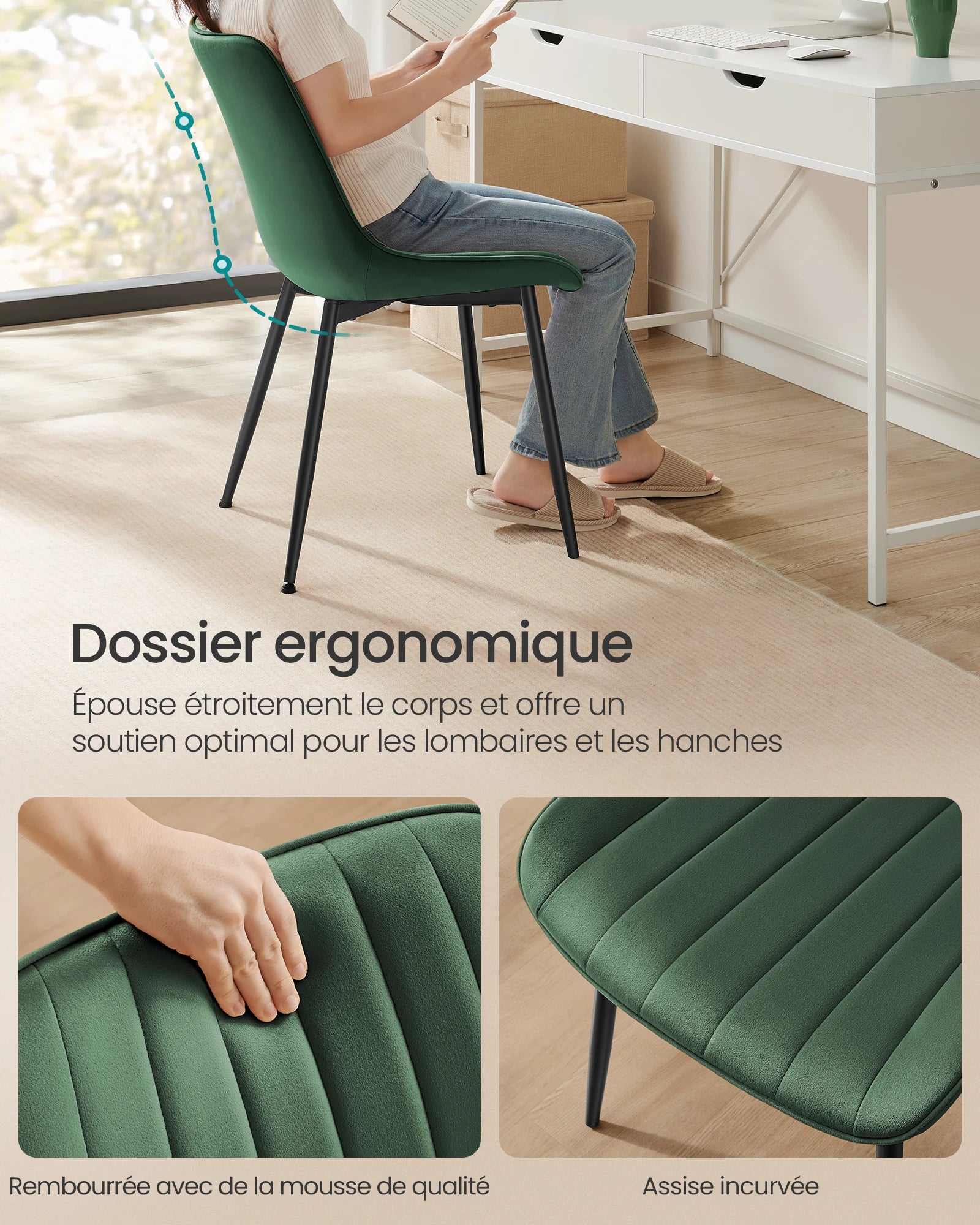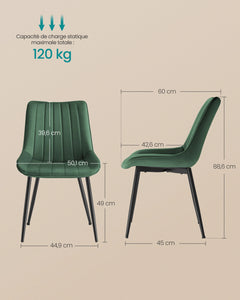 Confort : La conception ergonomique,les coussins rembourrés en mousse d’une épaisseur de 6,3 cm et les pieds de chaise en métal robustes peuvent supporter jusqu’à 120 kg et rendent ces chaises de cuisine stables et confortables. De plus,la combinaison de vert et de noir ajoute une touche d’élégance à votre maison.