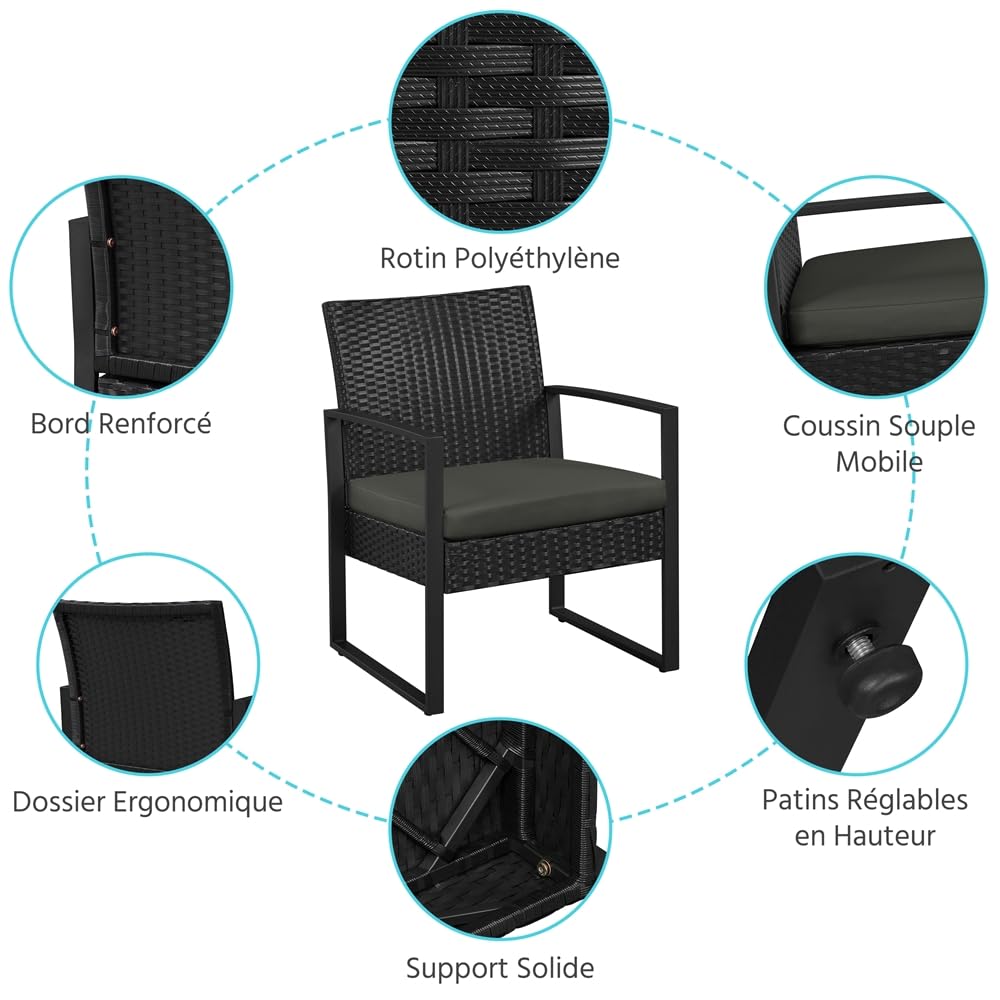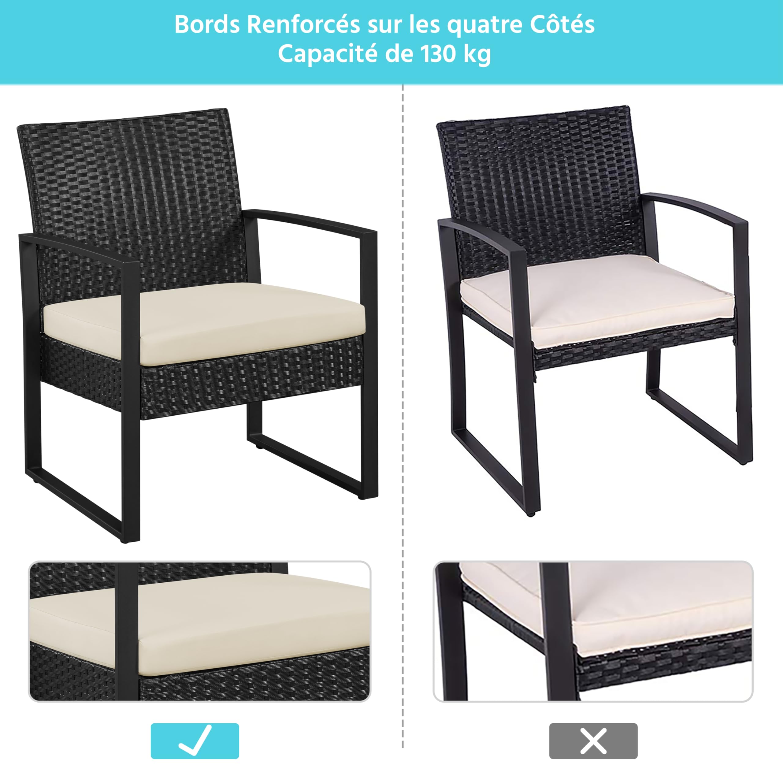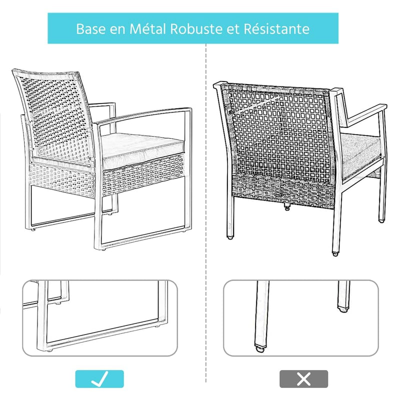 - Structure stable avec renforcement : Notre salon de jardin en rotin intègre une structure intégrée, croisée en bas pour un support renforcé. La table de jardin comprend aussi un renfort pour relier les deux cadres latéraux en une intégration