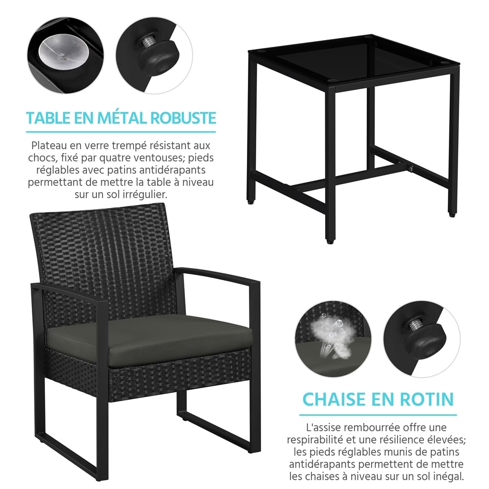 - Plateau de table à ventouses : La table de jardin dispose d'un plateau résistant en verre trempé, solidement ancré au cadre à l'aide de quatre ventouses robustes. Un design esthétique et fonctionnel qui renforce la sécurité et la stabilité de la table