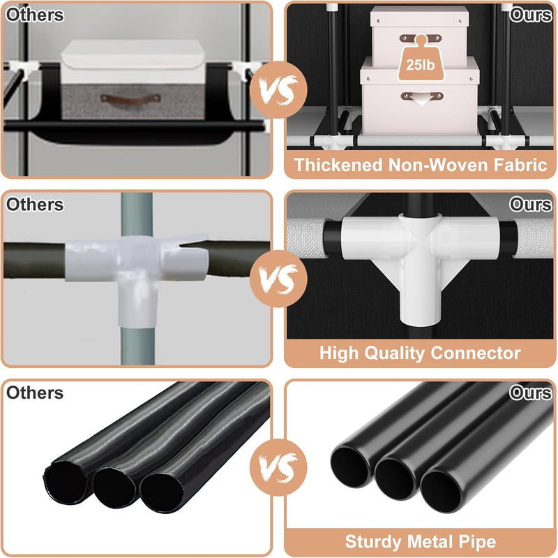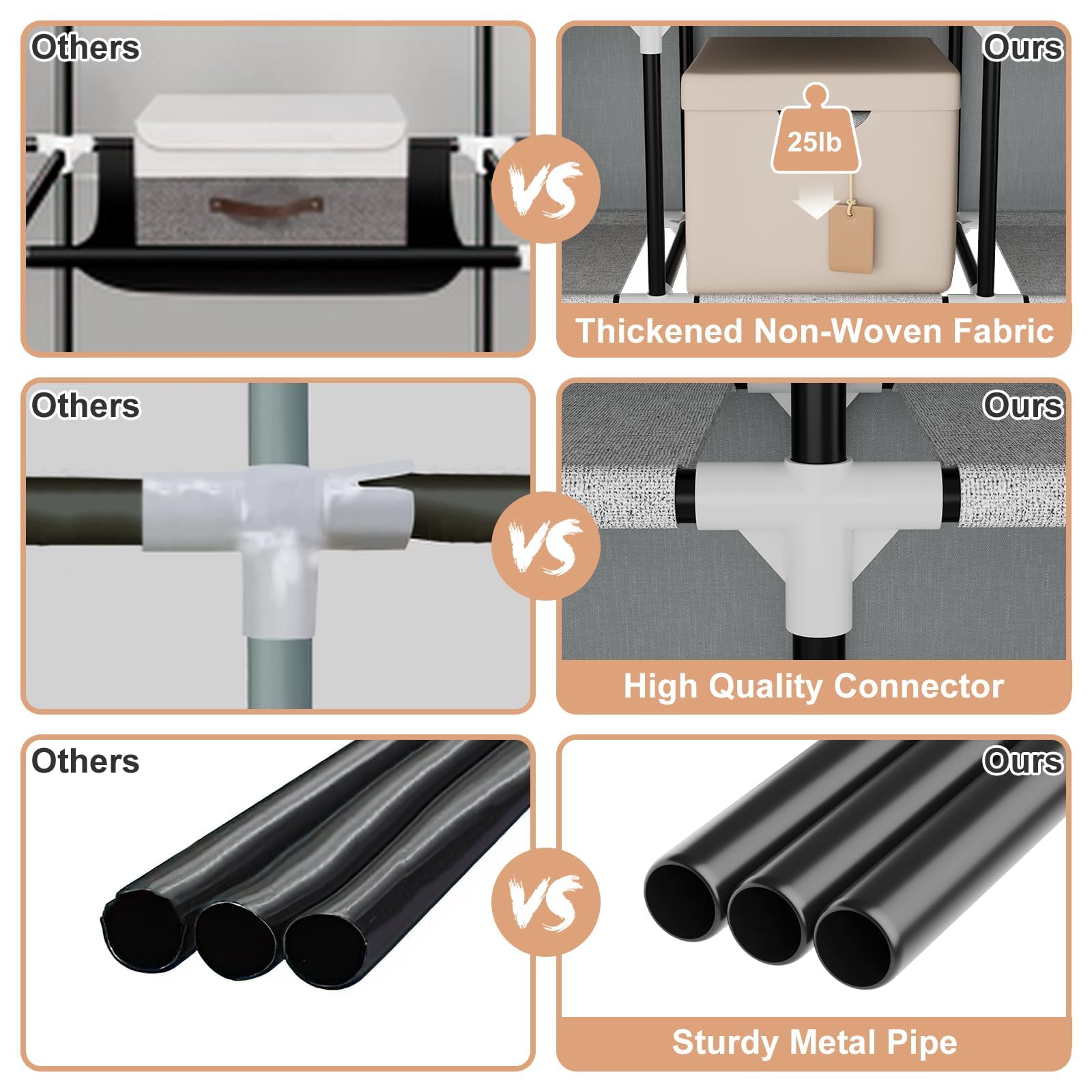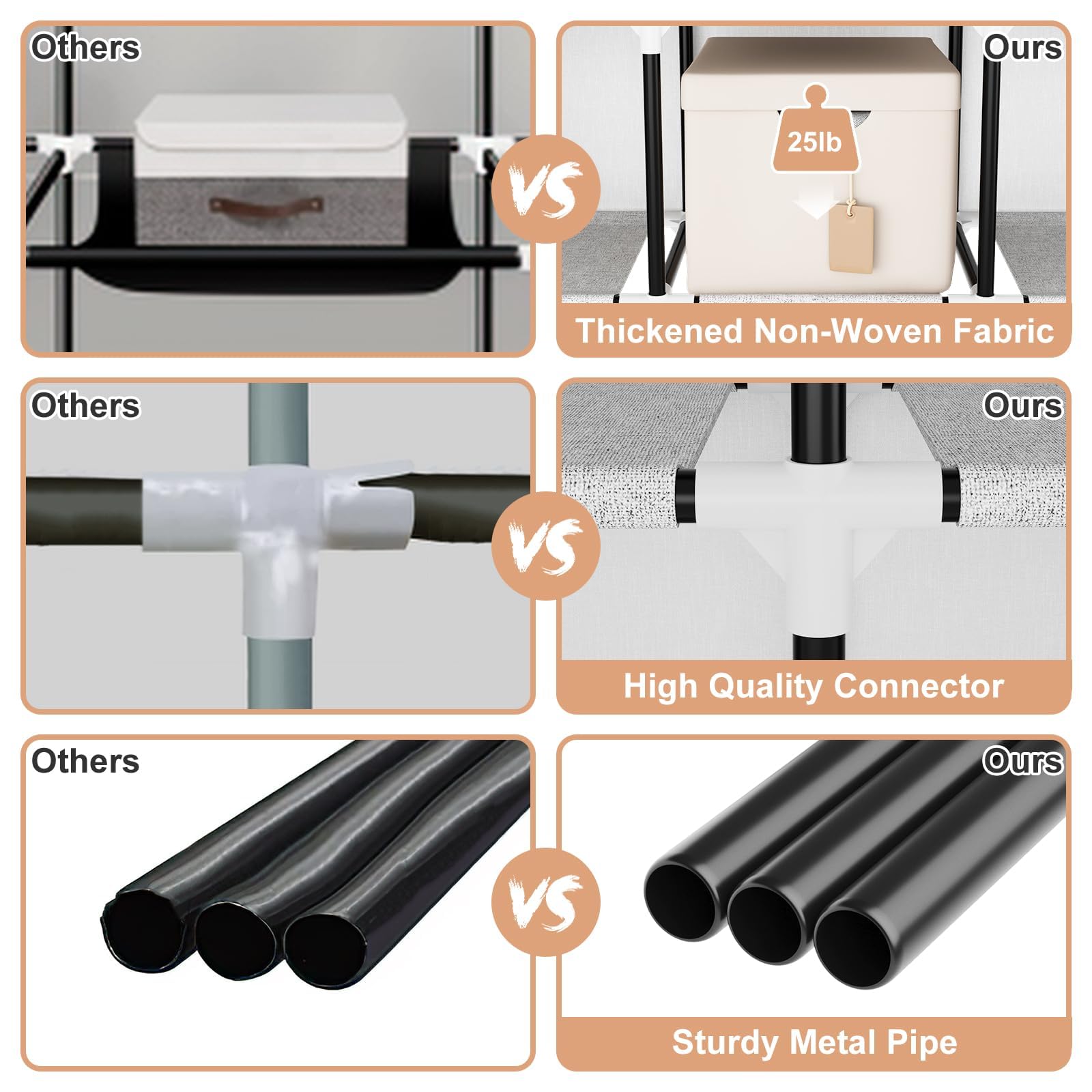 - Armoire en tissu stable : cette armoire en métal est composée de tubes métalliques d'un diamètre de 0,6 pouces, de connecteurs en plastique renforcés et de tissus non tissés de qualité supérieure, ce qui garantit que la garde-robe haute est robuste et durable et répond à vos besoins de rangement à long terme. La tringle à vêtements peut supporter jusqu'à 33 livres et chaque étagère pèse 15 livres et offre ainsi un maintien ferme pour vos vêtements.
