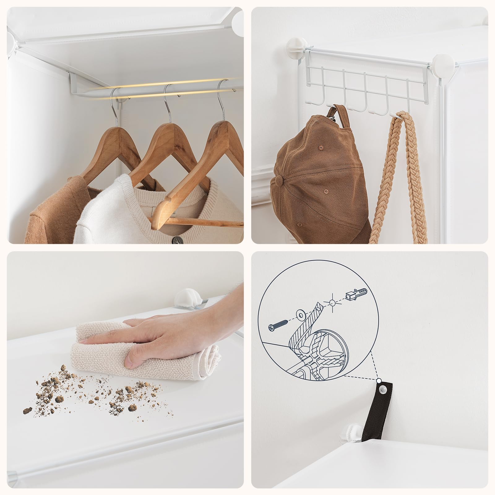 - Durabilité et propreté : La conception avec portes bloque efficacement la poussière, de plus, les plaques en PP de qualité sont imperméables, résistantes à l’humidité et faciles à nettoyer, protégeant ainsi mieux vos vêtements