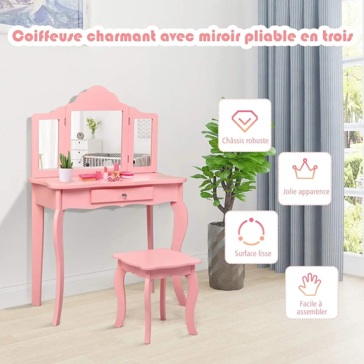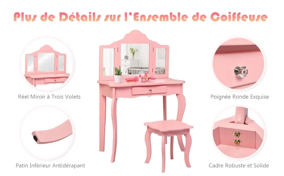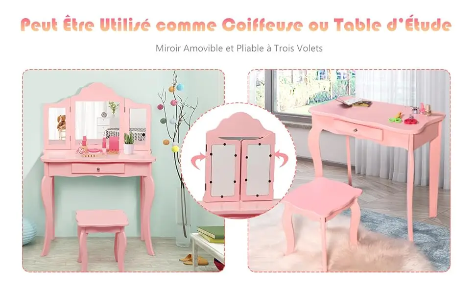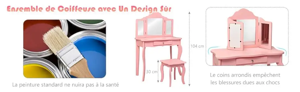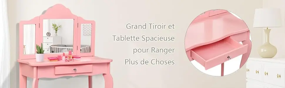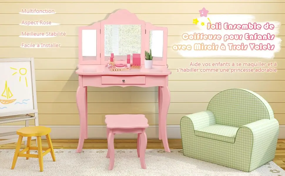 【Easy to assemble and clean: 】 Our dressing table is very easy to install thanks to detailed instructions and accessories, in a short time. Your child can help you build it. The furniture cleans just with a damp cloth.