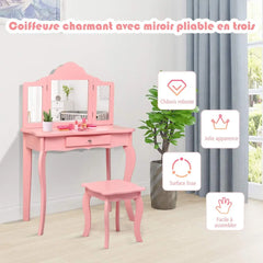 【Foldable mirror and large drawer: 】 Two sections of the mirror can be opened or closed by aligniting in the middle pan. It is easy to adjust the angle of the mirror according to needs. Equipped with a large drawer, the furniture allows your child to store their makeup accessories and develop good storage habits.