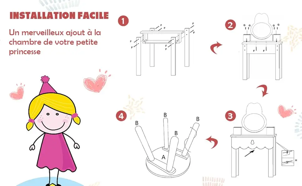【Multiple-purpose furniture set 2 in 1 :】 The table serves as a dressing table, but can also serve as a desk. It is enough for this to remove the upper part with mirror. Its pink and white colors as well as its neat and cute patterns will make it a practical and fun complement to a child's bedroom or a games room.
