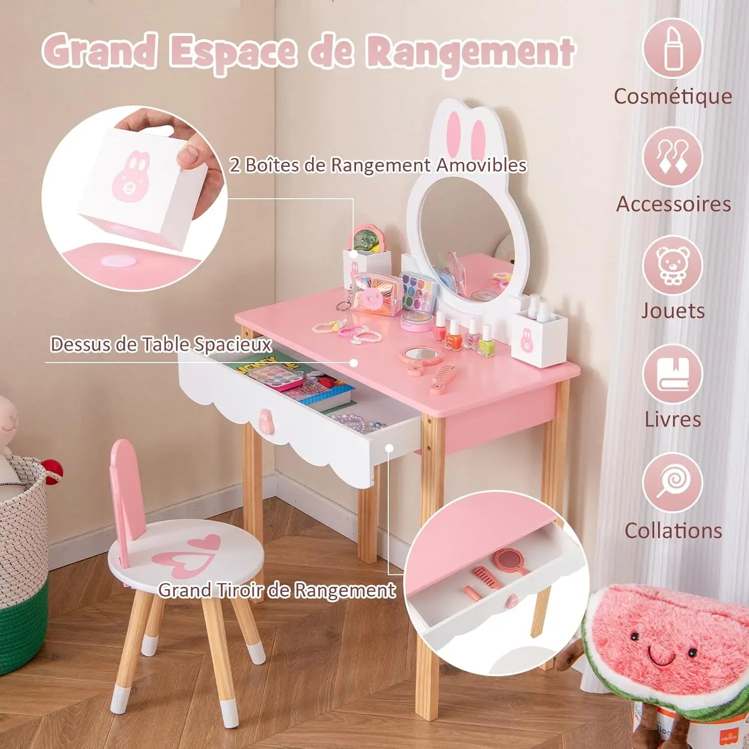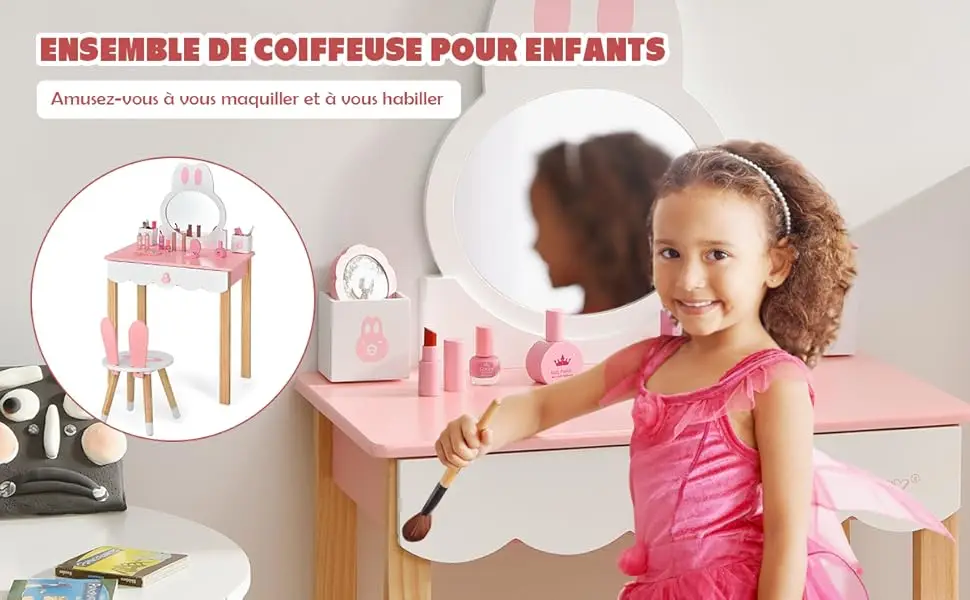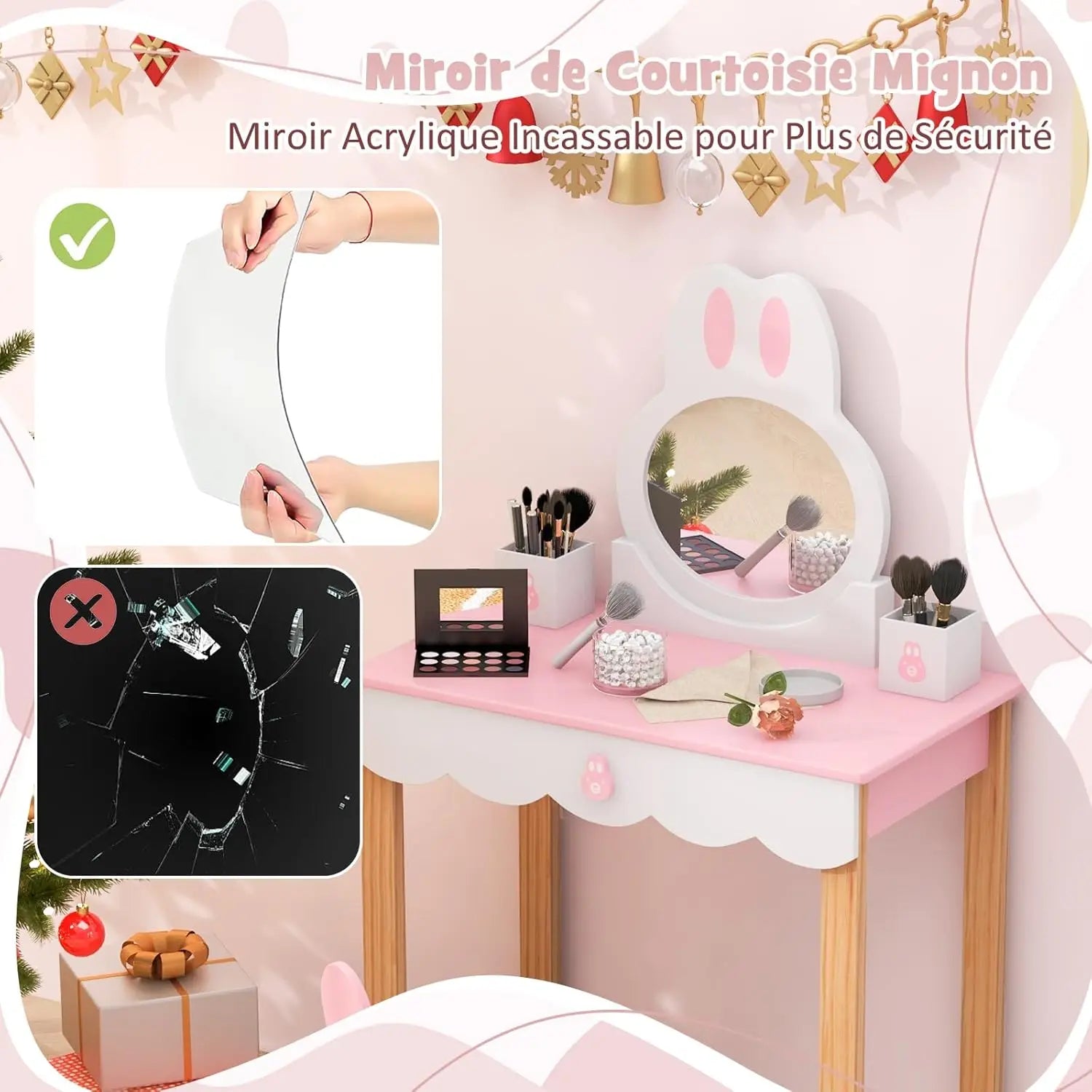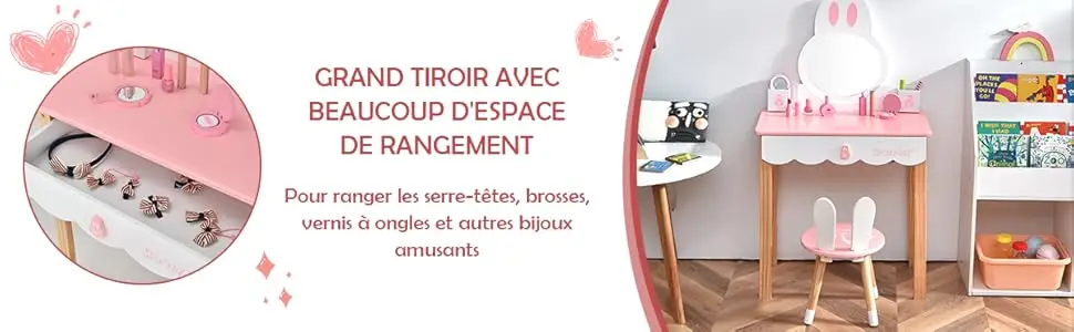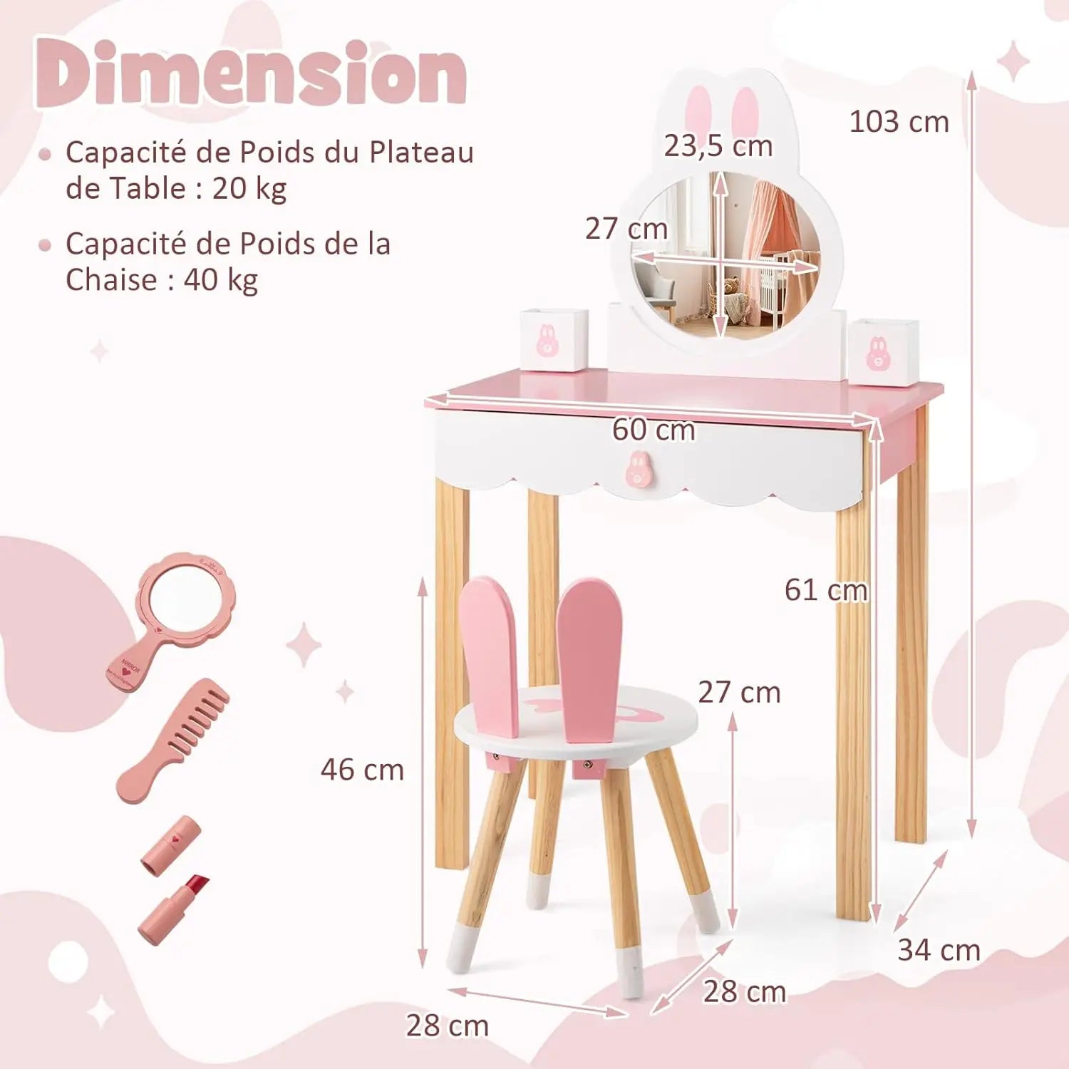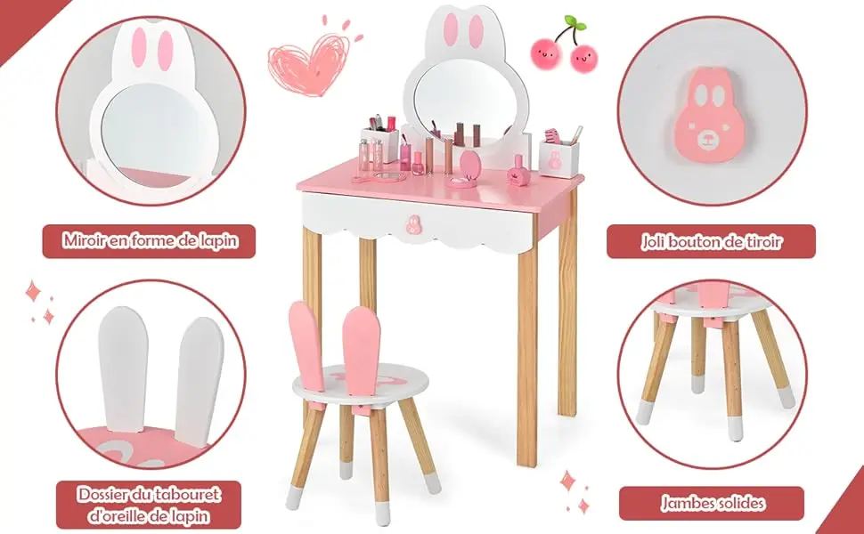 【Genuine rabbit and mirror Pattern: 】 The mirror as well as the chair folder have rabbit ears, so as to bring a cute touch to the bedroom of your child. The large mirror perfectly reflects his face, allowing him to check his make-up and hairdressing in a practical way.