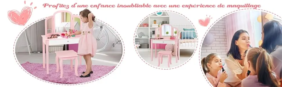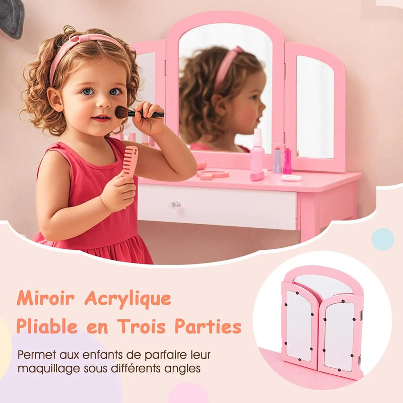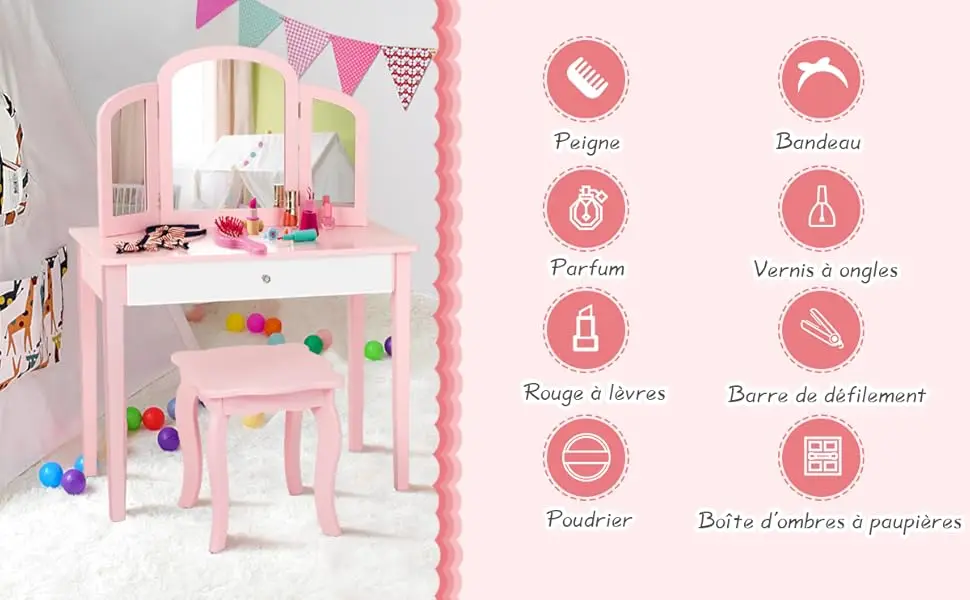 【Foldable mirror and large drawer 】 Foldable mirror allows children to observe their make-up and hairdressing from different angles. The make-up, brushes and toys can be stored in the large drawer.