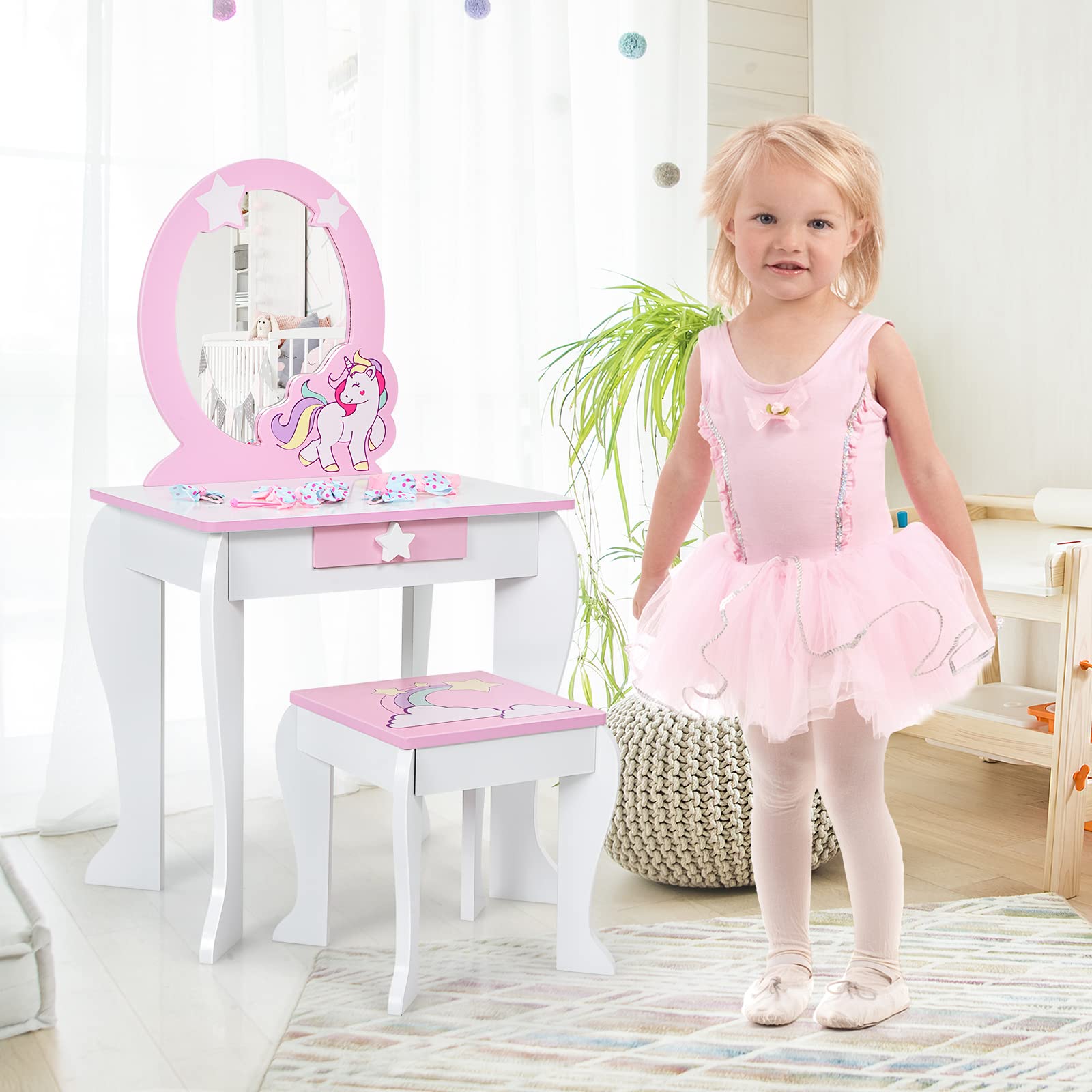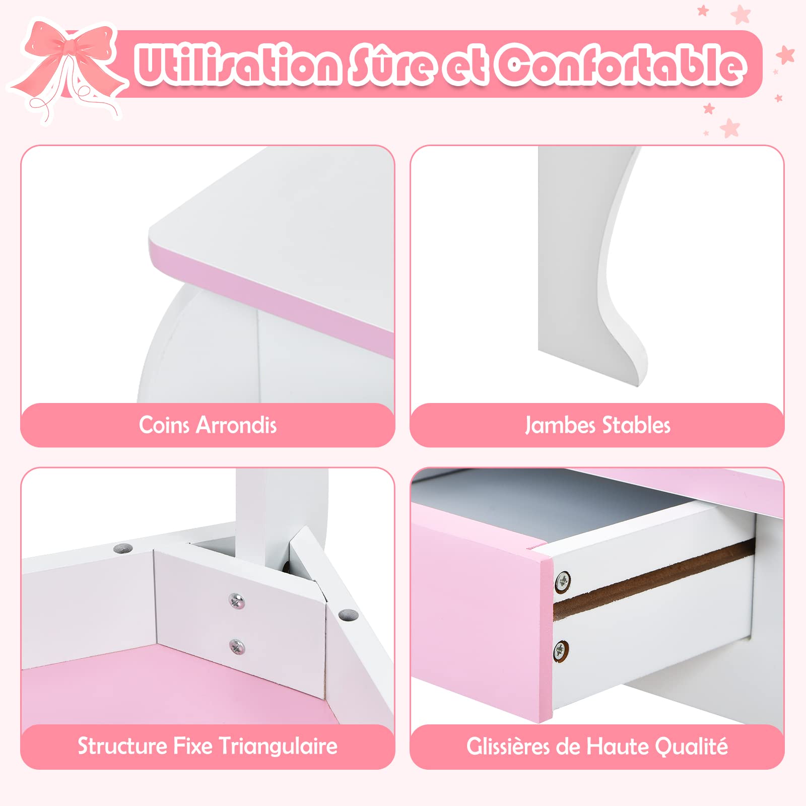 - 💖Coiffeuse enfant fille sûre : Notre coiffeuse a une surface lisse qui ne rayera pas la peau de votre enfant. Les bords de table sont arrondis pour éviter de heurter votre enfant. Le matériau est du bois de haute qualité. C’est sûr et inoffensif. Vous pouvez l'utiliser pour votre enfant sans crainte.