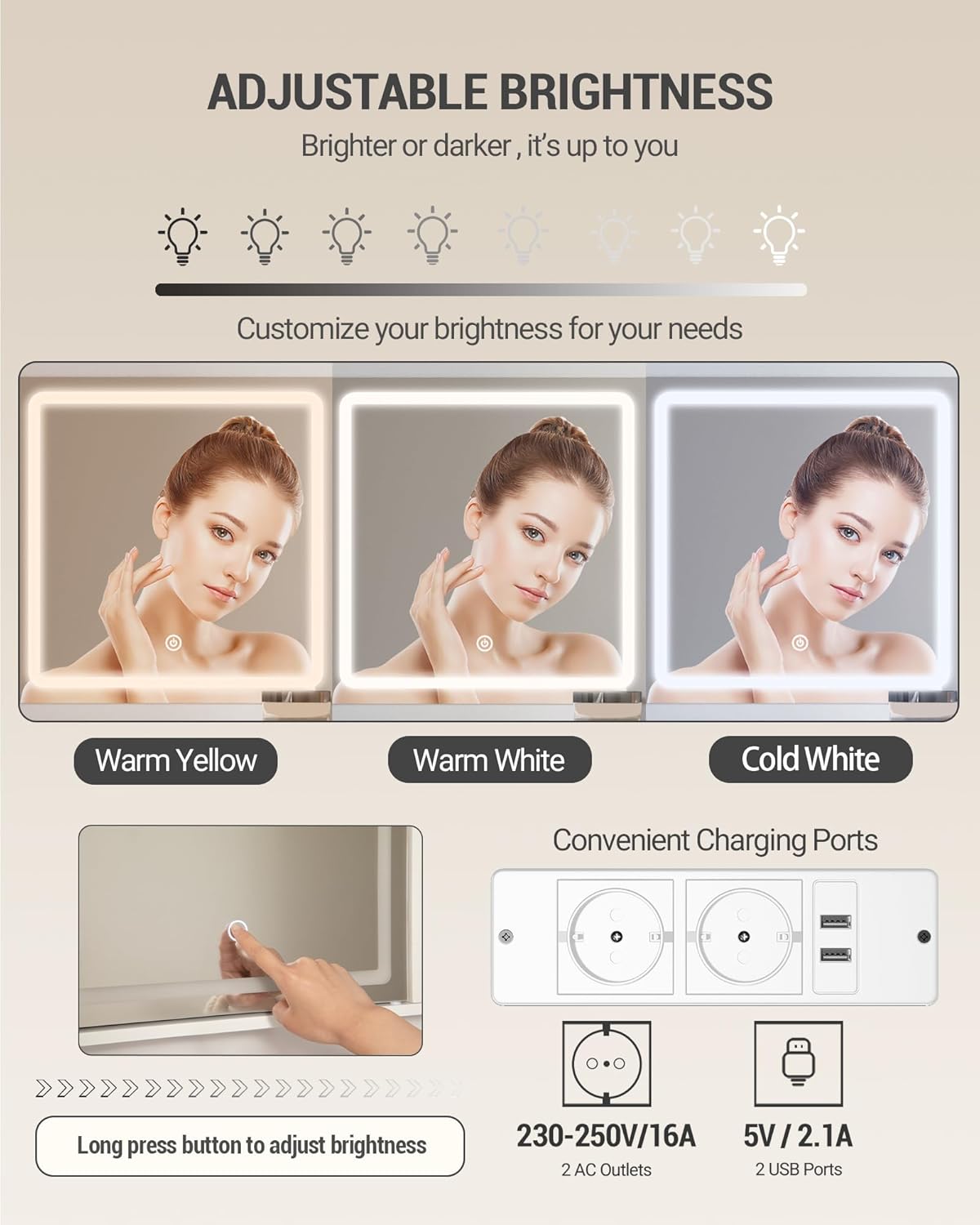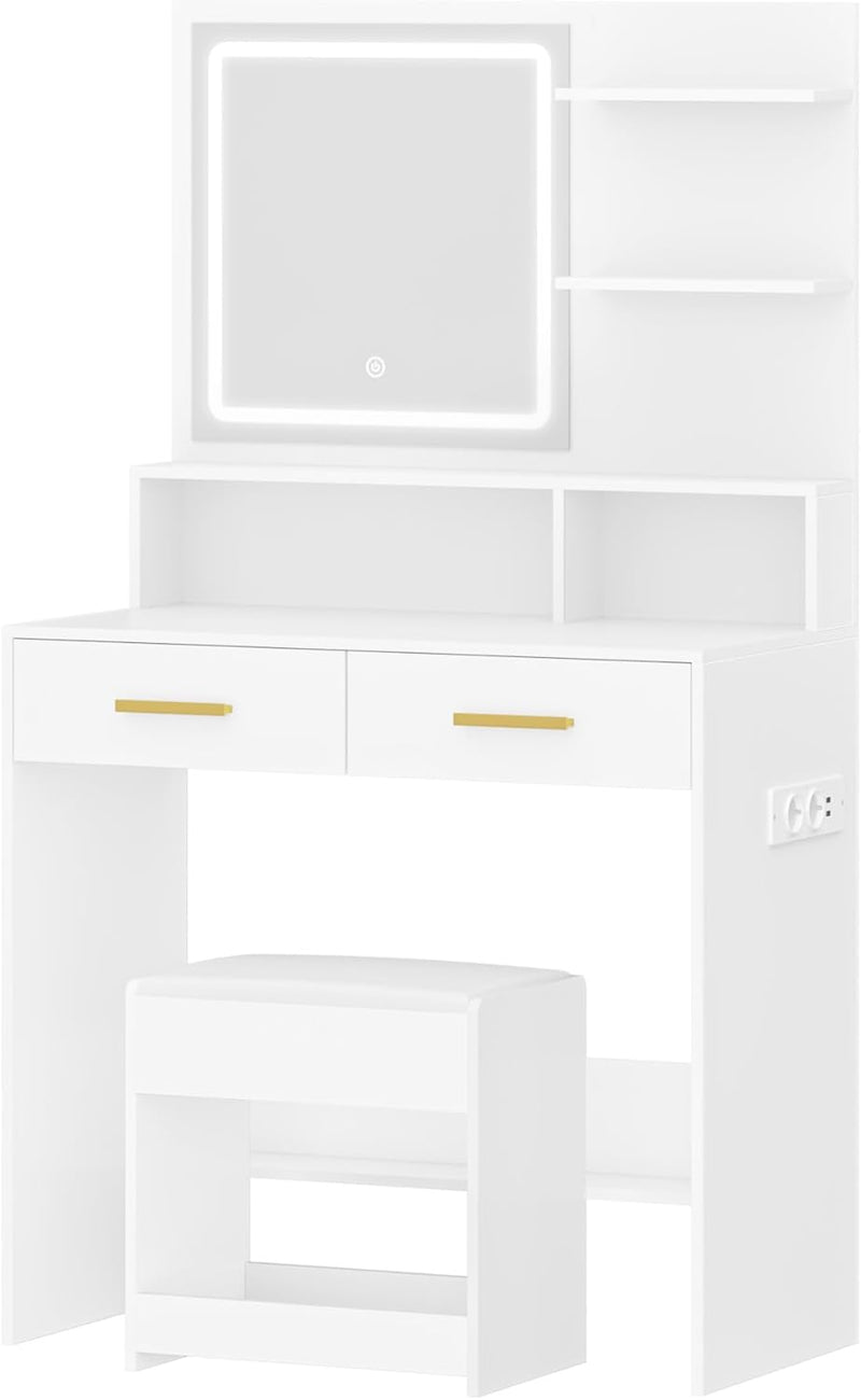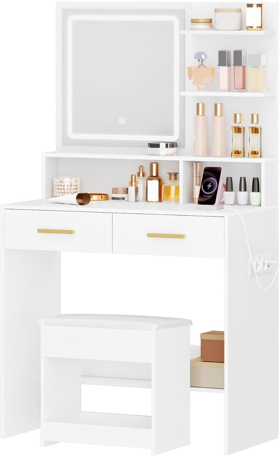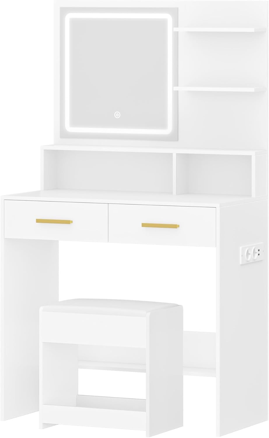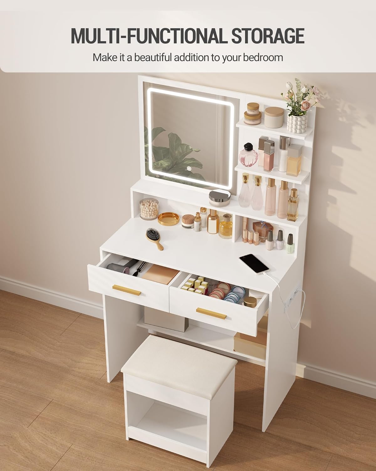 - 【Charging Plug】The dressing table is equipped with a power supply (2 sockets and 2 USB ports), which is convenient to charge your mobile phone or plug in beauty devices such as hair dryer. This design allows you to achieve the perfect combination with technology while you are applying makeup.