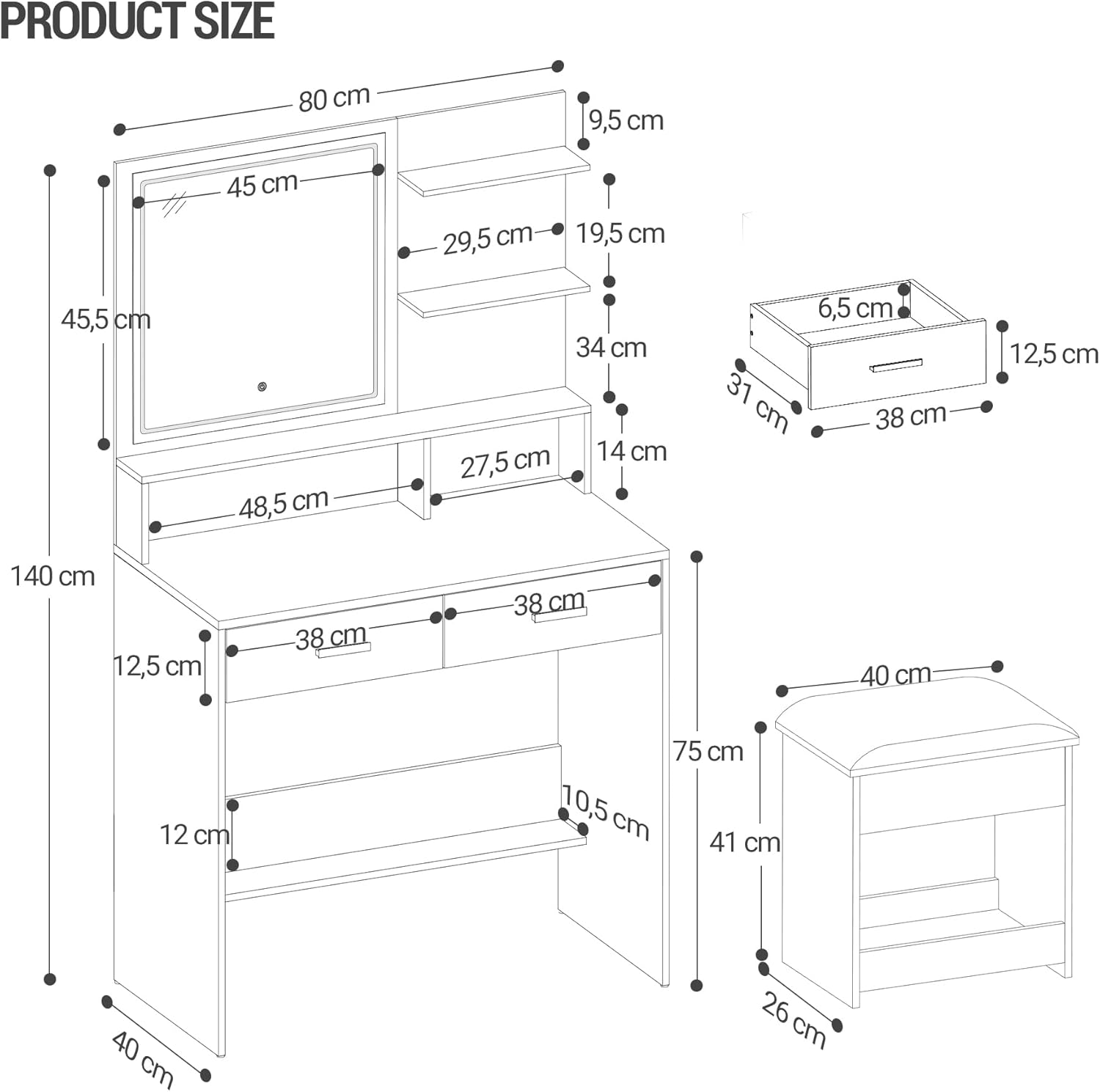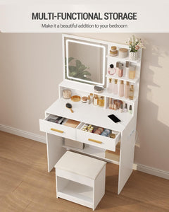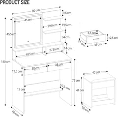 - 【Soft and Comfortable Stool】This dressing table also comes with a soft makeup stool. You can sit comfortably on it, which allows you to enjoy optimal comfort during makeup. Storage space is also provided under the stool! You can store small items that you do not use often, which is both convenient and space-saving.