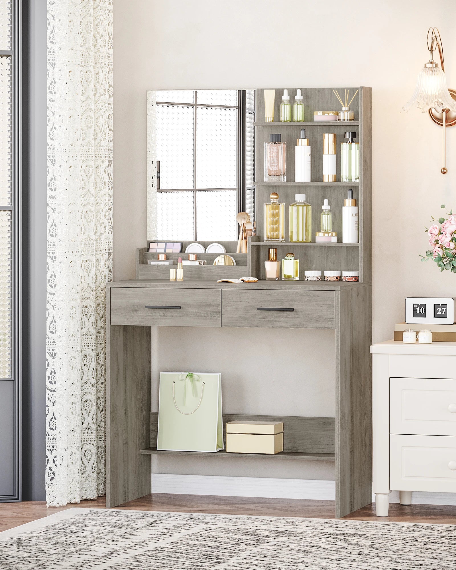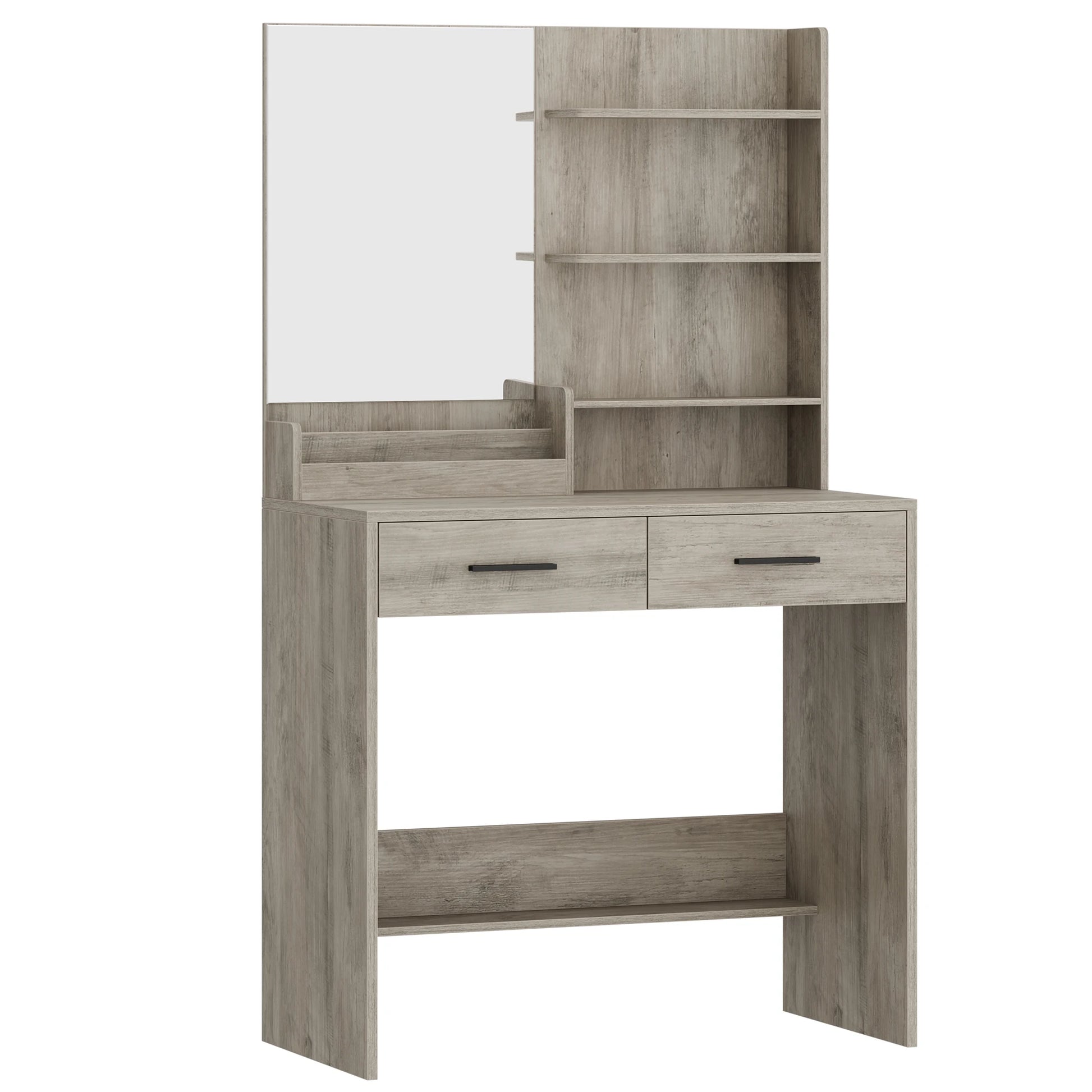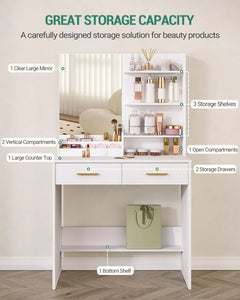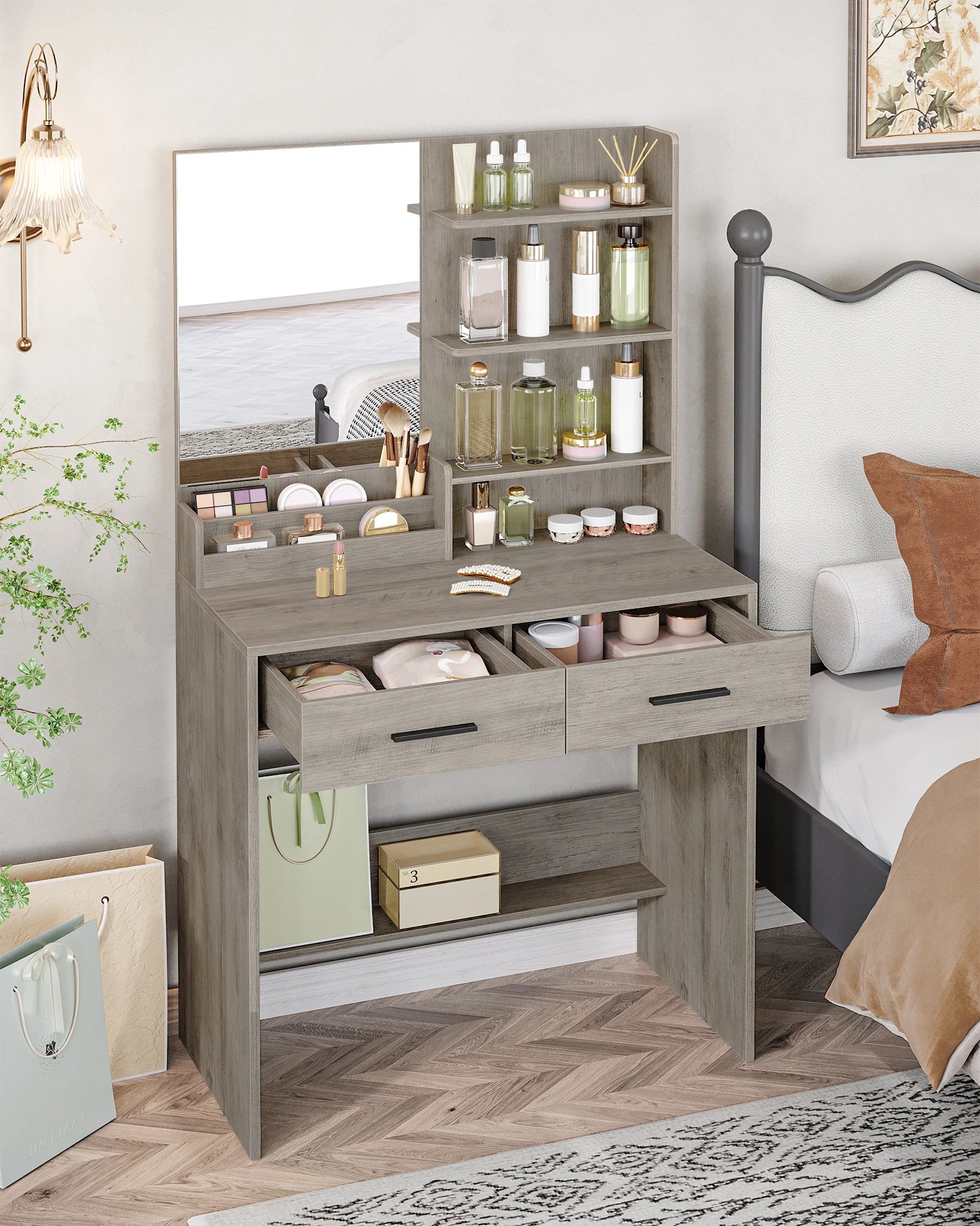 Plenty of Storage Space The storage space on the countertop and table has different sizes and shapes to meet the different storage needs of the user. 2 drawers and 4 open shelves of the dressing table provide enough storage space for cosmetics, hair dryers, jewellery and other beauty essentials. In addition, the lower support plate of the chest of drawers provides additional storage areas for bags.