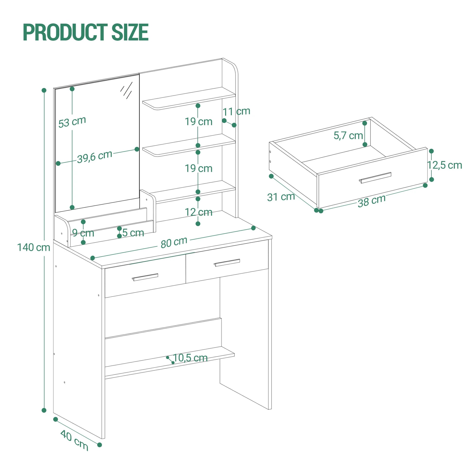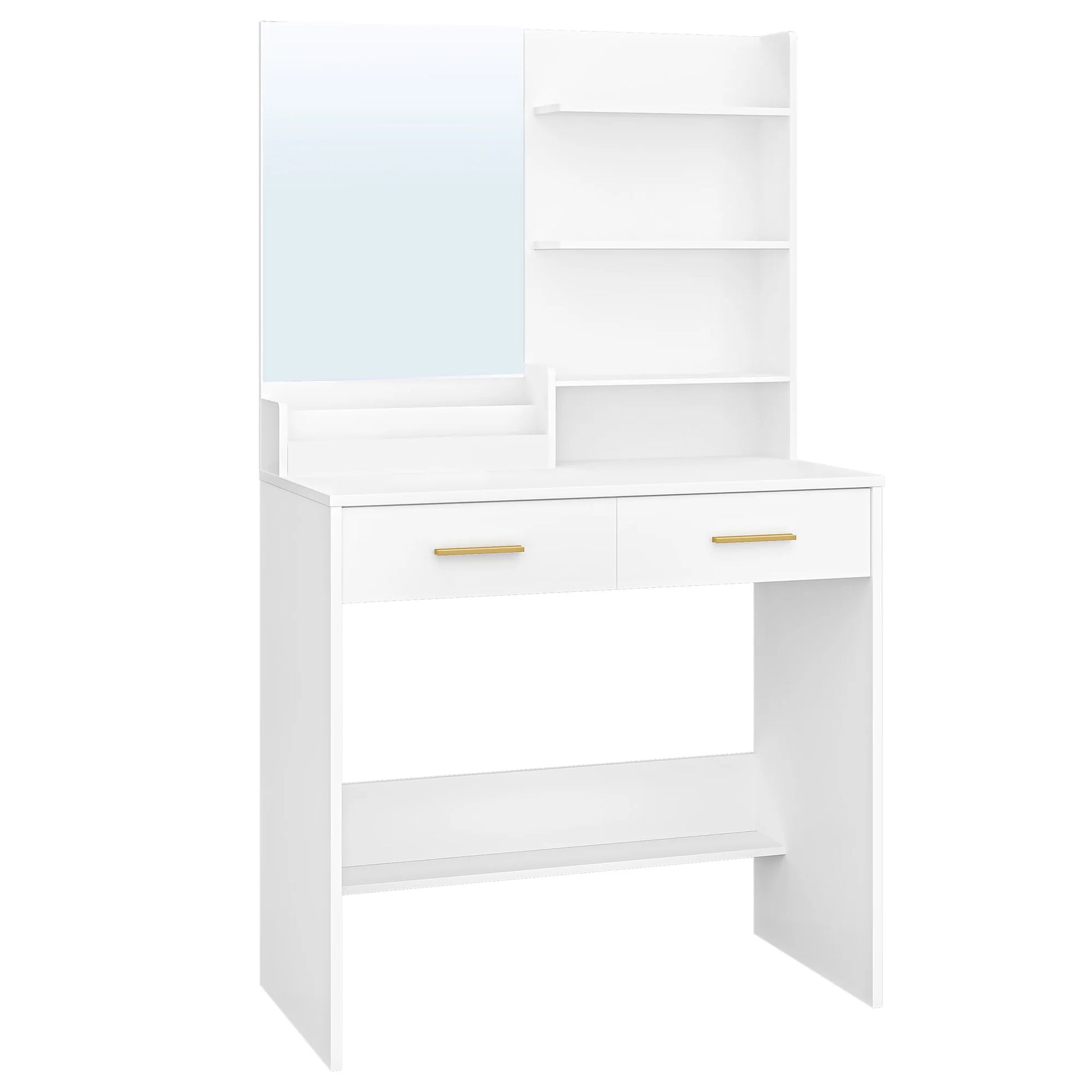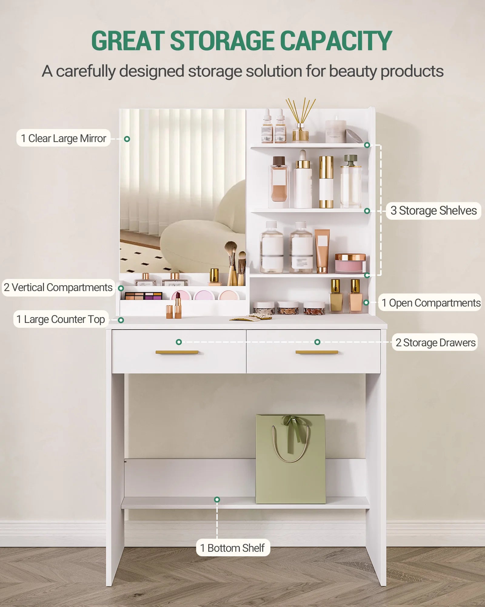 Plenty of Storage Space The storage space on the countertop and table has different sizes and shapes to meet the different storage needs of the user. 2 drawers and 4 open shelves of the dressing table provide enough storage space for cosmetics, hair dryers, jewellery and other beauty essentials. In addition, the lower support plate of the chest of drawers provides additional storage areas for bags.