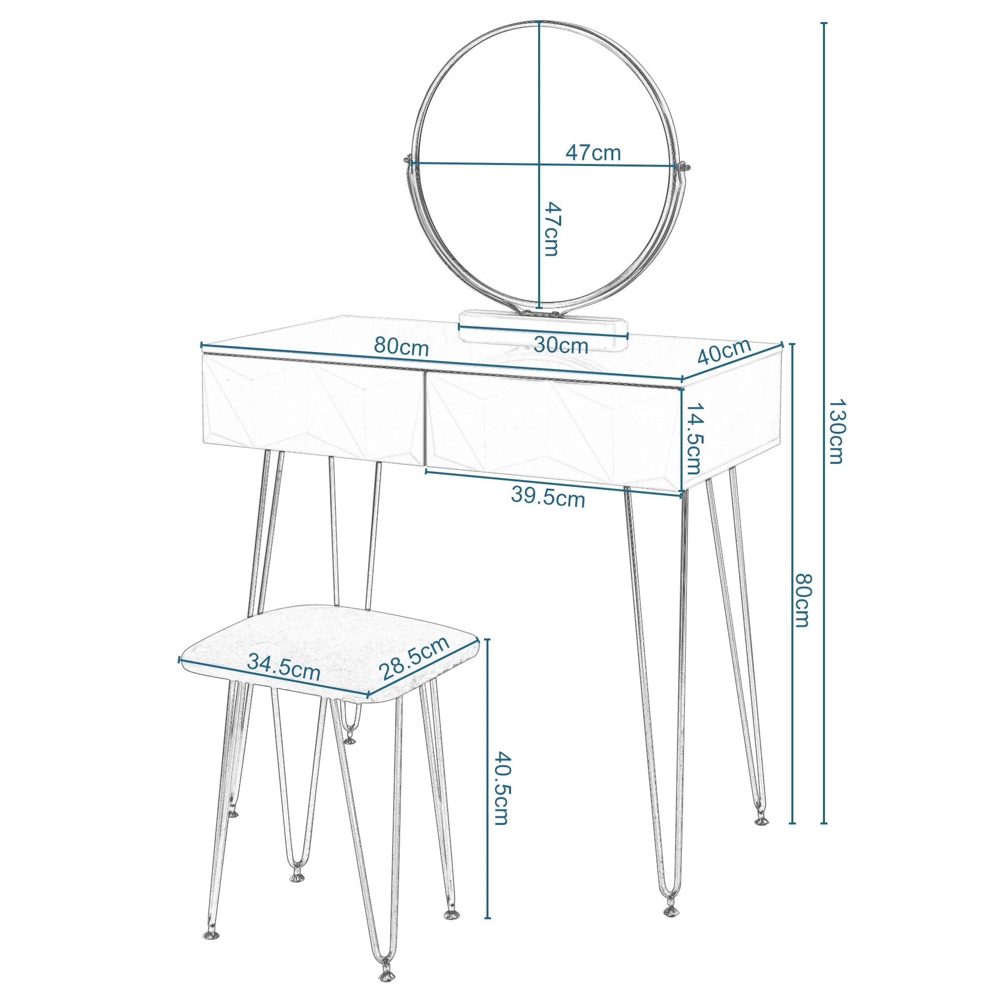 Dressing table and desk: 38 x 80 x 80 cm (W x H x L) large table is equipped with 2 drawers. The simple integrated table can be easily used as a dressing table or work table. A vanity stool with a soft velvety seat is included, so you don't have to waste time searching for a suitable stool. With its compact design, the set can be placed in any room to save space