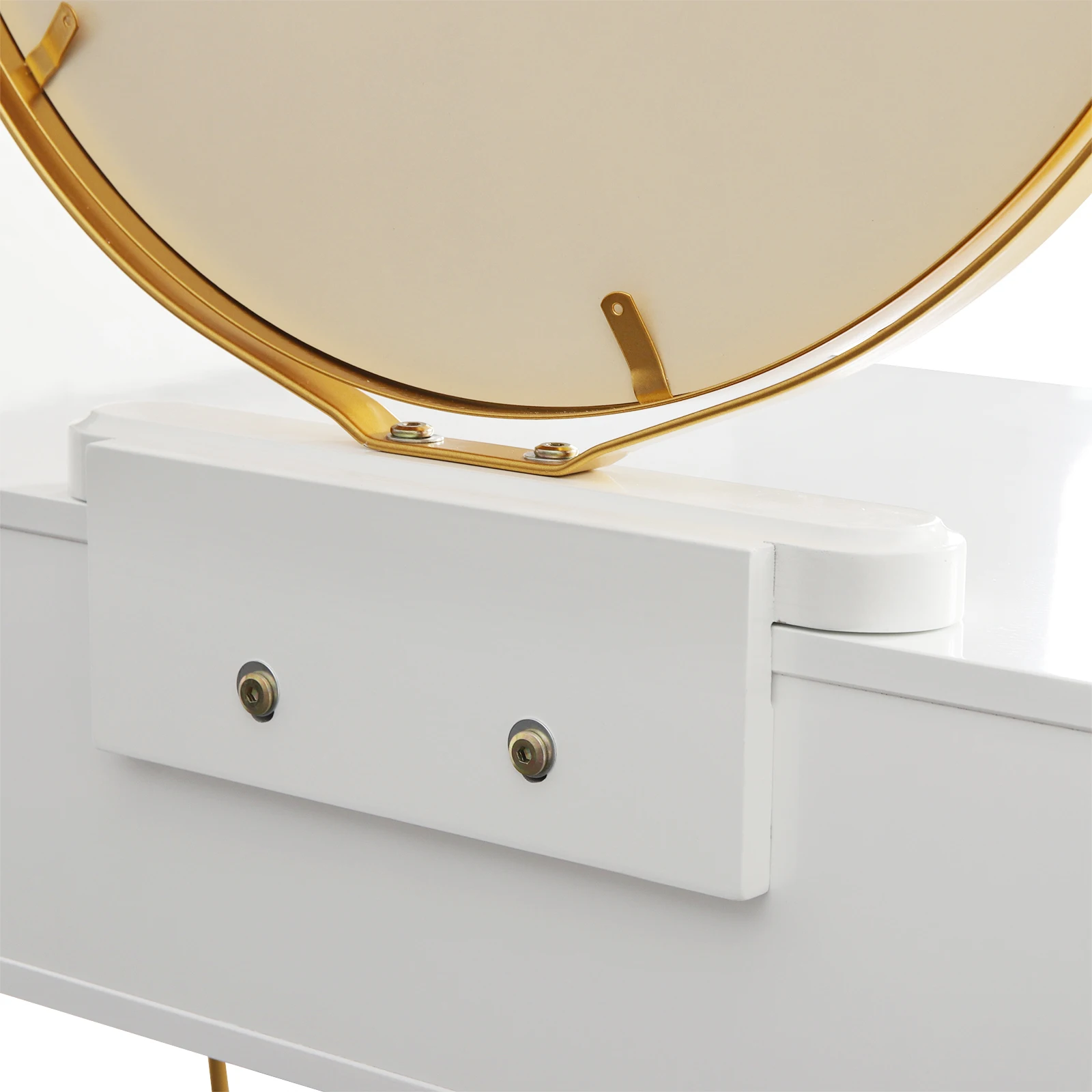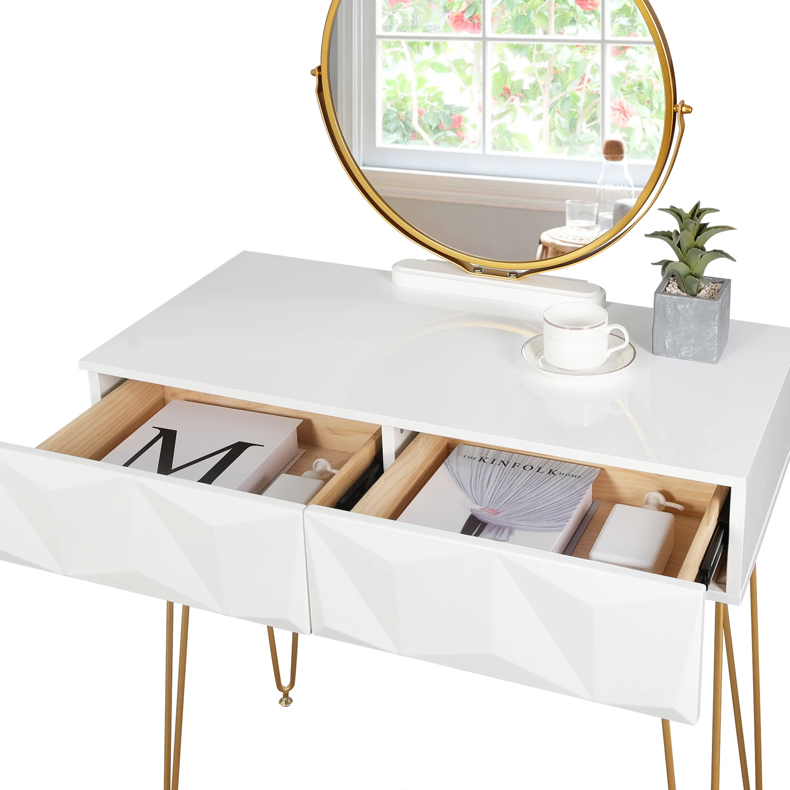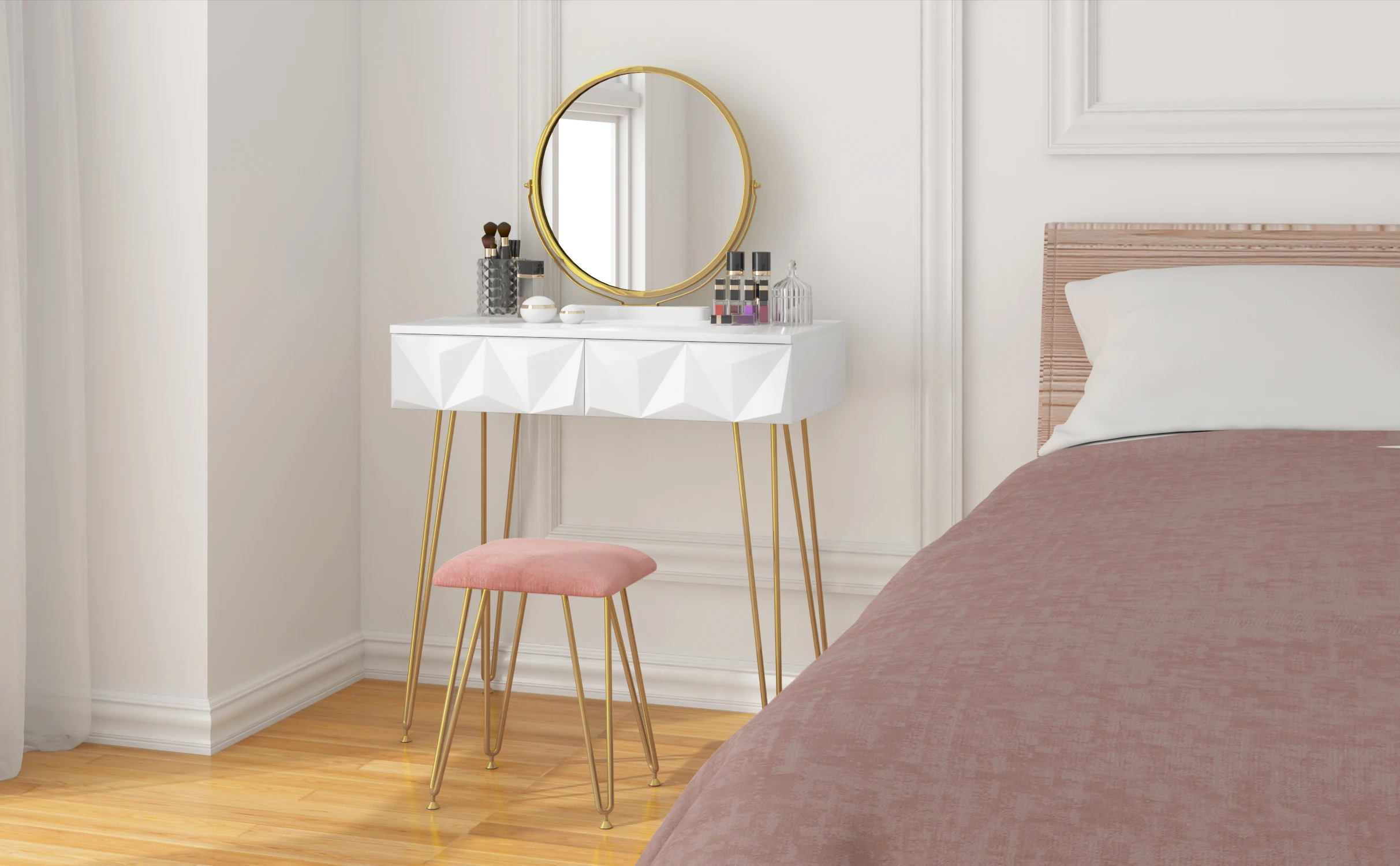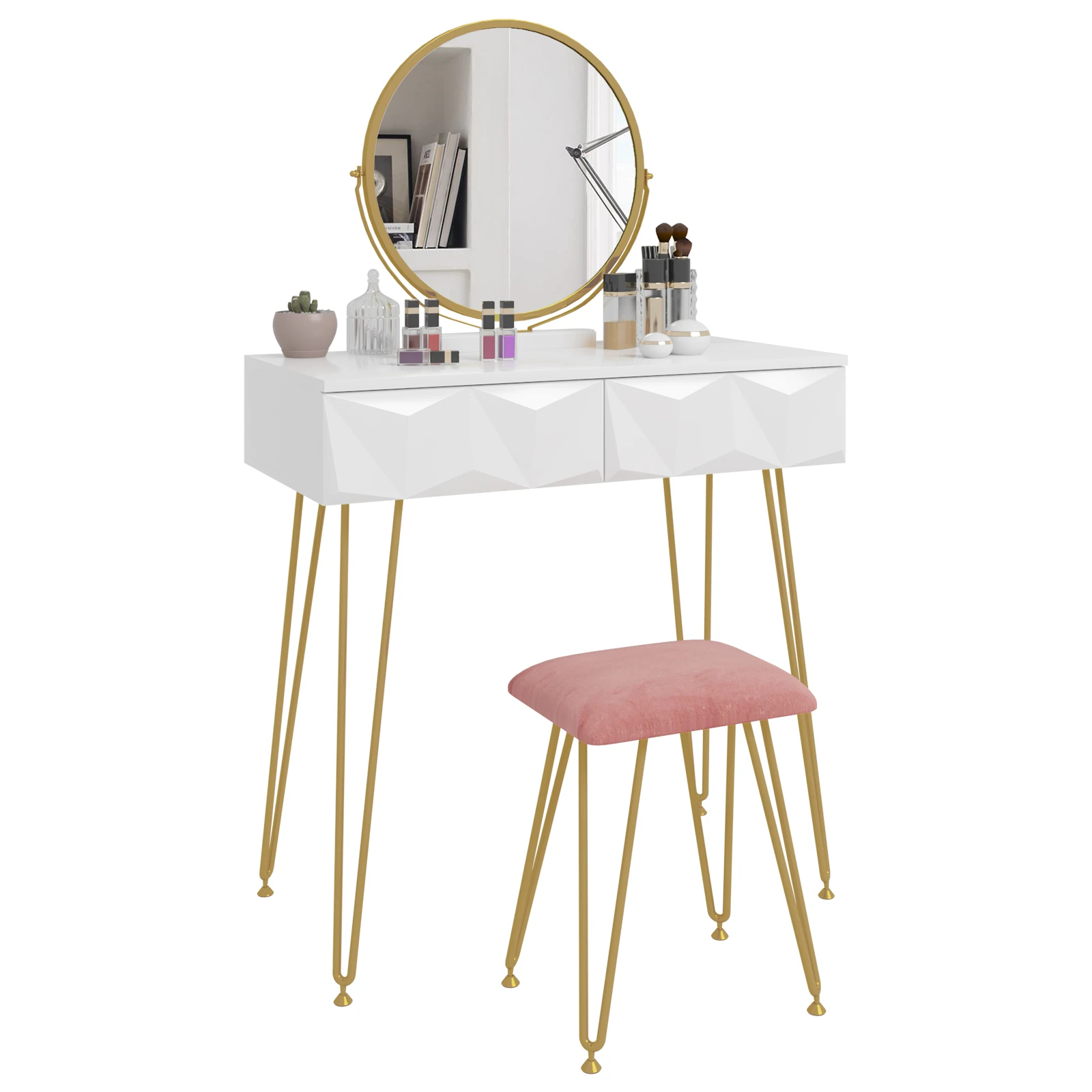 Beautiful and practical design: the front of the drawers is designed in a simple and modern diamond shape with 3D effect. The white-gold dressing table with the pink stool can be integrated into any living style. The gold frame mirror can be fixed firmly on the table edge without taking up space on the table top. In addition, the mirror can be swivelled 360°, so you can enjoy more free viewing angle and enrich your room