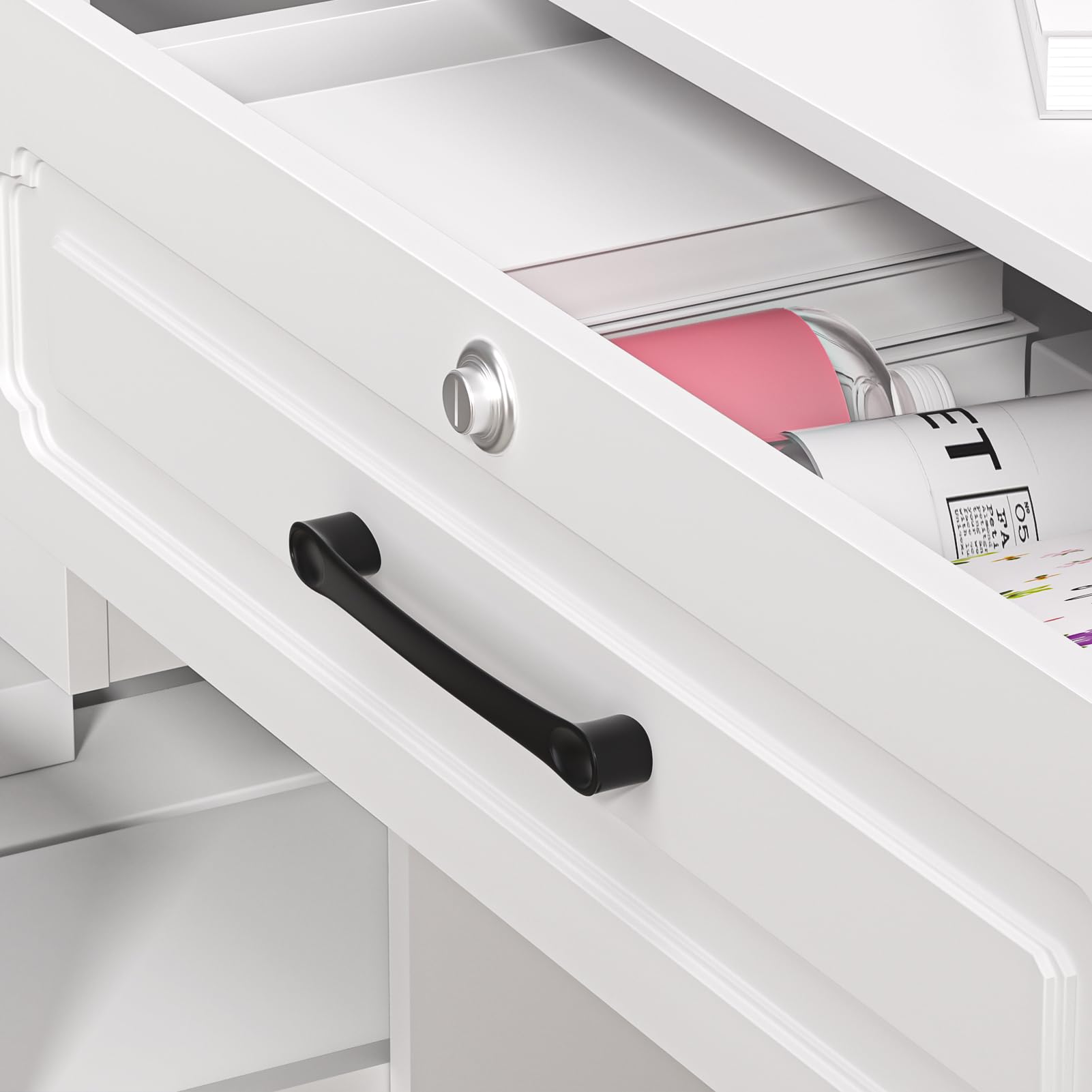 - Les poignées vintage de haute qualité sur les quatre grands tiroirs ajoutent de l'élégance aux étagères de rangement. Chaque détail est soigneusement conçu pour rendre ce bureau blanc à la fois attrayant et fonctionnel dans n'importe quelle décoration de chambre, dégageant une sophistication où qu'il soit placé. C'est un cadeau idéal pour un anniversaire, la Saint-Valentin, la fête des mères, Noël ou d'autres occasions spéciales.
