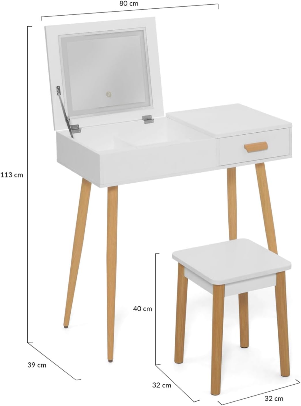 Vous avez besoin d'une coiffeuse, d'une console et d'un bureau. Mais vous n'avez pas assez de place chez vous ? Voici le meuble idéal pour répondre à tous vos besoins en un instant ! Cette jolie coiffeuse scandinave hêtre et blanche avec tabouret LISA saura vous séduire par son design et par sa solution gain de place ultra fonctionnelle.Cette coiffeuse scandinave est fabriquée en particules de bois et ses pieds en métal imitation bois apportent robustesse et stabilité pour supporter vos différents produits. Idéal pour les petits espaces, le miroir LED à la fonction rabattable est très pratique ! Relevez-le en un clin d'œil le matin, pour vous coiffer, vous apprêter et vous faire belle. Une fois le miroir rabattu, il ne prendra pas la poussière et le plateau pourra vous servir de bureau pour la journée, idéal pour le télétravail par exemple. Rangez en toute discrétion vos bijoux, maquillage et accessoires grâce aux 4 grands compartiments dissimulés sous le miroir. Facile à nettoyer, il vous suffit de passer un coup de chiffon sur votre coiffeuse LISA. Cette coiffeuse dispose d'un tiroir coulissant avec une poignée bois qui rappelle le design scandinave avec ses pieds obliques et biseautés. Cet espace de rangement supplémentaire se complète avec le bloc du tiroir, qui pourra vous servir pour poser une petite lampe de chevet ou vos objets déco ! Grâce à son design épuré et moderne, elle peut s'adapter à tous les styles de déco et trouvera sa place dans n'importe quelle pièce de votre maison : chambre, bureau, dressing, et même entrée.Son coloris hêtre et blanc avec son tabouret assorti font de cette coiffeuse un meuble chic et chaleureux qui ravira votre chambre à coucher ou votre dressing.Alors n'hésitez plus et commandez cette table de maquillage LISA qui vous offrira un espace agréable et fonctionnel dans un esprit scandinave et authentique ! Dimensions de la coiffeuse miroir LED rabattable LISADimensions globales : Longueur