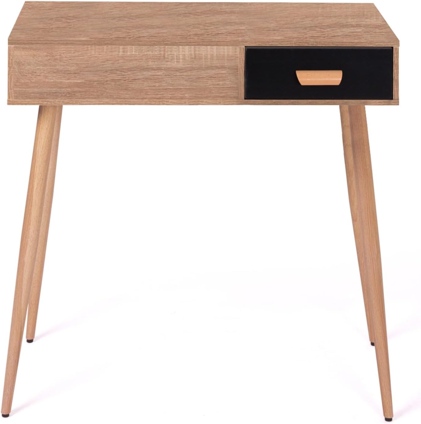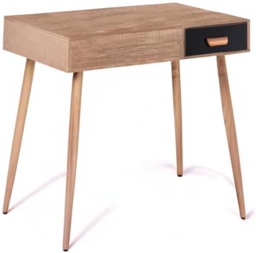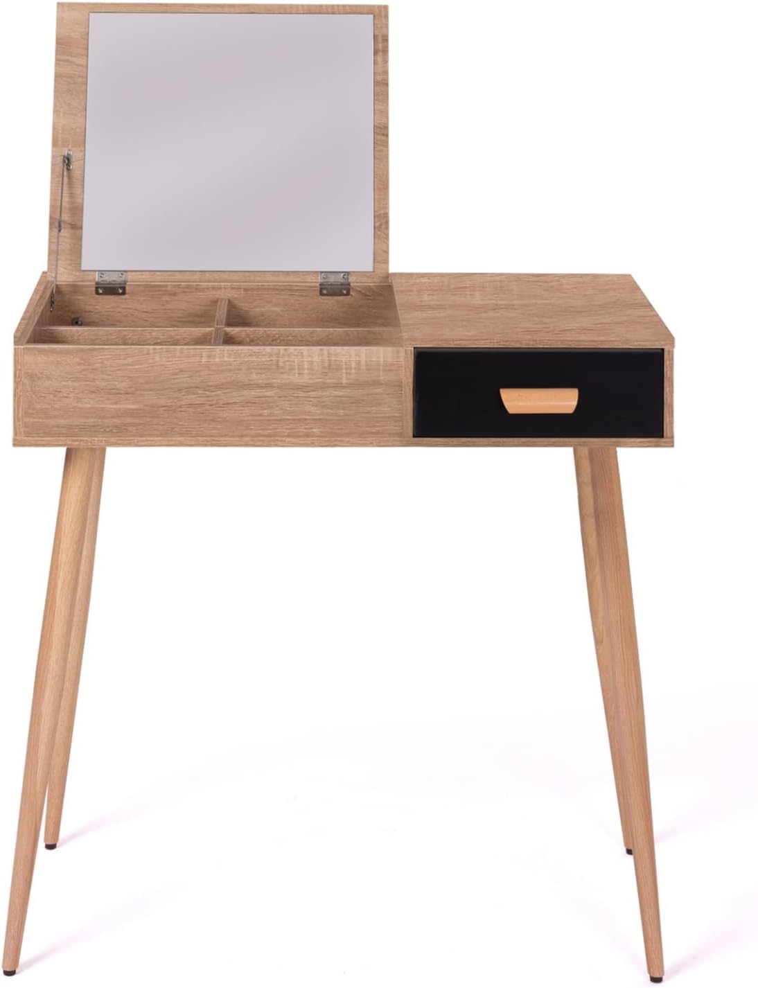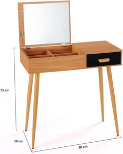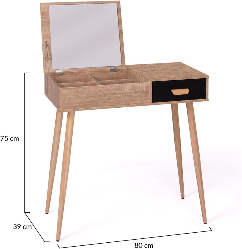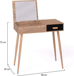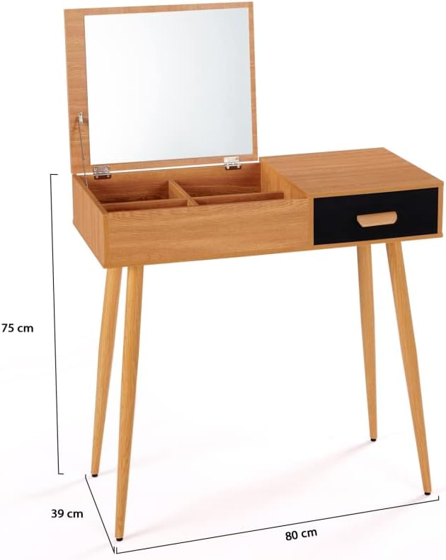 Vous avez besoin d'une coiffeuse, d'une console et d'un bureau mais vous n'avez pas assez de place chez vous ? Voici le meuble idéal pour répondre à tous vos besoins en un instant ! Cette jolie coiffeuse scandinave hêtre et noir LISA saura vous séduire par son design et par sa solution gain de place ultra fonctionnelle.Cette coiffeuse scandinave est fabriquée en particules de bois et ses pieds en métal imitation bois apportent robustesse et stabilité pour supporter vos différents produits. Idéal pour les petits espaces, le miroir à la fonction rabattable est très pratique ! Relevez-le en un clin d'oeil le matin, pour vous coiffer, vous apprêter et vous faire belle. Une fois le miroir rabattu, il ne prendra pas la poussière et le plateau pourra vous servir de bureau pour la journée, idéal pour le télétravail par exemple. Rangez en toute discrétion vos bijoux, maquillage et accessoires grâce aux 4 grands compartiments dissimulés sous le miroir. Facile à nettoyer, il vous suffit de passer un coup de chiffon sur votre coiffeuse LISA. Ce meuble coiffeuse dispose d'un tiroir coulissant avec une poignée bois qui rappelle le design scandinave des pieds obliques et biseautés. Cet espace de rangement supplémentaire se complète avec le bloc du tiroir, qui pourra vous servir pour poser une petite lampe de chevet ou vos objets déco ! Grâce à son design épuré et moderne, elle peut s'adapter à tout les styles de déco et trouvera sa place dans n'importe quelle pièce de votre maison : chambre, bureau, dressing et même entrée.Son coloris hêtre et son tiroir noir font de cette coiffeuse un meuble chic et chaleureux qui ravira votre chambre à coucher ou votre dressing.Alors n'hésitez plus et commandez cette table de maquillage LISA qui vous offrira un espace agréable et fonctionnel dans un esprit scandinave et authentique ! Dimensions de la coiffeuse miroir rabattable LISADimensions globales : Longueur 80 cm x largeur 39 cm x Hauteur 75 cmMatéri