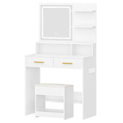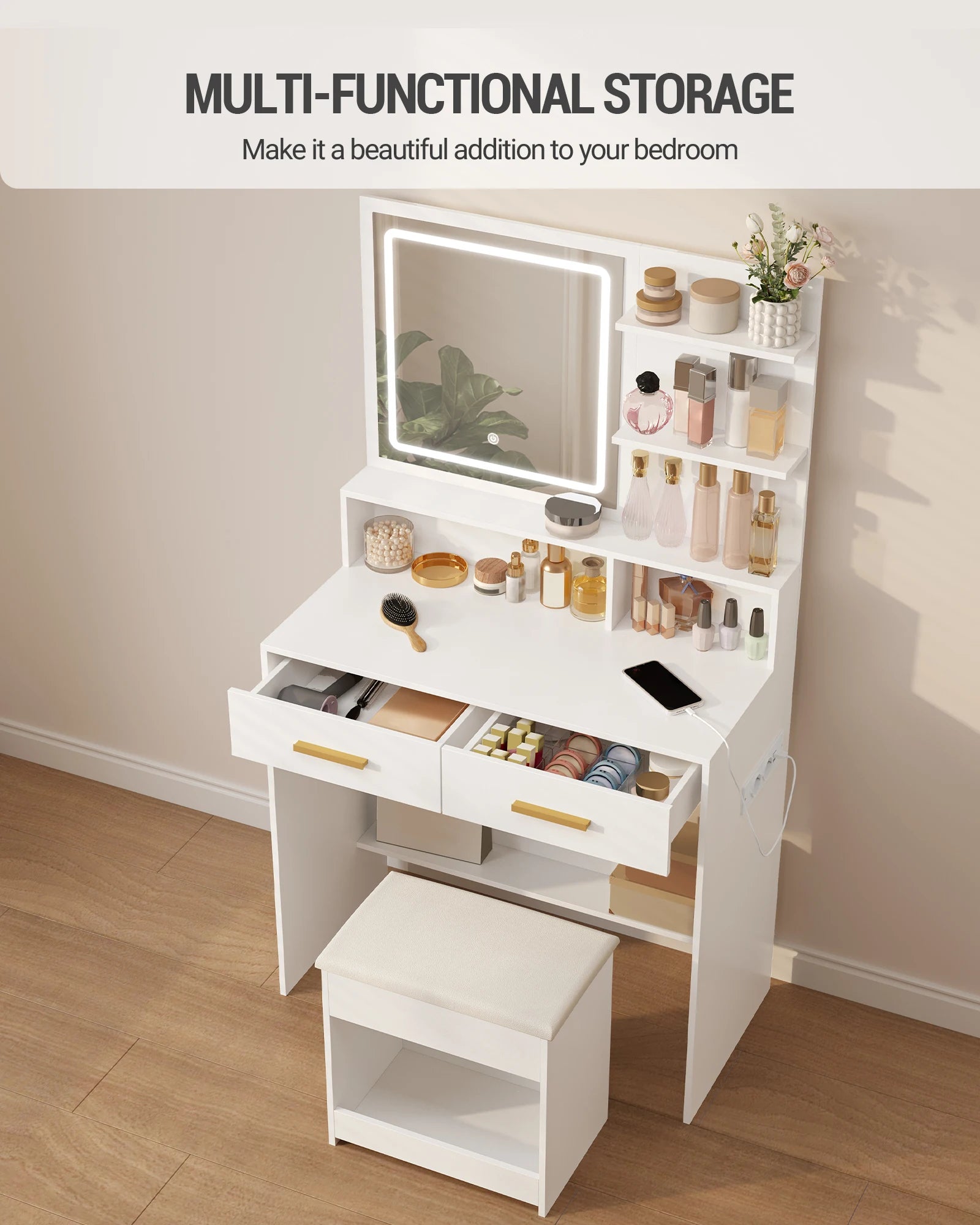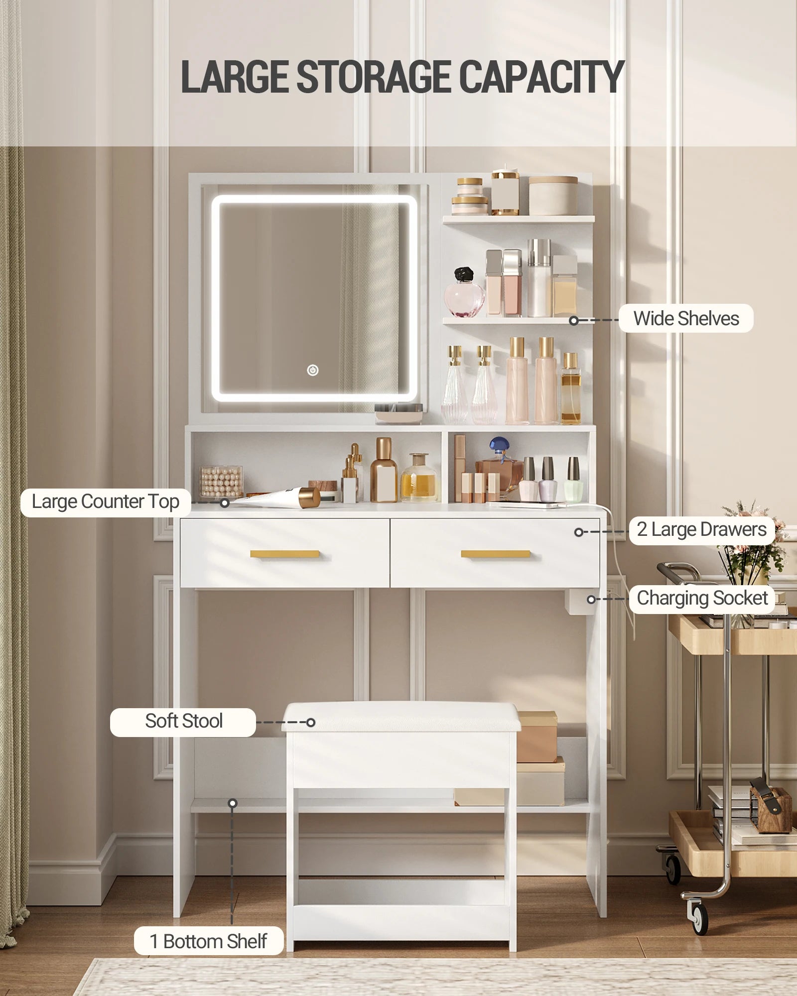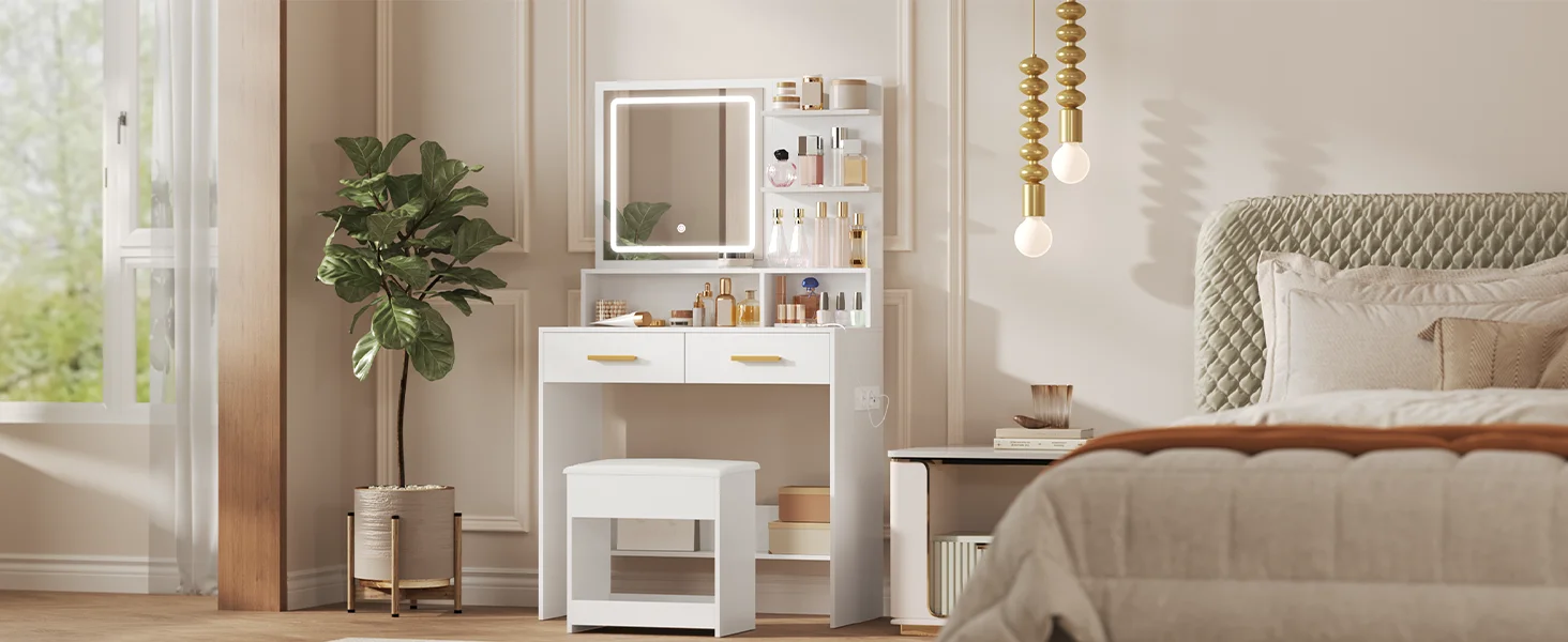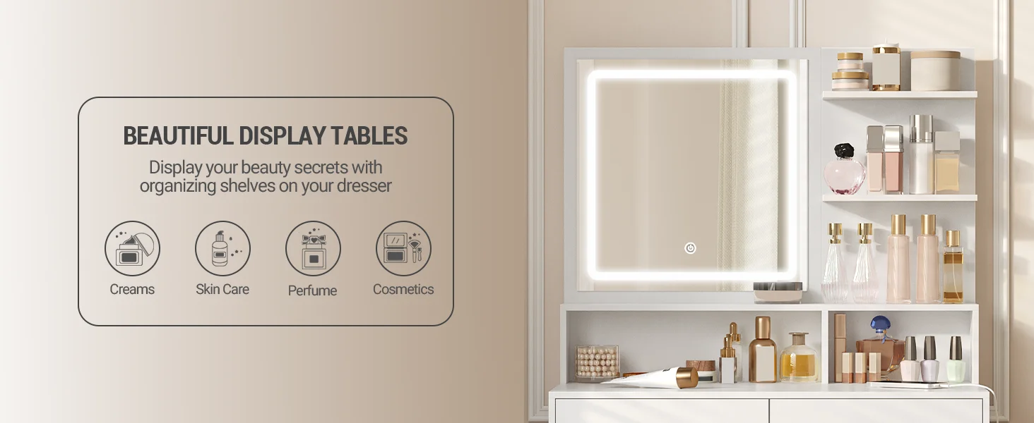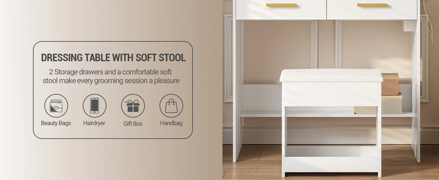 【Comfortable Soft Stool】This dressing table comes with a soft makeup stool. It is comfortable so that you can enjoy the ultimate comfort during the makeup process. There is also a storage space under the stool! You can store small items that you don't often use in it, which is both practical and space-saving.