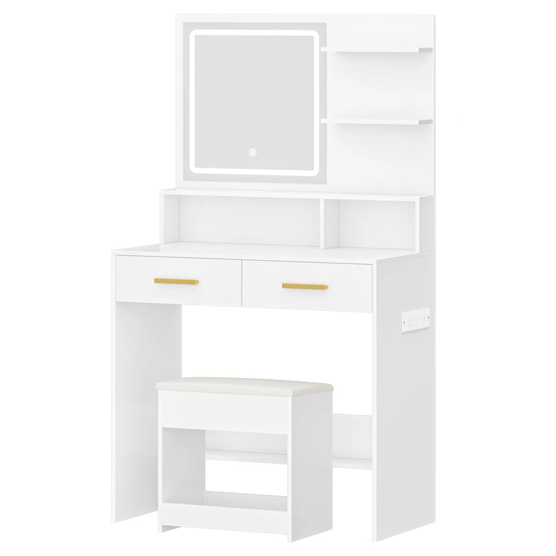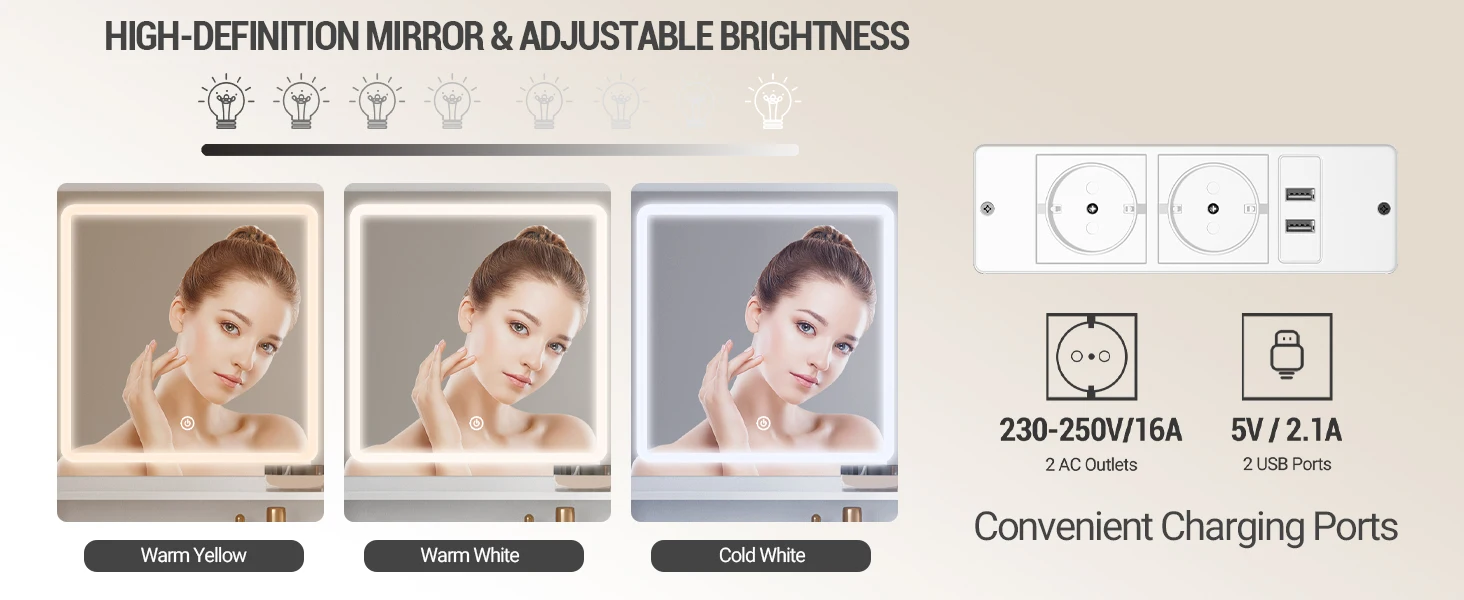 【Socket for charging】This dressing table also has a charging station (2 sockets and 2 USB ports), which you can use to charge your mobile phone or connect beauty devices such as a hairdryer. This design allows you to realize the perfect combination with technology while doing your beauty make up.
