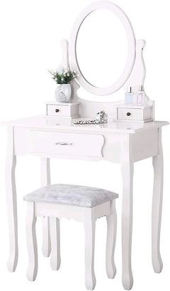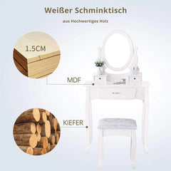 Dimension: Dressing table: 40 * 75 * 136 cm (W*D*H). Stool: 28 * 38 * 45cm (W*D*H). Large drawer: 30 * 37 * 7cm (W*D*H). Small drawers: 7.8 * 12.8 * 5.8cm (W*D*H). Material: High quality hardwood and MDF. All materials of our dressing table are eco-friendly, sturdy, easy to clean & durable.