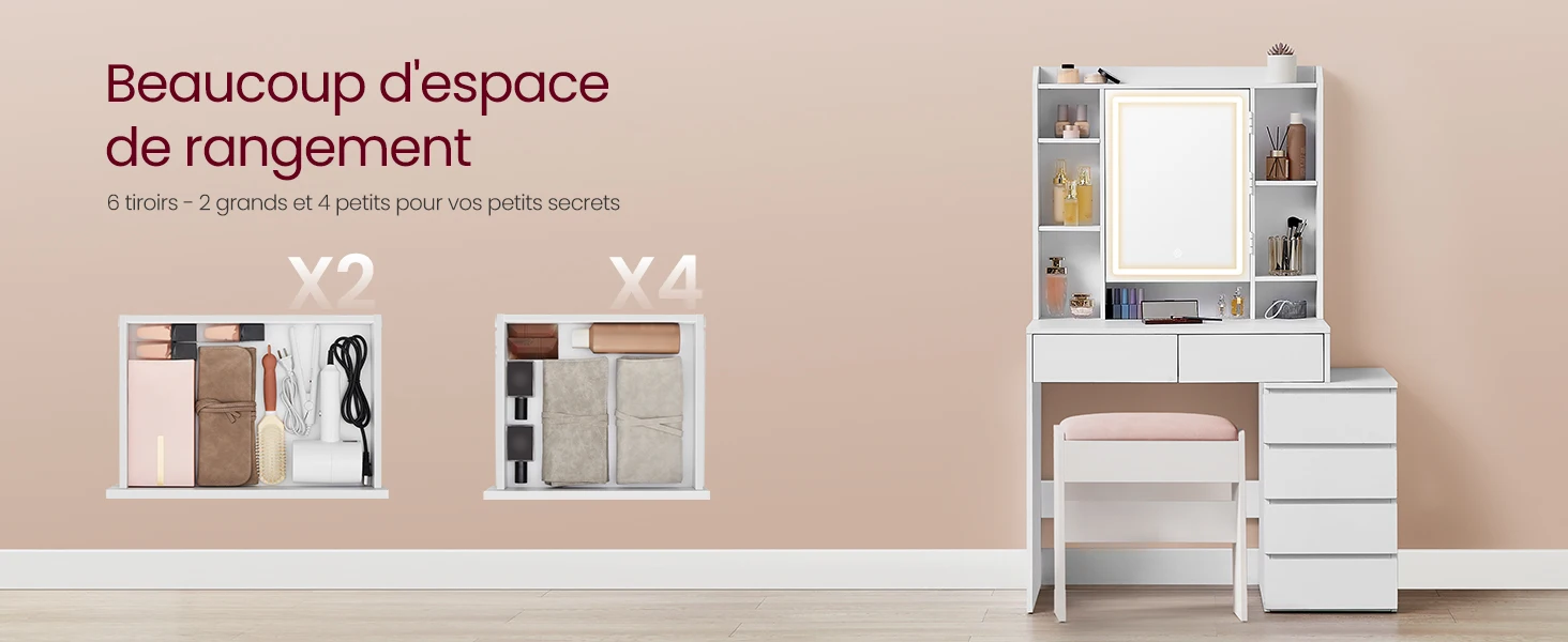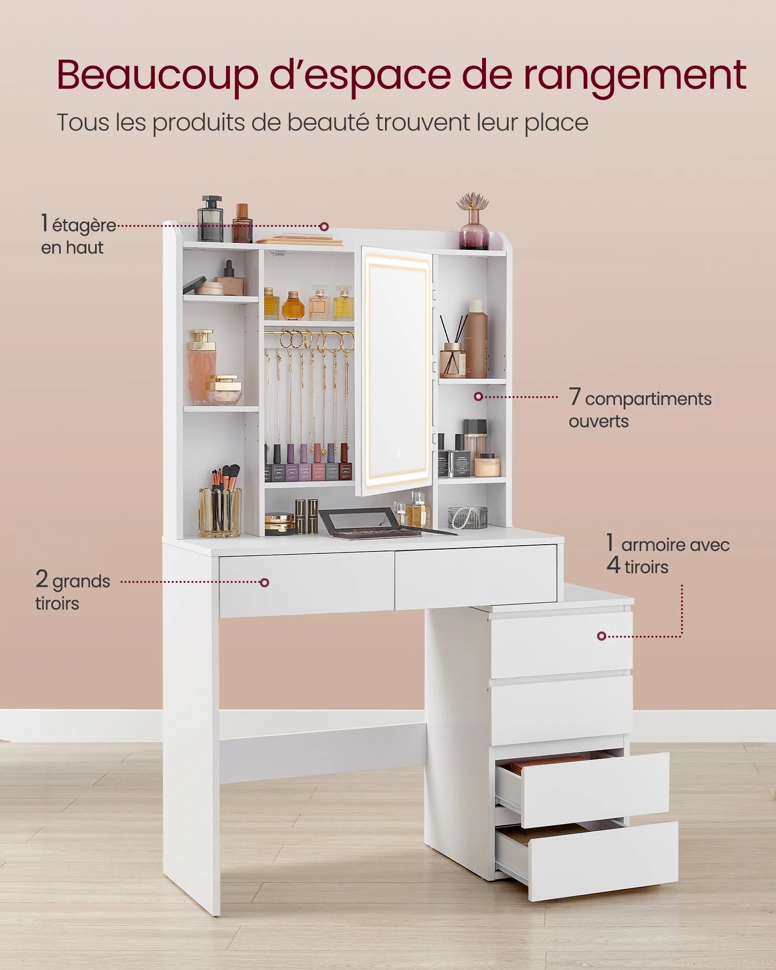 [Beaucoup d’espace] Une étagère supérieure,7 étagères ouvertes,2 grands tiroirs,2 étagères et crochets derrière le miroir,ainsi qu'une armoire avec 4 tiroirs - tout a sa place