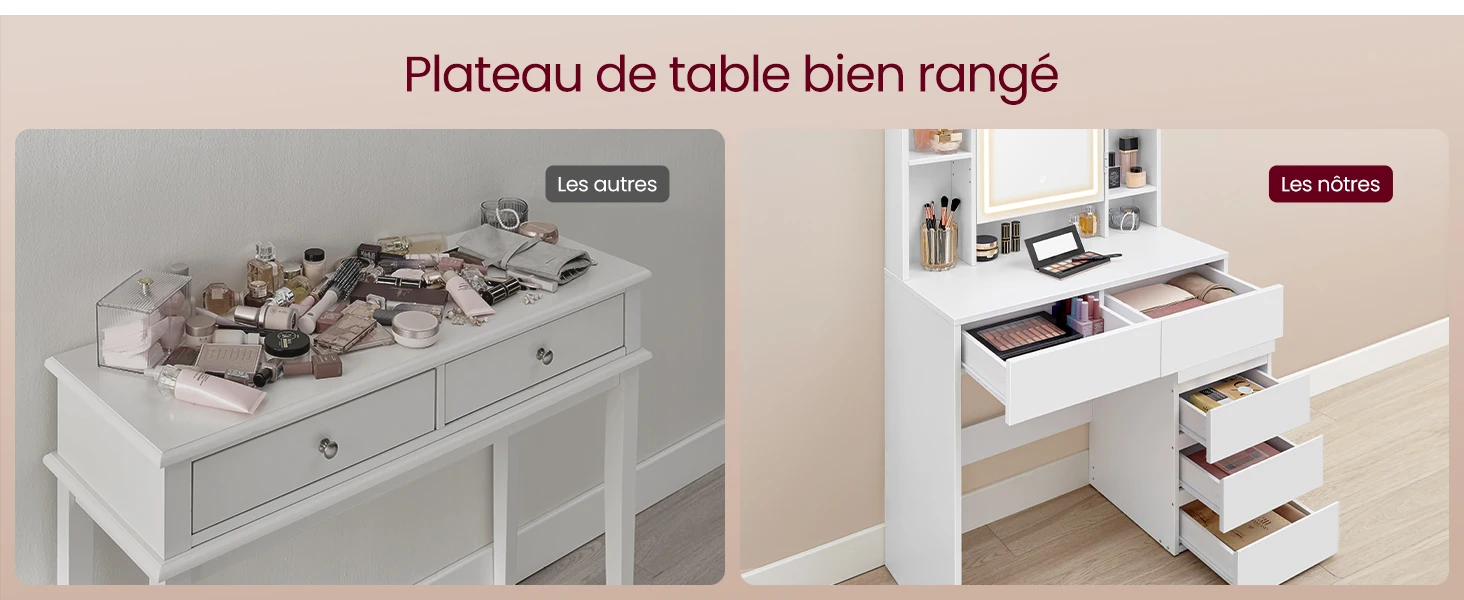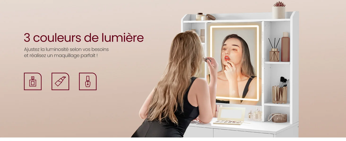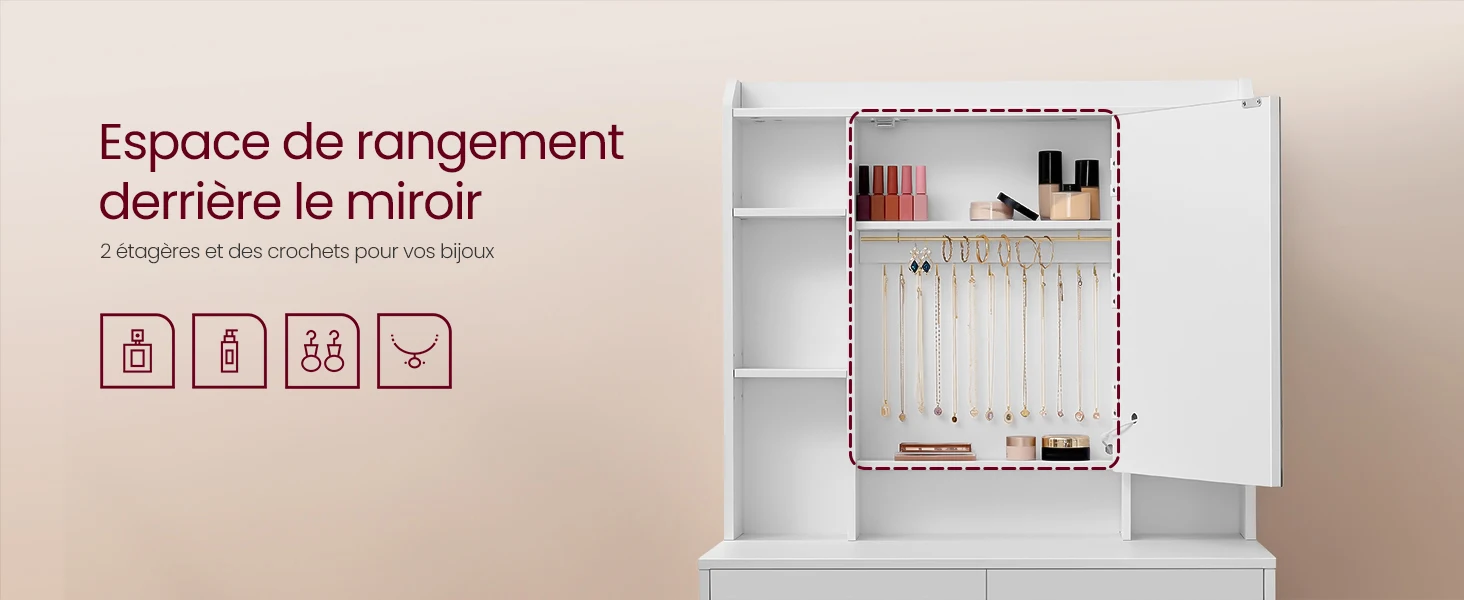 - Veuillez fixer la coiffeuse au mur avec le dispositif anti-basculement fourni pour créer un environnement d'utilisation sûr.