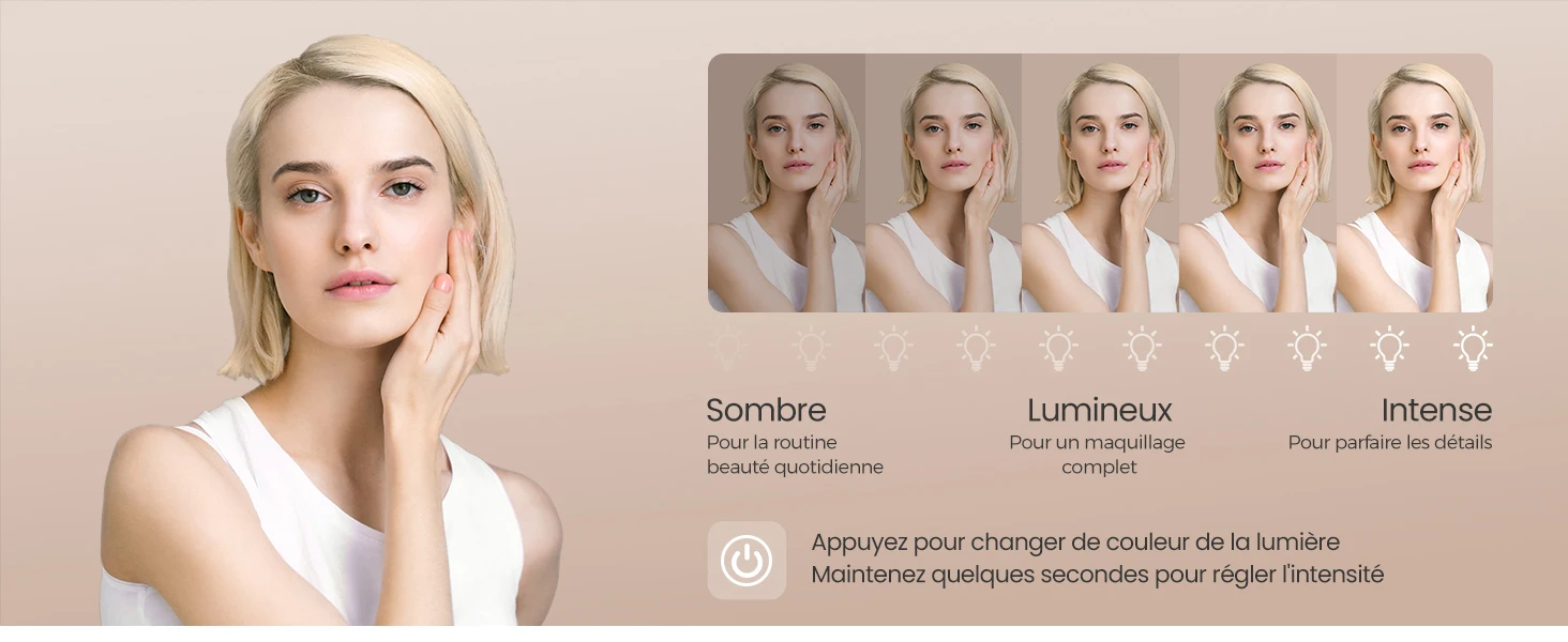 [Éclairage LED réglable] Maintenez quelques secondes sur l'interrupteur pour régler l'intensité,appuyez pour changer de couleur de la lumière - créez un maquillage parfait !