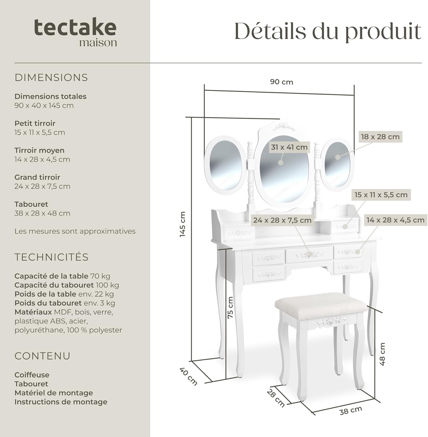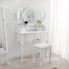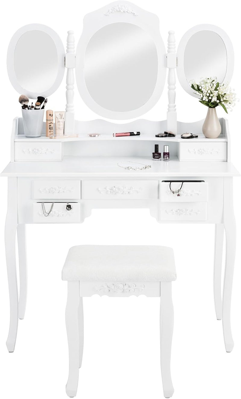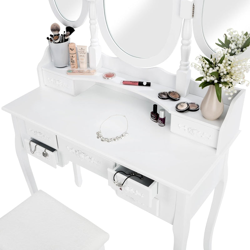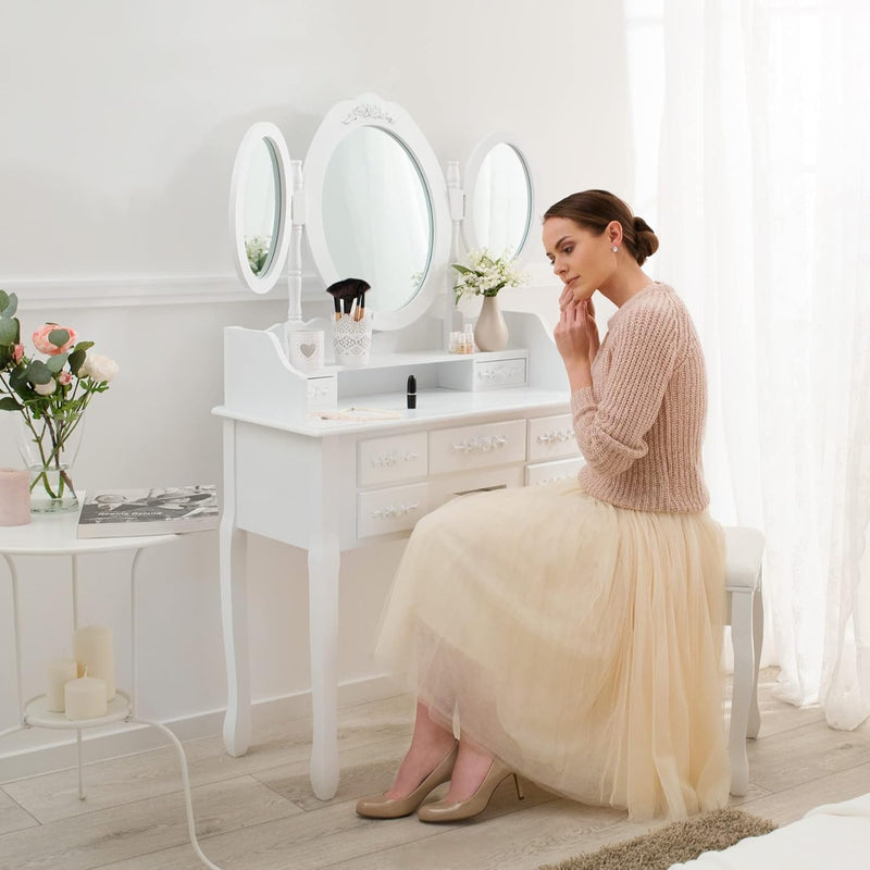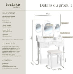 Coiffeuse Meuble, Table de Maquillage, Secrétaire, Commode avec Miroir 3 Faces Rabattables et 7 Tiroirs + 1 Tabouret Blanc TECTAKE. UNE TOUCHE ROMANTIQUE DANS VOTRE CHAMBRE: Découvrez une coiffeuse blanche qui évoque les délices d'une époque révolue. Cette coiffeuse n'est pas seulement un meuble, c'est une expérience ! Imaginez-vous assis devant un grand miroir ovale pivotant à 360° avec deux miroirs ovales latéraux rabattables pour un aperçu parfait sous tous les angles. L'imitation du style ancien et romantique vous transporte dans un monde de pure élégance. PRATICITÉ & STYLE: Avec 7 tiroirs spacieux, cette coiffeuse avec rangement deviendra rapidement votre bureau maquillage favori. Ils offrent un espace de rangement supplémentaire pour tous vos objets personnels. Chaque tiroir est orné de roses délicates, une touche élégante. De plus, le tabouret coiffeuse assorti, avec son assise romantique et revêtu d'un magnifique tissu, est le complément idéal pour votre confort. FINITION SUPÉRIEURE: La robustesse et la qualité de cette coiffeuse meuble vous impressionneront. Son meuble blanc solide, ses pieds galbés élégants, et sa finition impeccable rendent cette commode coiffeuse parfaite pour toute coiffeuse adulte femme cherchant une touche sophistiquée. Dites adieu à votre routine quotidienne ennuyeuse et bonjour à une expérience beauté digne d'une reine !
