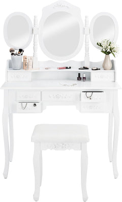 - MIROIRS PARFAITS: Accompagnée d'un grand miroir ovale pivotant et de 2 miroirs ovales latéraux rabattables, cette coiffeuse avec miroir rend votre routine beauté plus flexible et parfaite. Chaque angle, chaque contour est à portée de vue. Vous allez adorer comment cela change votre routine de maquillage!