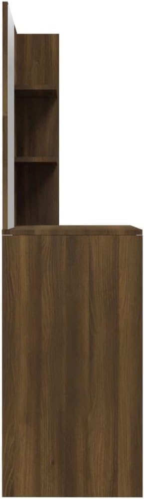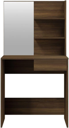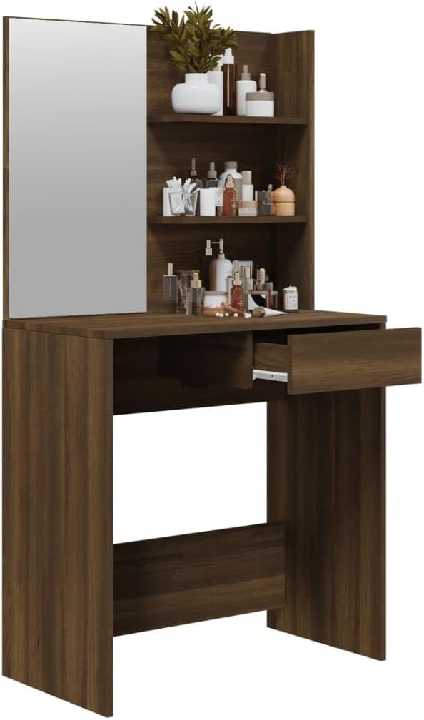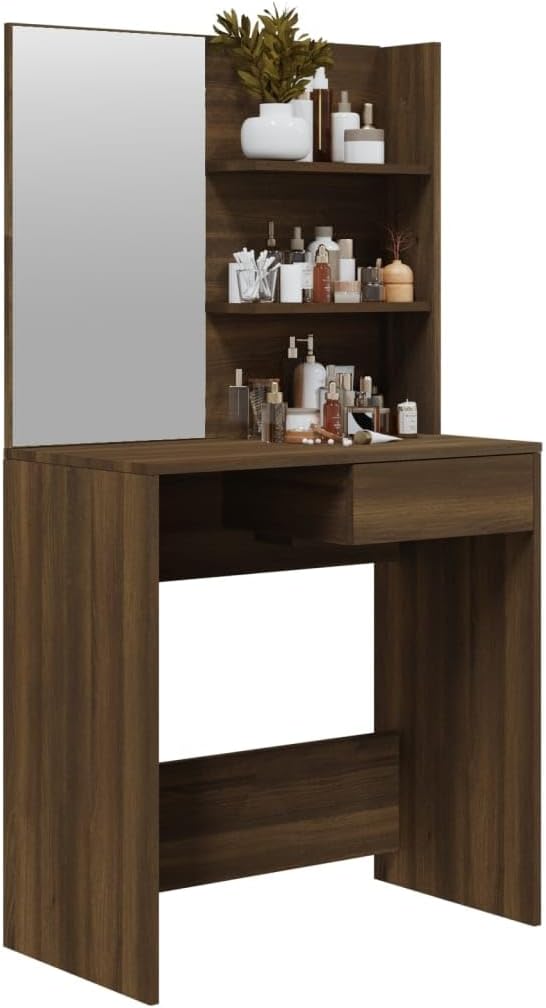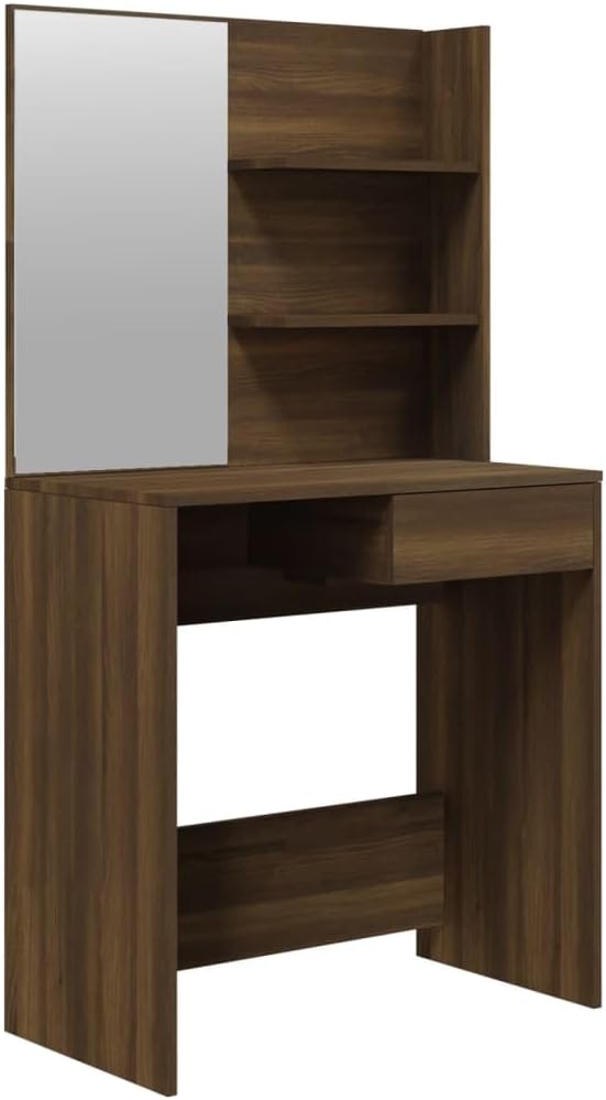 With its refined straight lines and asymmetrical shape full of originality, this dressing table is sure to turn heads! Stable Material The engineered wood is of exceptional quality with smooth surface and also has strength, stability and moisture resistance. Utility Mirror: The makeup table with mirror is perfect for your daily beauty routine. The mirror allows you to take care of your facial skin and make up too!Large storage space: the top of the dressing table, the two-tier shelves on the table and a drawer under the table provide enough space for easy access to your makeup, jewelry and everyday essentials.Modern design: the modern design features clean lines and minimalist looks as part of the interior design style. Warning: In order to prevent it from tipping over, this product must be used with the included wall mounting device. Note: Each product comes with an assembly manual in the box for easy assembly.