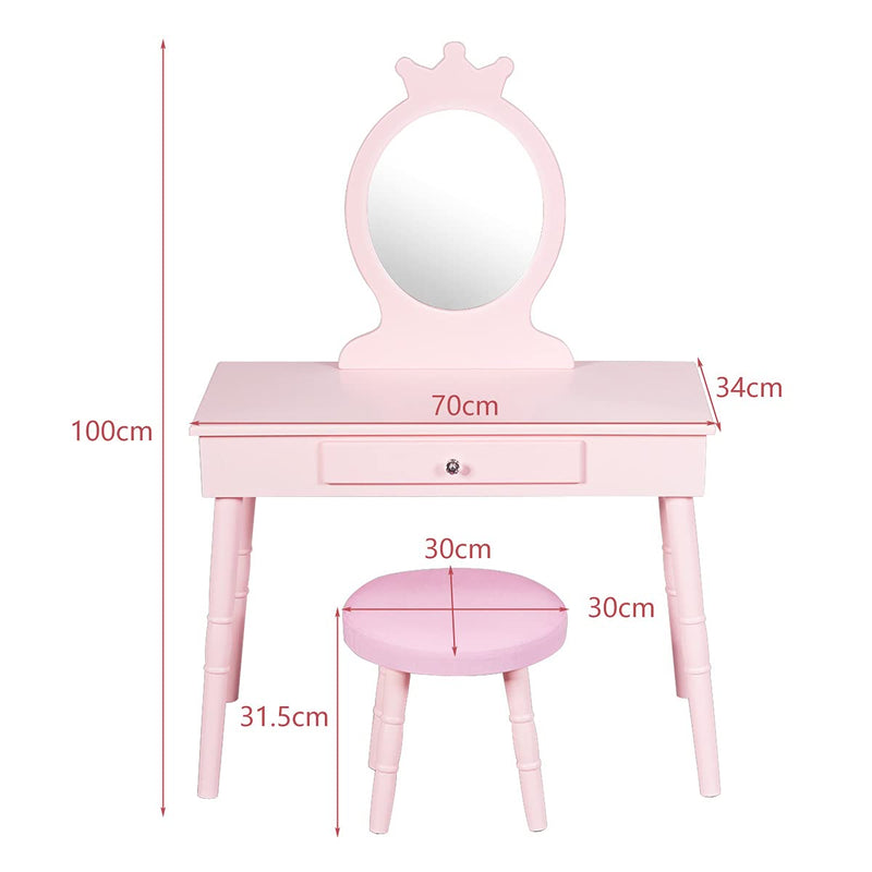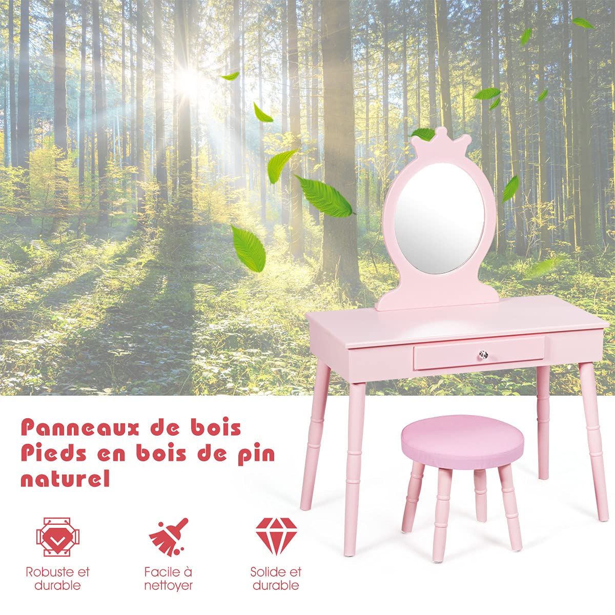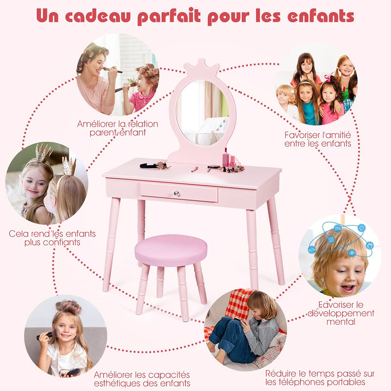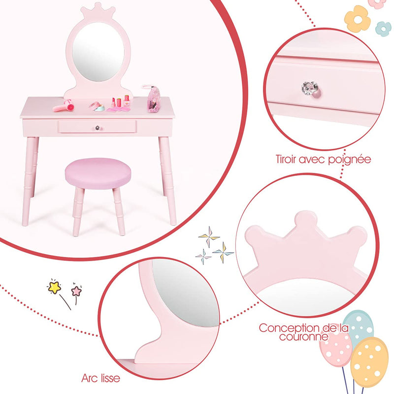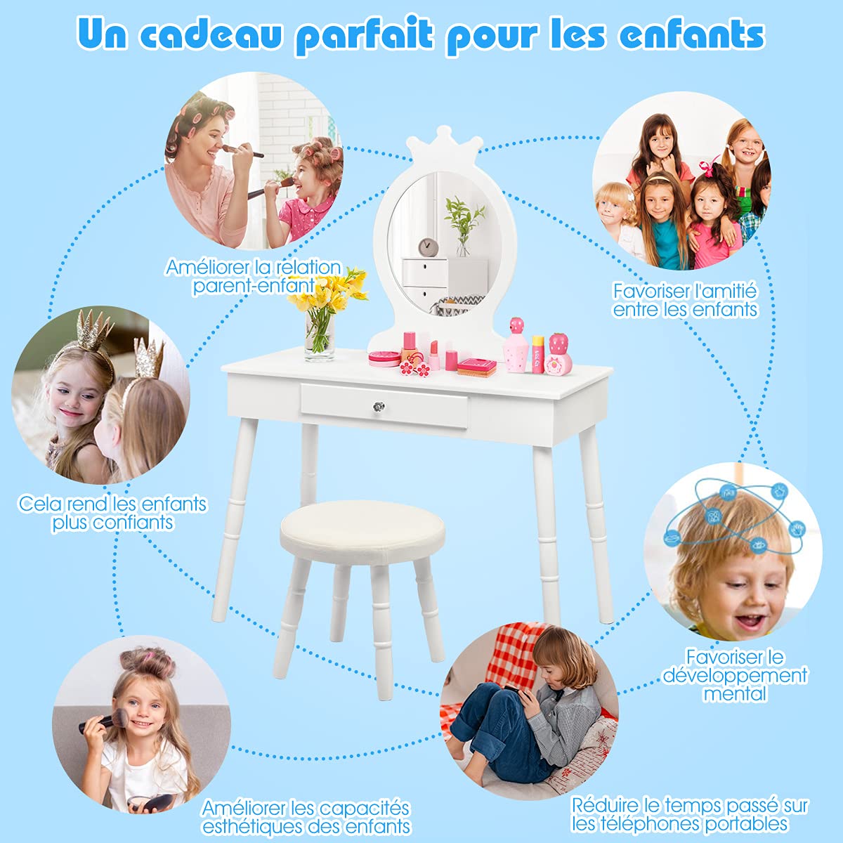 - 💖Coiffeuse enfant fille sûre : Notre coiffeuse a une surface lisse qui ne rayera pas la peau de votre enfant. Les bords de table sont arrondis pour éviter de heurter votre enfant. Le matériau est du bois de haute qualité. C’est sûr et inoffensif. Vous pouvez l'utiliser pour votre enfant sans crainte.