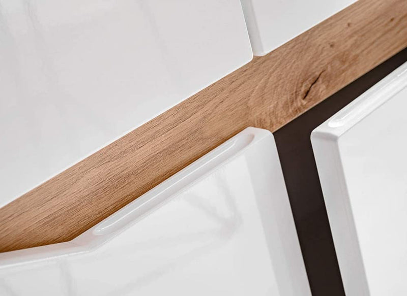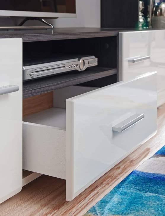 - Solutions Pratiques : Une armoire avec une étagère ouverte sur le côté droit et une armoire avec un couvercle rabattable sur le côté gauche offrent des solutions de rangement pratiques. L'ensemble est livré par transporteur. Livraison facile au bord de la route, sans devoir apporter des paquets à l'appartement.