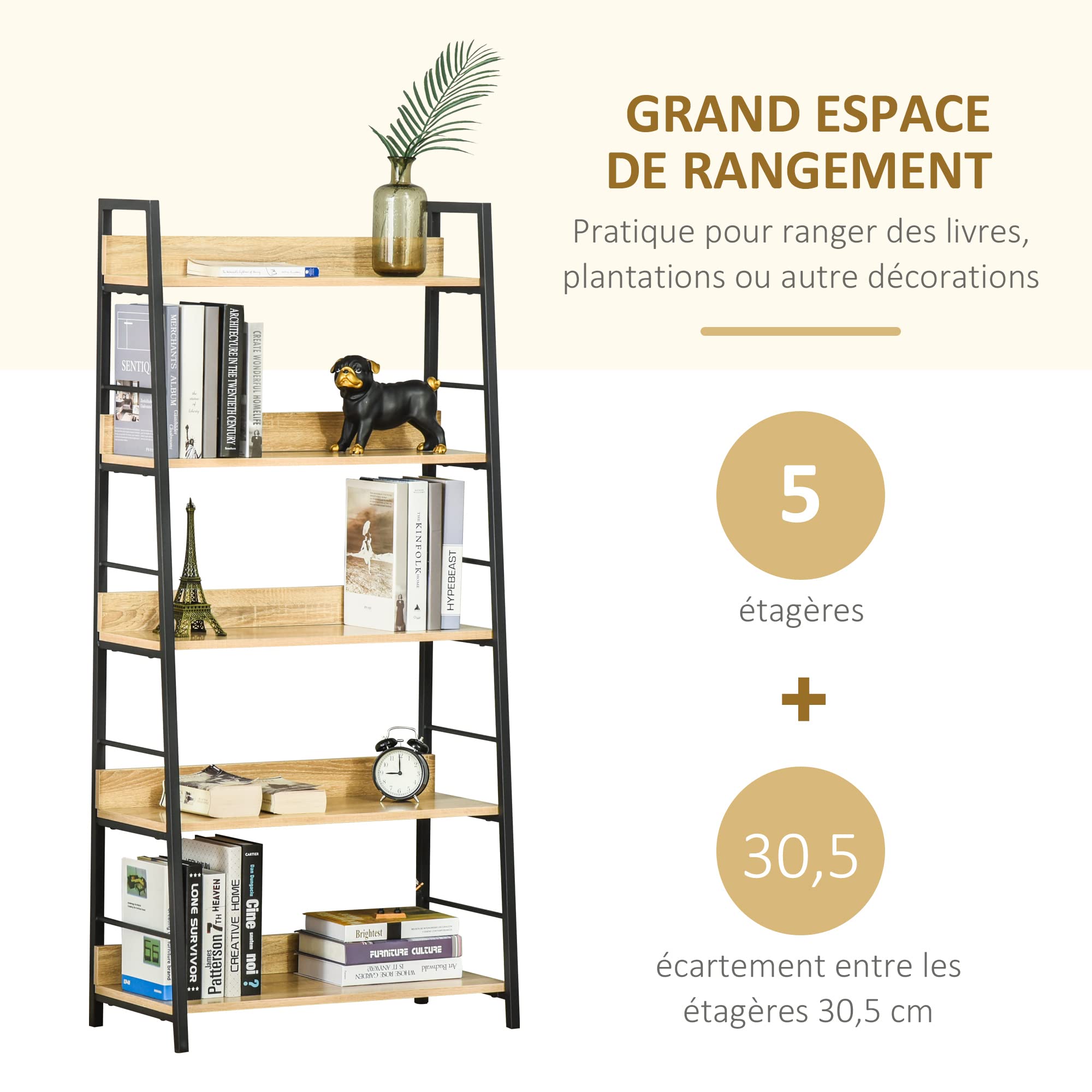 - GRAND ESPACE DE RANGEMENT : Étagère de rangement à 5 niveaux occupe moins d'espace au sol tout en offrant un grand espace de rangement pour vos livres, CD, Blu-ray, décorations, etc... afin d'optimiser votre espace disponible