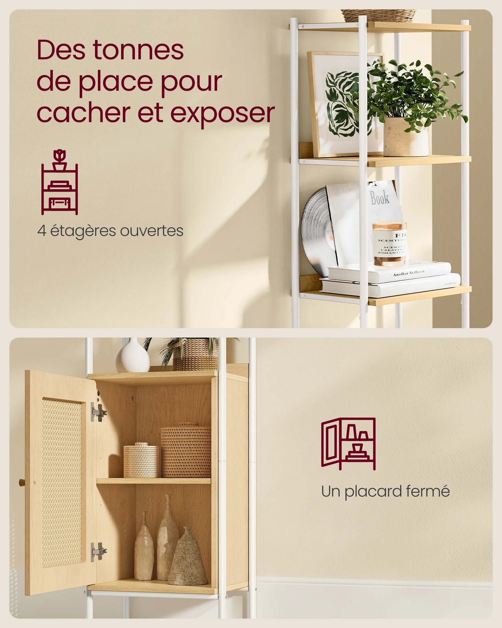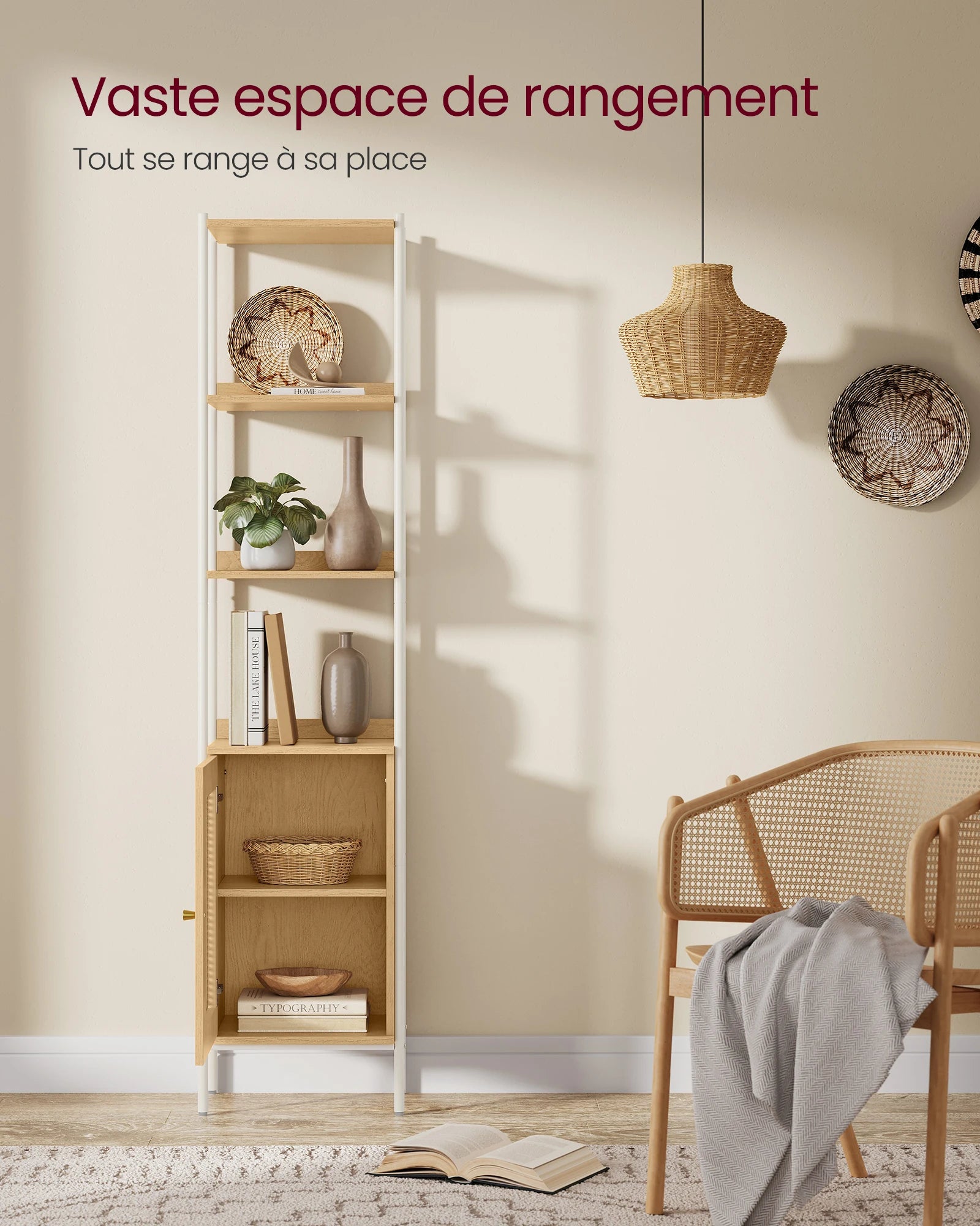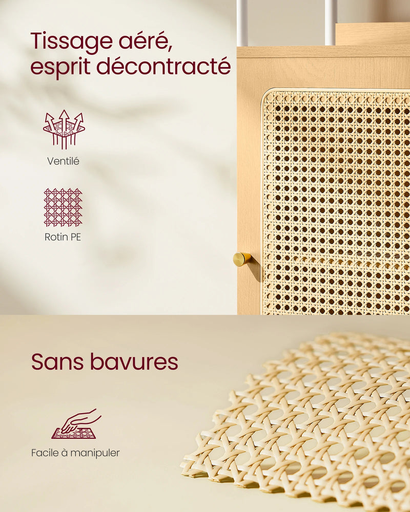 [Un charme bohème irrésistible] Insufflez une ambiance bohème à votre espace grâce à cette bibliothèque. Ses couleurs chaudes de terre,combinées à une porte en imitation rotin,illumineront tout espace moderne ou agrémenteront un décor bohème