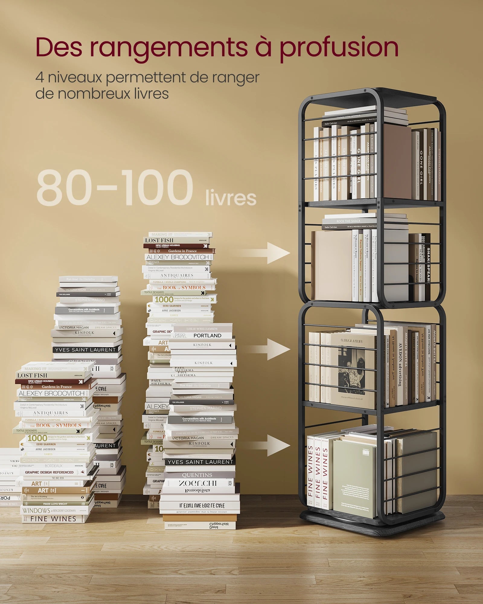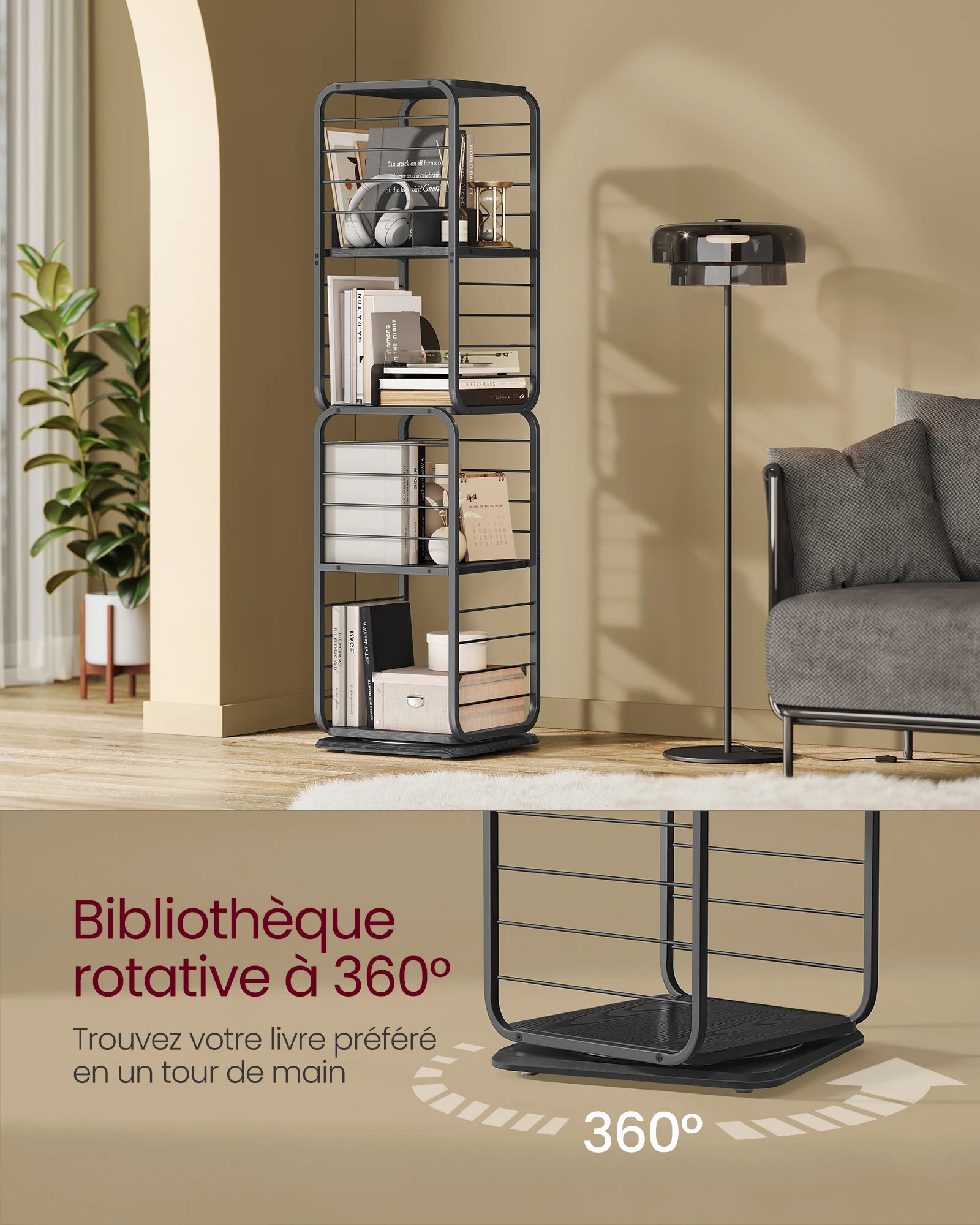 [Bibliothèque rotative 360°] Grâce à sa conception rotative,votre livre préféré n’est qu’à un tour de main. Les protections latérales empêchent les objets de tomber pendant qu’elle tourne et les étagères espacées accueillent les livres de grande taille