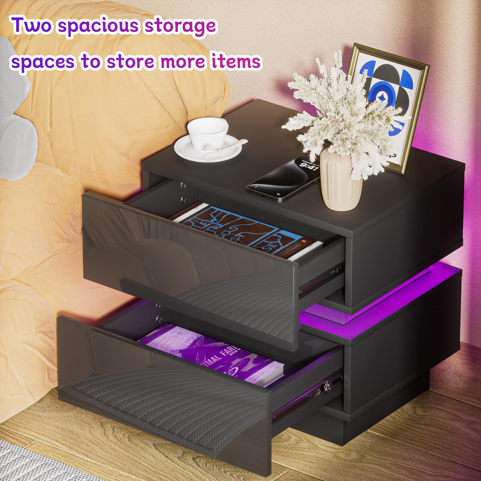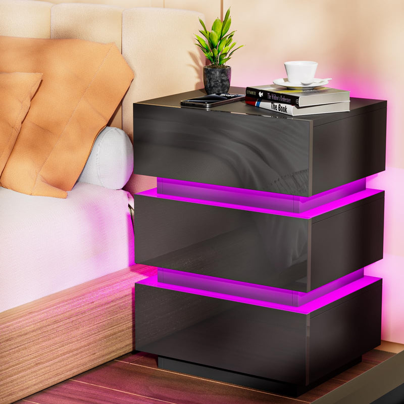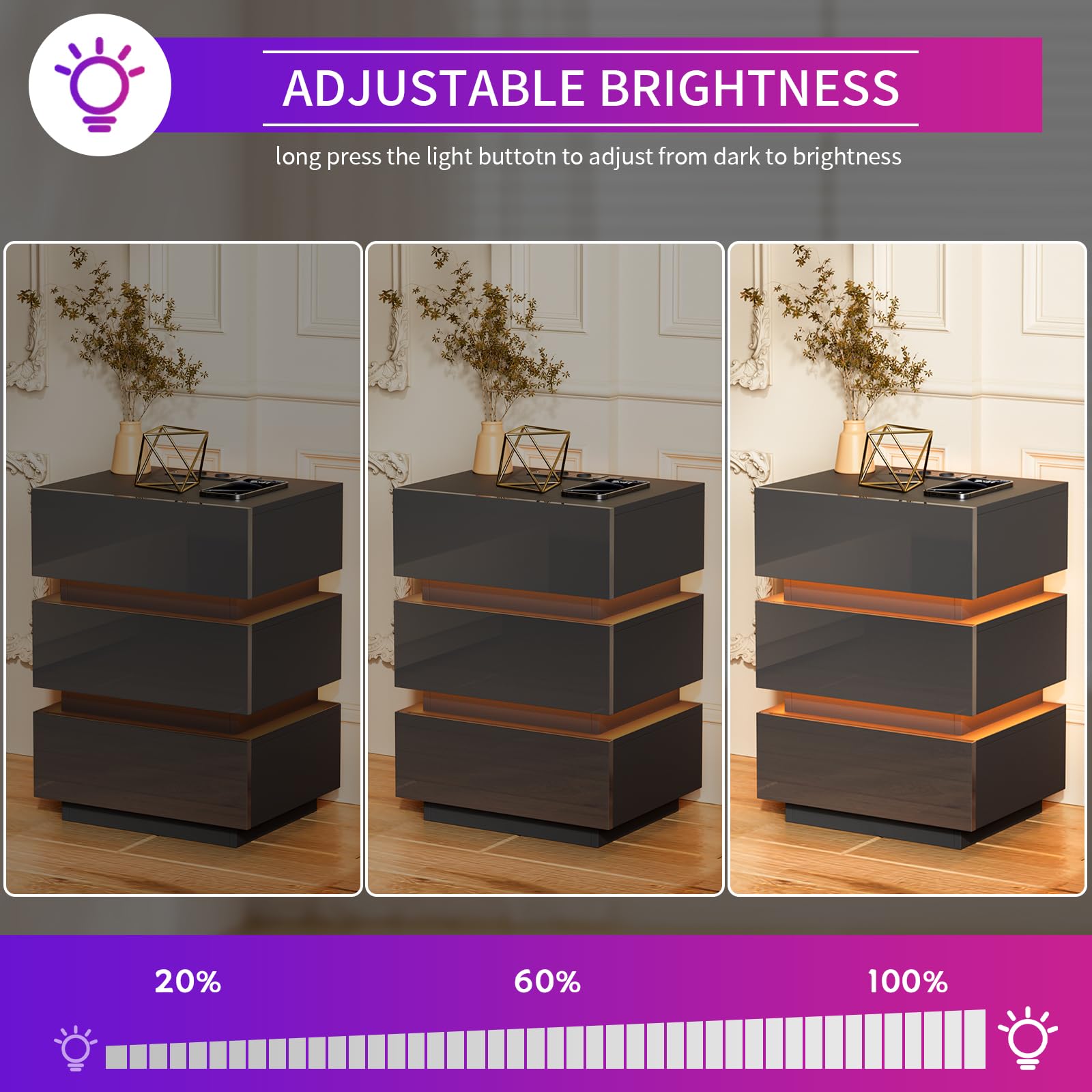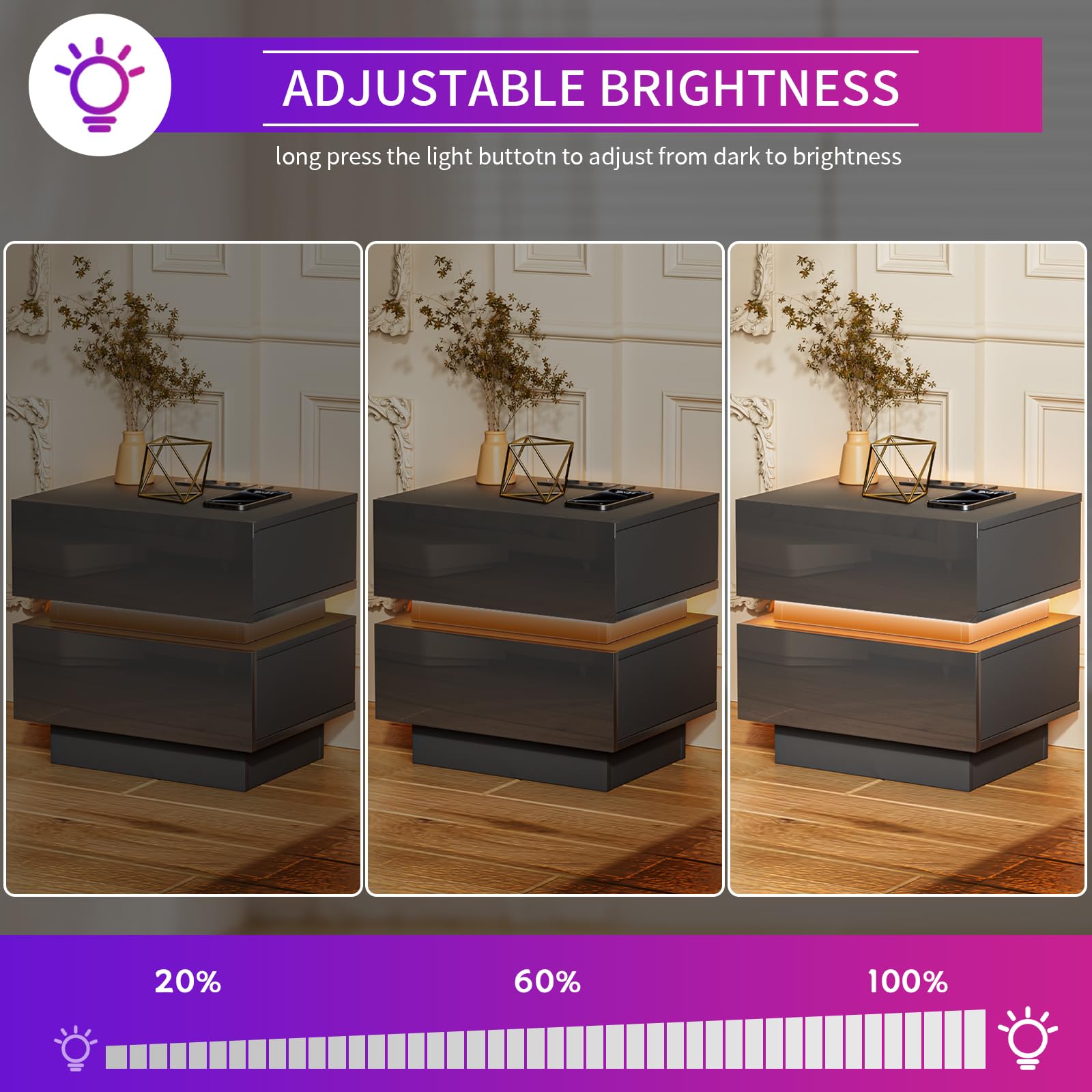 - 【Prise et ports USB】 - La table de chevet brillant est équipée d'une prise multifonction. La prise standard européenne dispose de 2 ports AC (220-250 V/15 A) et de 2 ports USB (5 V/2 A). Avec cette table de nuit avec fonction de chargement, les appareils mobiles tels que les téléphones portables, les tablettes, les lampes de table, les ordinateurs portables, les mini ventilateurs, etc. peuvent être facilement chargés.