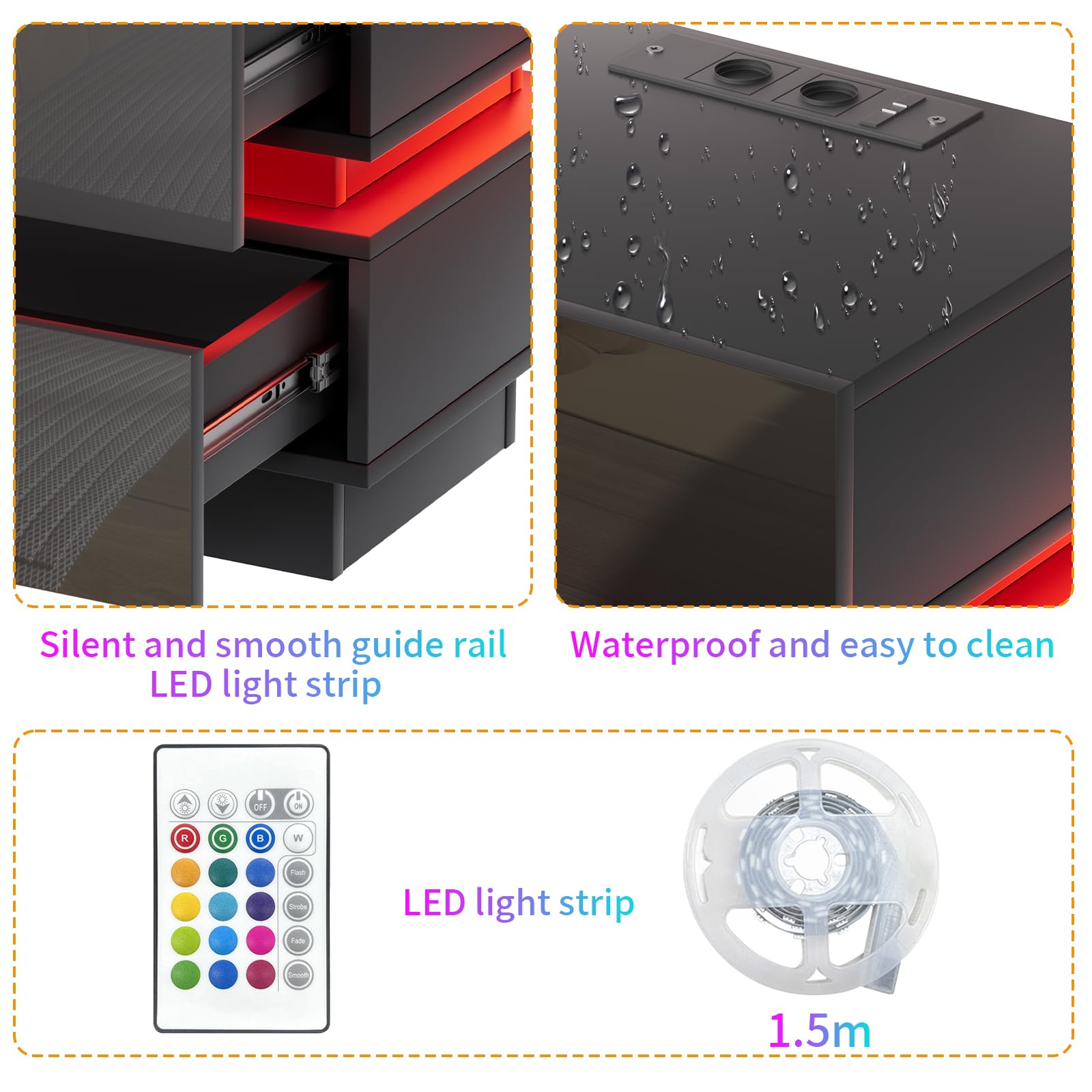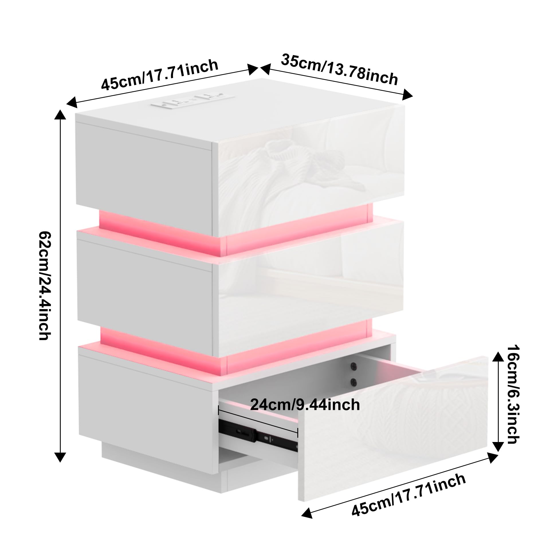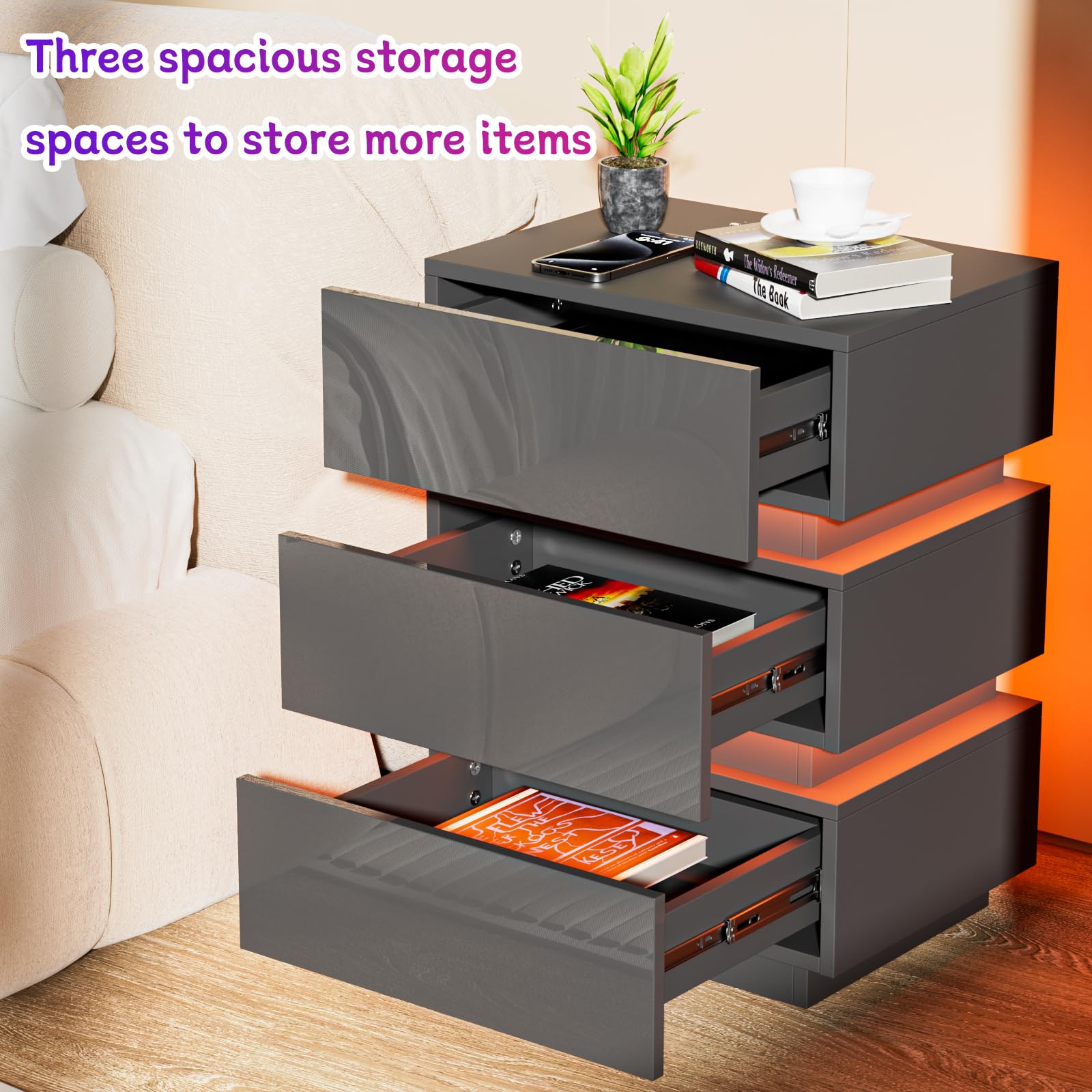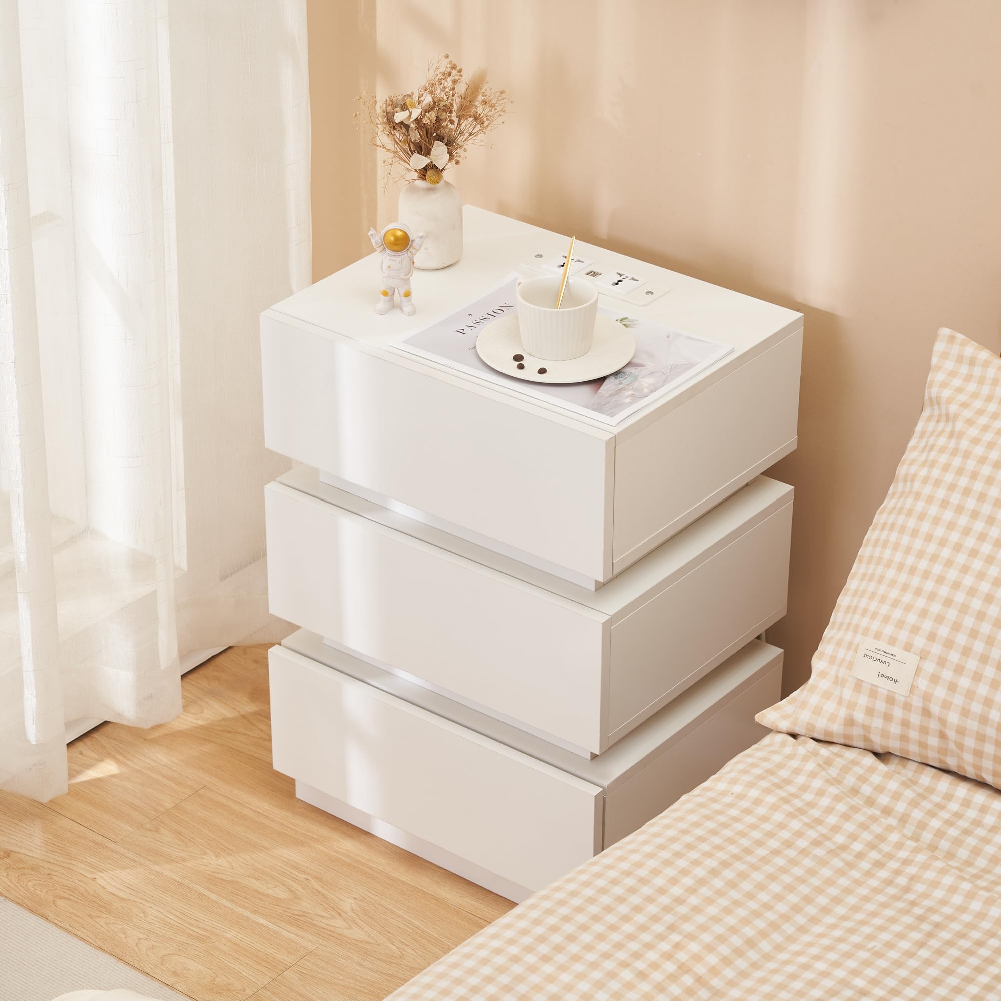 - 【Prise et ports USB】 - La table de chevet brillant est équipée d'une prise multifonction. La prise standard européenne dispose de 2 ports AC (220-250 V/15 A) et de 2 ports USB (5 V/2 A). Avec cette table de nuit avec fonction de chargement, les appareils mobiles tels que les téléphones portables, les tablettes, les lampes de table, les ordinateurs portables, les mini ventilateurs, etc. peuvent être facilement chargés.