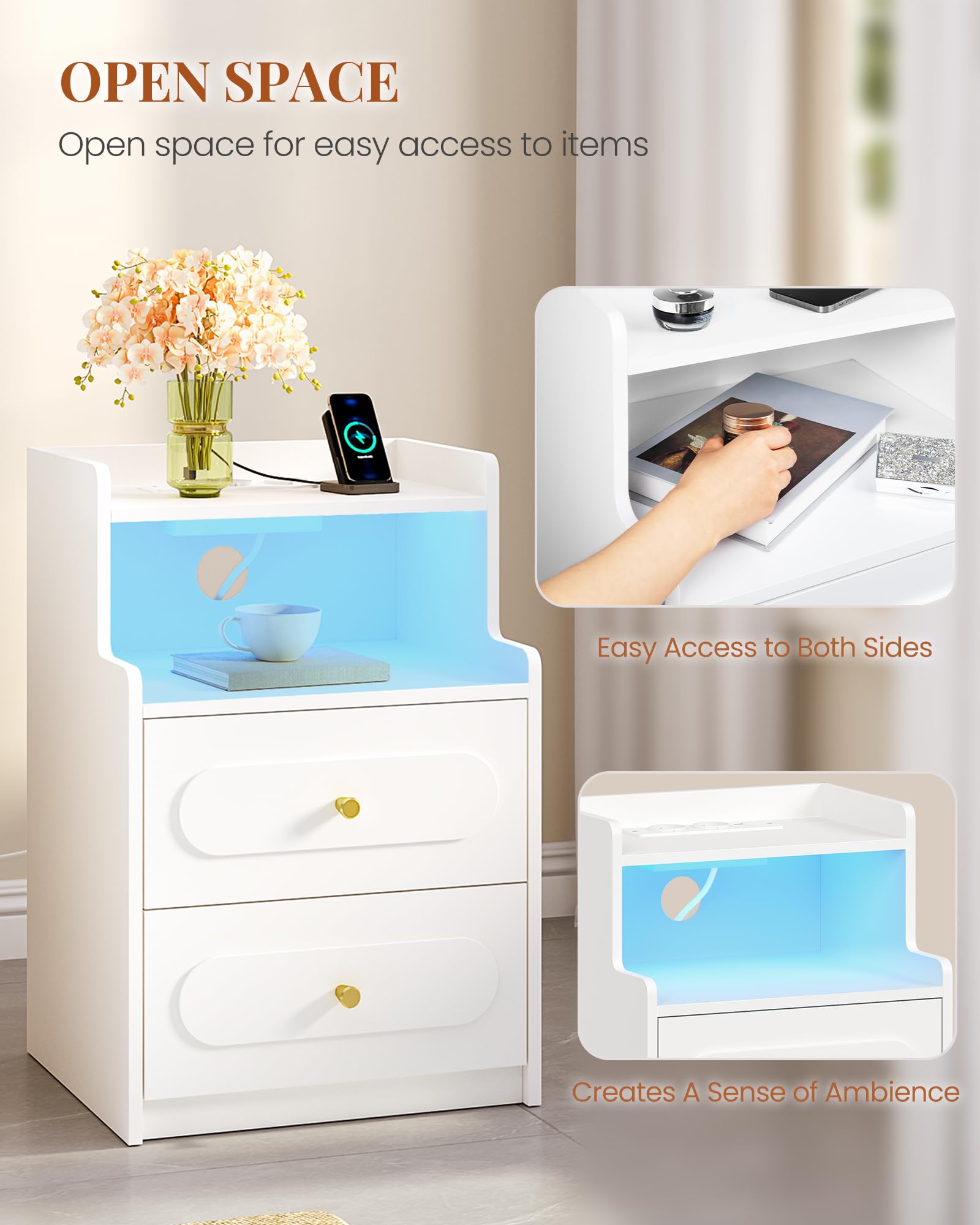 - [Espace de Stockage Pratique]La table de nuit est équipée de deux tiroirs et d'un compartiment ouvert. Les tiroirs permettent de ranger vos effets personnels pour protéger votre intimité, et le compartiment ouvert permet de placer les objets fréquemment utilisés pour y accéder facilement
