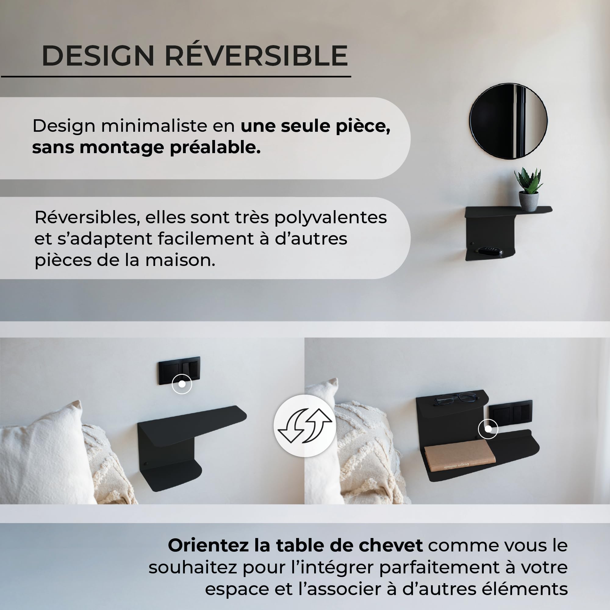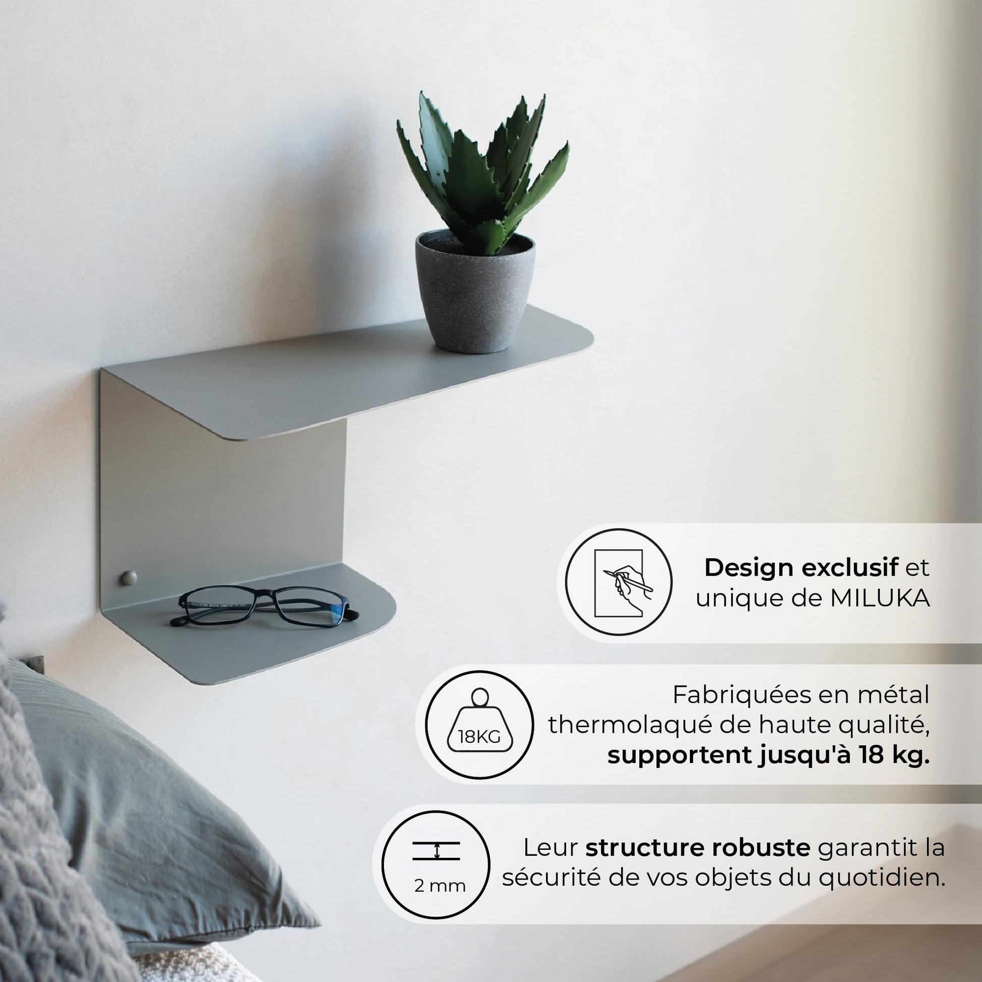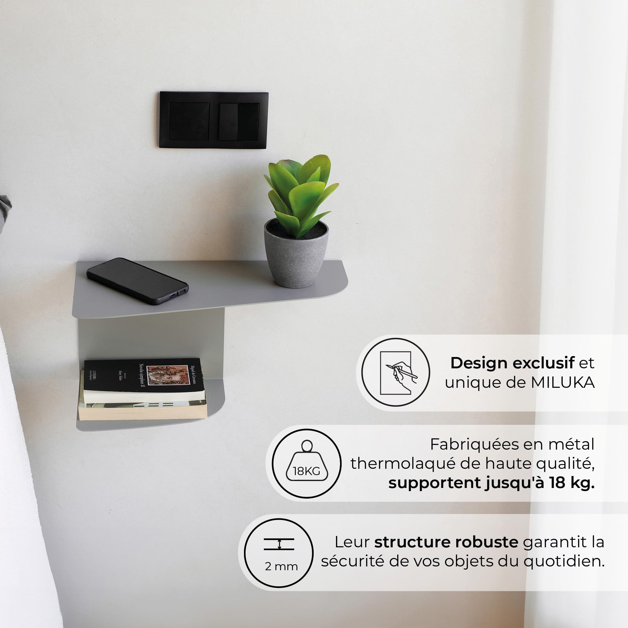 - Robuste et résistant : fabriqué en acier thermolaqué de haute qualité de 2 mm d'épaisseur. Chaque table de chevet flottante supporte 18 kg. Sa finition mate texturée apporte une touche sophistiquée, tandis que la surface anti-traces permet un entretien facile et prolongé