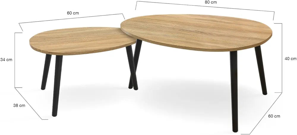 Apportez une note contemporaine à votre séjour grâce à ce lot de 2 tables basses gigognes bois et noir et leur design, d'inspiration nordique à la fois ultra-tendance, simple et sophistiqué.À la fois pratiques et jolies, libre à vous d'agencer ces tables basses gigognes de la manière dont vous le souhaitez pour créer l'intérieur qui vous ressemble. Elément déco ou tables de rangement pour vos magazines, télécommandes ou petites plantes d'intérieur, chacune aura son utilité ! Idéales pour vos soirées télé ou apéritifs entre amis, vous pourrez également les placer facilement les unes sous les autres pour un rangement optimal permettant de gagner de l'espace !Véritables éléments de décoration, les tables basses gigognes apporteront un certain cachet à votre intérieur. Grâce à leur forme ovale et à leurs pieds en bois solides, ces tables de salon donneront un côté chaleureux à votre pièce de vie.Que votre espace salon soit plus petit ou très spacieux, ces deux tables basses GAIA y trouveront forcément leur place. À utiliser seules ou bien par 2, créez une atmosphère cocooning à petit prix grâce à ce lot au style scandinave !Dimensions des 2 tables basses gigognes GAIA bois et noirDimensions de la grande table basse : Longueur 80 cm x largeur 60 cm x Hauteur 40 cmDimensions de la petite table basse: L. 60 x l. 38 x H. 34 cmMatériaux : MDF et pieds en boisColoris : Bois et noirÀ monter soi-mêmeRetrouvez l'ensemble de notre collection scandinave sur notre boutique en ligne.
