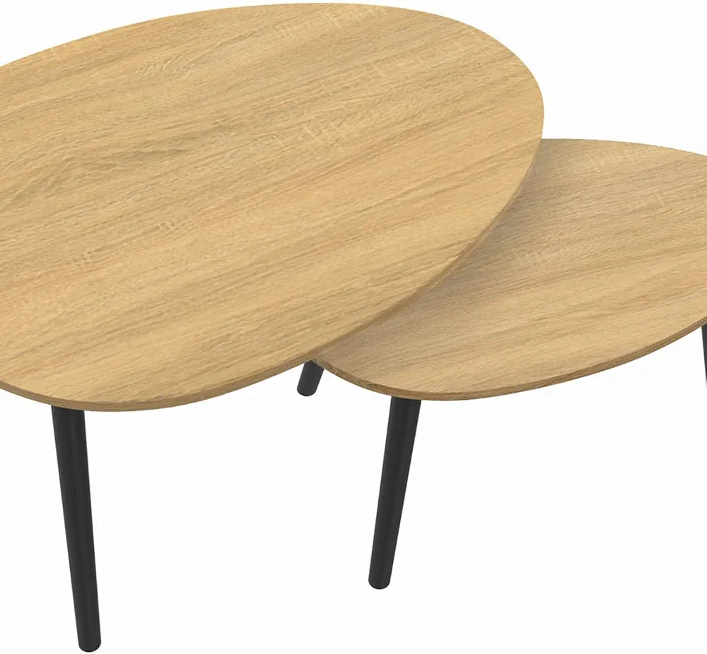 - Adoptez ce lot de 2 tables basses gigognes ovales plateau coloris bois et pieds noirs !