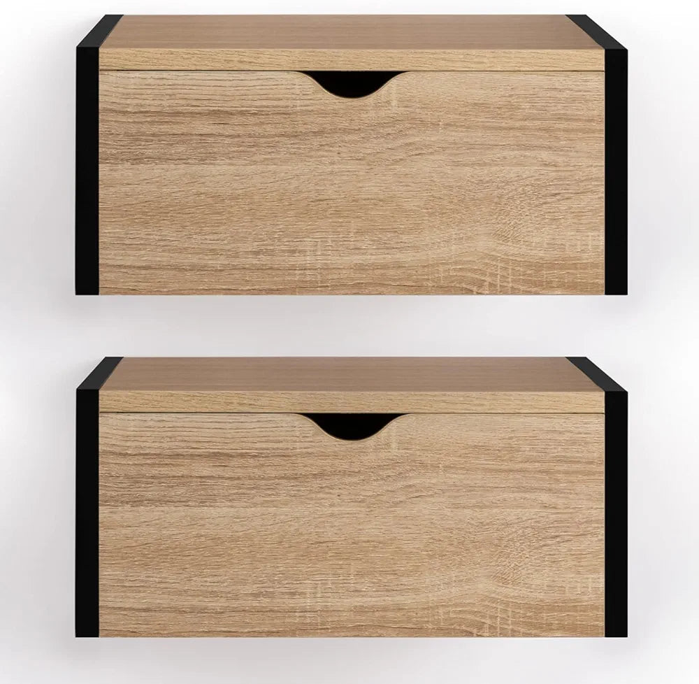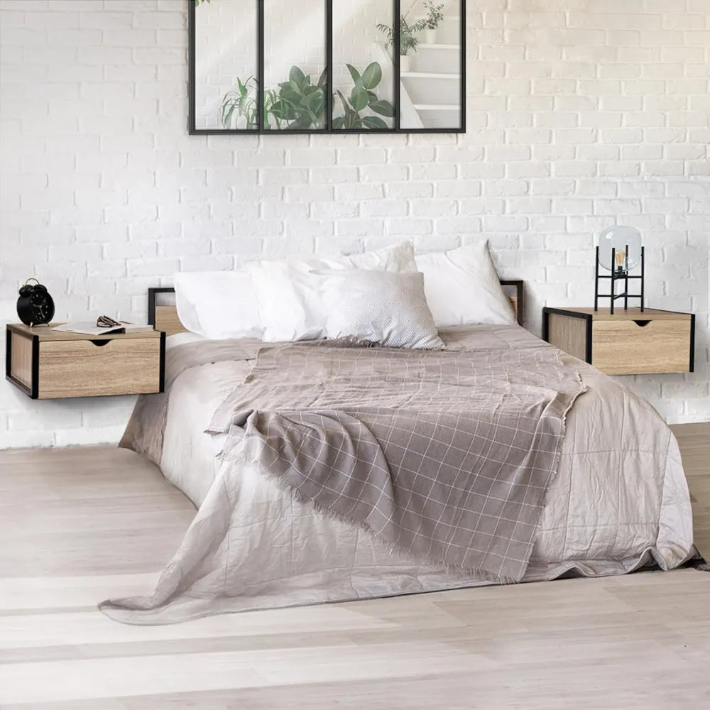 Ce lot de 2 tables de chevet DETROIT, au style industriel, s'accordera parfaitement à la décoration de votre chambre à coucher grâce à son design élégant et moderne. Le mélange du bois et du métal noir habillera votre intérieur sans aucun doute et deviendra un élément de décoration à part entière.Ces tables de chevet suspendues sont à la fois un élément design dans votre chambre à coucher mais également un gain de place pour organiser au mieux votre espace, tout en facilitant le nettoyage et la mobilité autour. Le lot de 2 tables de chevet DETROIT offre un espace de rangement suffisant grâce à ses 2 tiroirs dans lesquels vous pourrez ranger vos affaires personnelles, tout en les ayant à portée de main lorsque vous êtes dans votre lit. Grâce à leurs plateaux, vous pourrez installer votre lampe de chevet, réveil, ou tout autre objet de décoration.Idéal pour les petits espaces, les tables de chevet trouveront leur place dans votre chambre à coucher et apporteront chic et modernité. Stable et robuste, ce lot de tables de chevet pourra être installé facilement à la hauteur que vous souhaitez grâce au kit de fixations murales fourni.Dimensions du lot de 2 tables de chevet DETROIT à suspendre Dimensions globales : Longueur 40 cm x largeur 30 cm x Hauteur 18 cmDimensions façade tiroir : L. 36,5 x H 16 cm Dimensions intérieures tiroir : L. 31 x l. 19 x H. 9 cmMatériaux : PB 15 + 12 mm / Tubes métal 16 x 16 mmAttaches murales pour suspendre aux mursColoris : bois / noirDécouvrez aussi nos autres modèles de tables de chevet et notre sélection de meubles pour la chambre de la collection DETROIT :- Lot de 2 tables de chevet DETROIT 2 tiroirs design industriel- Tête de lit DETROIT 145 CM design industriel- Tête de lit DETROIT 165 CM design industrielRetrouvez également toute la collection de meubles industriels sur notre boutique en ligne !