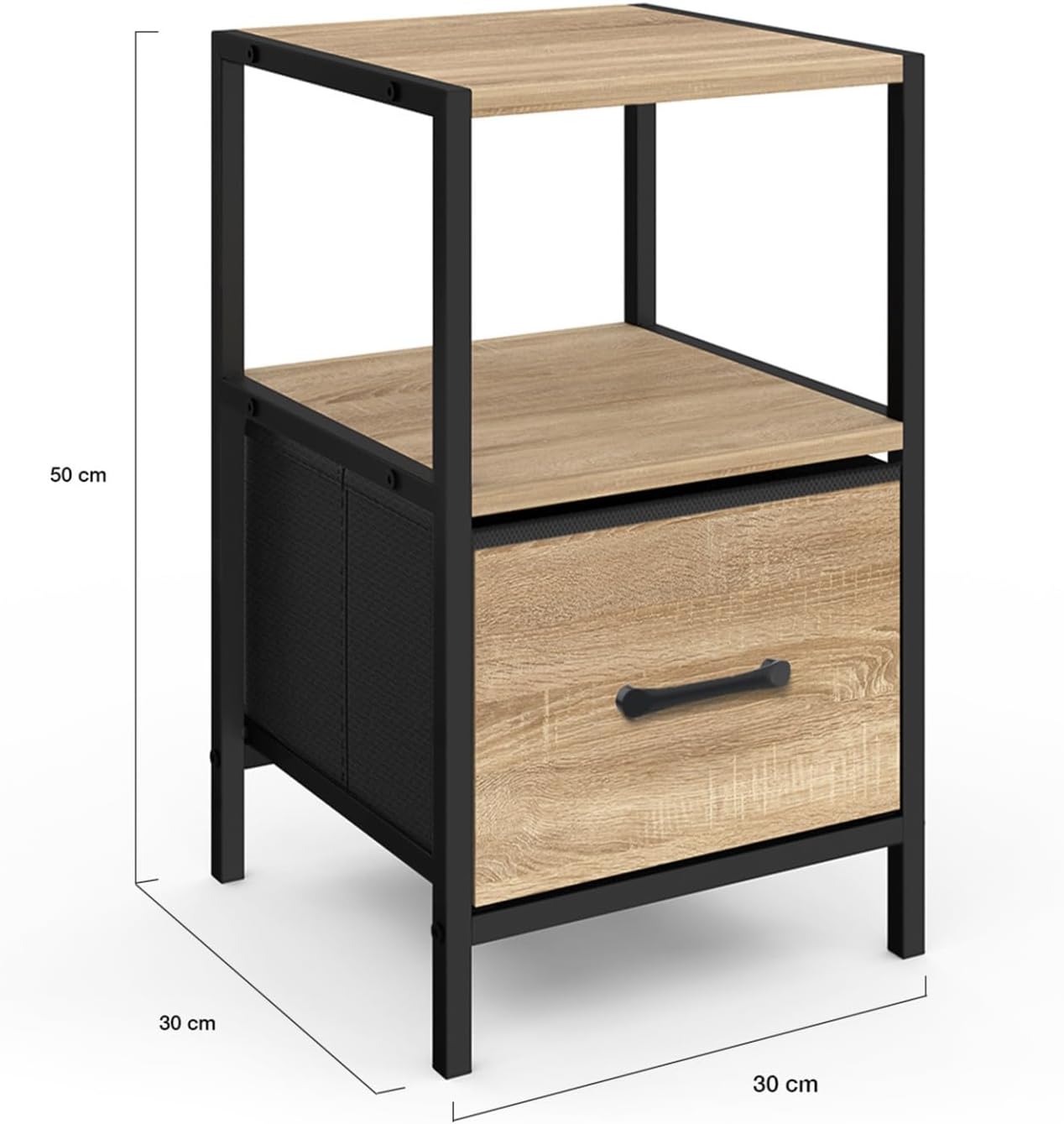 Besoin d'un lot de 2 tables de chevet pour aménager votre chambre à coucher ? Pensez aux 2 tables de chevet UTAH dotées d'un tiroir bi-matière et d'une tablette de rangement.Ultra pratique, chacune des tables de chevet dispose d'un bac en tissu avec une façade en effet bois ainsi qu'une tablette de rangement pour stocker vos affaires. Les 2 grands tiroirs fermés permettront d'organiser votre rangement et de cacher vos affaires personnelles en toute discrétion, pour une chambre dégagée et ordonnée en toutes circonstances.De plus, utilisez leur niche et leurs plateaux pour disposer votre décoration : bougie, cadre photo, réveil, lampe de chevet...Grâce à leur structure métallique, leurs 4 pieds en métal, leur bac en tissu et leurs panneaux en particules de bois de 1,5 cm d'épaisseur, ces tables de chevet vous assureront une stabilité parfaite.Ce lot de 2 tables de chevet trouvera facilement sa place dans votre chambre à coucher, tout en lui apportant du style grâce à son look très industriel. Multifonction, les tables de chevet 30 x 30 cm peuvent tout à fait servir de meubles d'appoint dans une autre pièce, comme un bureau ou un salon par exemple.Pour une totale harmonie dans votre chambre à coucher, optez pour une association commode et chiffonnier UTAH pour un design assuré ! Dimensions du lot de 2 tables de chevet UTAHDimensions globales : Longueur 30 cm x largeur 30 cm x Hauteur 50 cmDimensions intérieures d'un tiroir : L. 26 x l. 29 x H. 18.5 cmDimensions façade d'un tiroir : L. 26.5 x H. 19 cmDimensions étagère : L. 27 l. 30 x H. 18.5 cmDimensions des poignées : L. 10 x l. 2 cmHauteur des pieds : 7 cmTiroirs en fibre non tissée et façades en particules de bois (PB)Coloris : Bois et noirÀ monter soi-mêmeRetrouvez toute la collection de meubles industriels sur notre boutique en ligne !