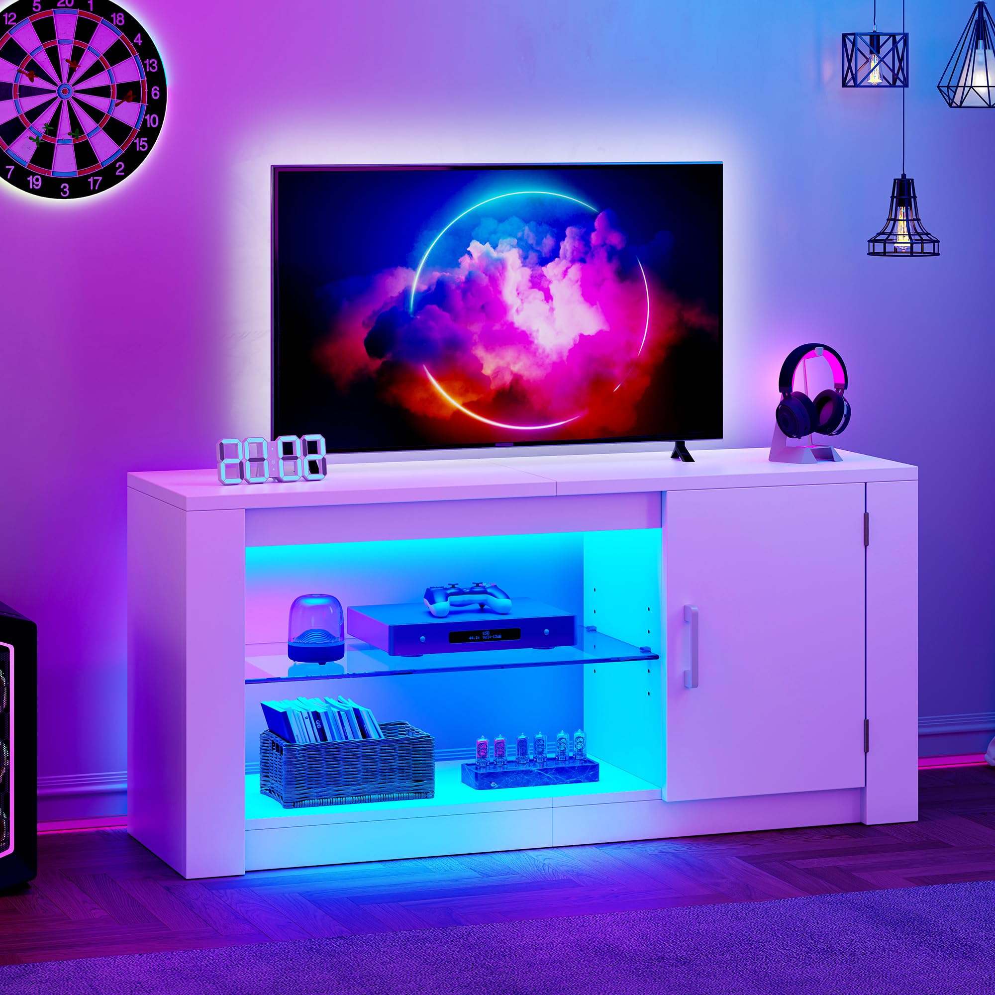 | Composants inclus | Meuble TV avec étagère en verre, banc de télévision, Table TV - Étagère en verre - Étagères réglables et armoires de rangement, Lumières LED Lumières d'ambiance, Étagère de rangement ouverte Voir plus |