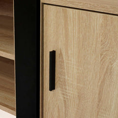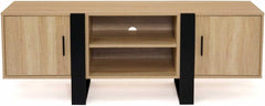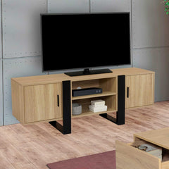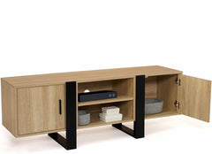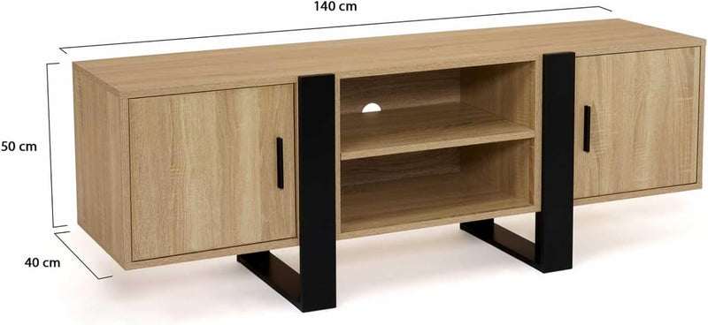Do you like to spend good times with family or friends? The Phoenix XL wood and black TV stand is made for you! Thanks to its large 140 cm long tray, you can spend pleasant movie nights or TV plates. Its structure with a solid appearance is ideal for a cozy living room. The combination of the black legs and the wooden structure gives a bi-material effect that brings modernity and trend to your interior. Beyond its authentic and robust side, its generous proportions make it a functional TV stand but also elegant with its simple, symmetrical shapes and its natural colours that will easily adapt to your living room. Practical, thanks to its 2 cupboards and 2 central shelves, leave the top free for receive your flat screen up to 60 inches. Its rectangular format is functional with the depth of the tray of 40 cm, for maximum capacity. Its multiple storage compartments are specially designed to accommodate your media equipment such as box and other Blu-ray and DVD players, small decorative objects and remote controls so you don't have to look for them and leave nothing lying around. With its wide legs connected to each other for better stability, this ultra design TV cabinet offers strength and quality to accommodate your hi-fi equipment. Don't wait any longer to take advantage of its irresistible price and benefit from an XL TV cabinet with maximum storage capacity. Warm atmosphere guaranteed. Dimensions of the Phoenix XL TV stand 2 doors 2 shelves 140 cm. Overall dimensions: length 140 cm x width 40 cm x height 50 cm. Door dimensions: L. 35 x W. 40 x H. 33 cm. Dimensions of the central shelves: L. 47 x W. 40 x H. 16 cm. Leg size: L. 7.5 x W. 1.5 x H. 50 cm. Materials: particle wood (PB) melamine. Thickness: 1.5 cm. Self-assembly. Other TV units are also available in this collection:- Phoenix TV stand