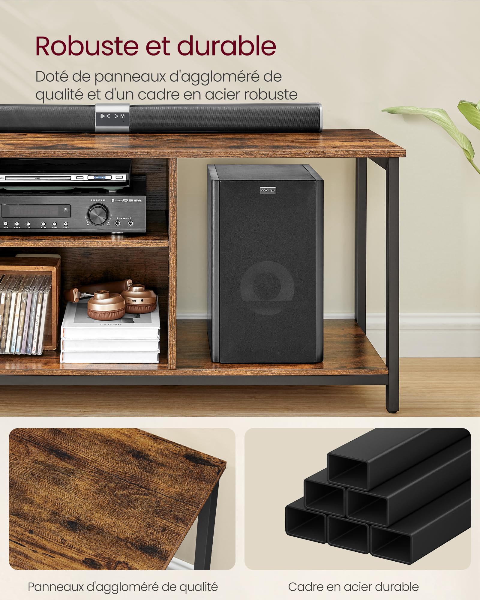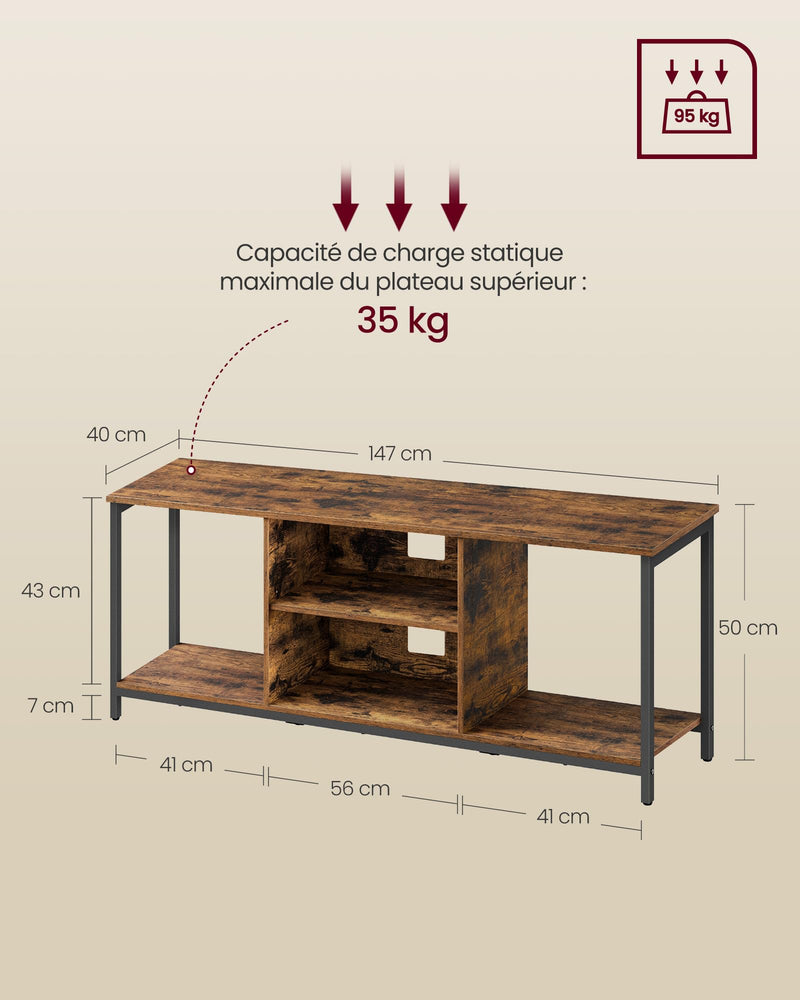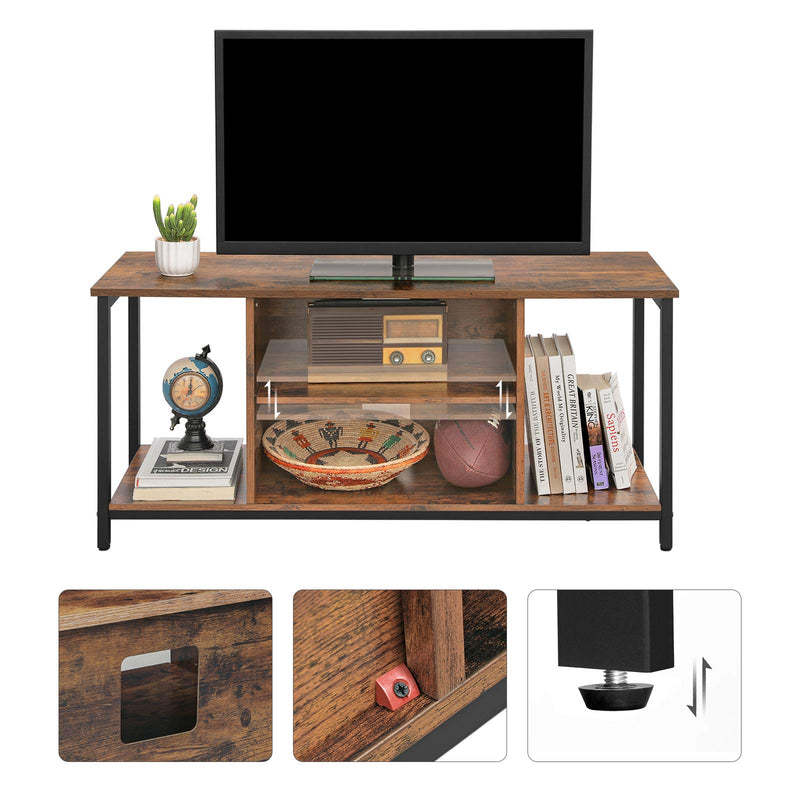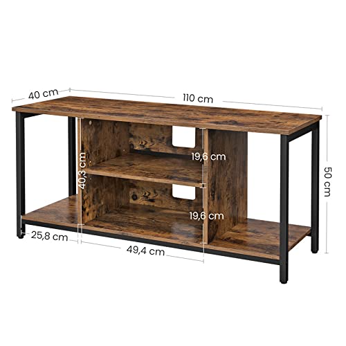 - What you get: a 120 x 40 x 50 cm TV stand capable of both accommodating TVs up to 140 cm (55 inches) and adding a touch of style to your room with the unique industrial style of the ALINRU collection from VASAGLE.