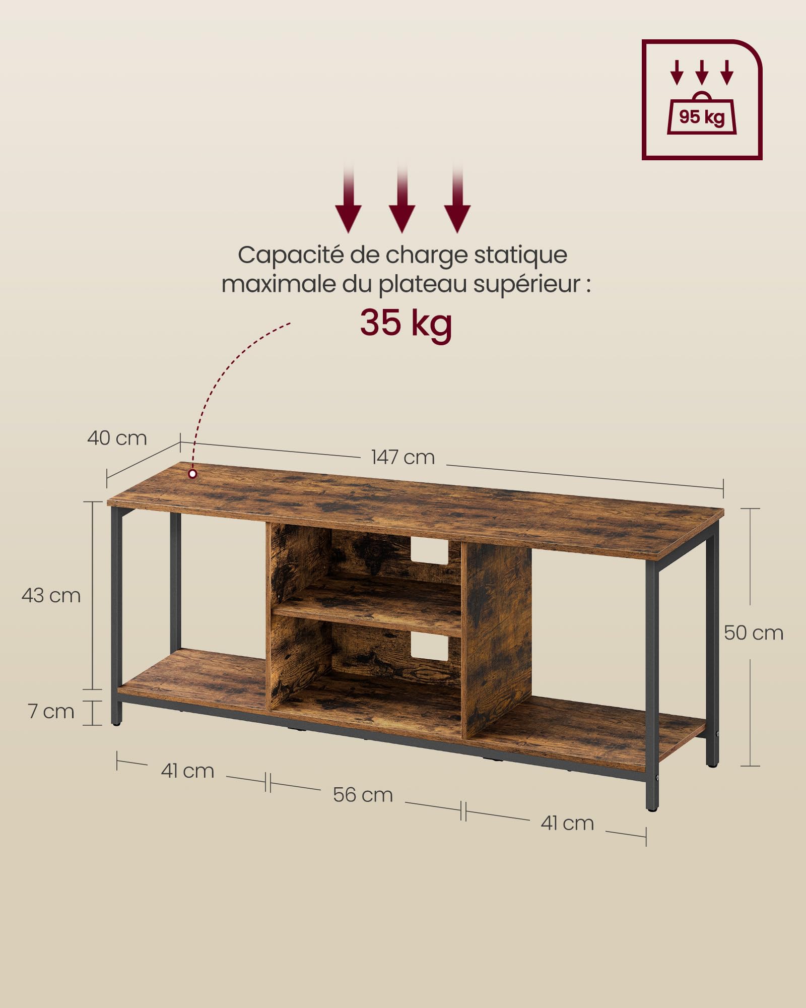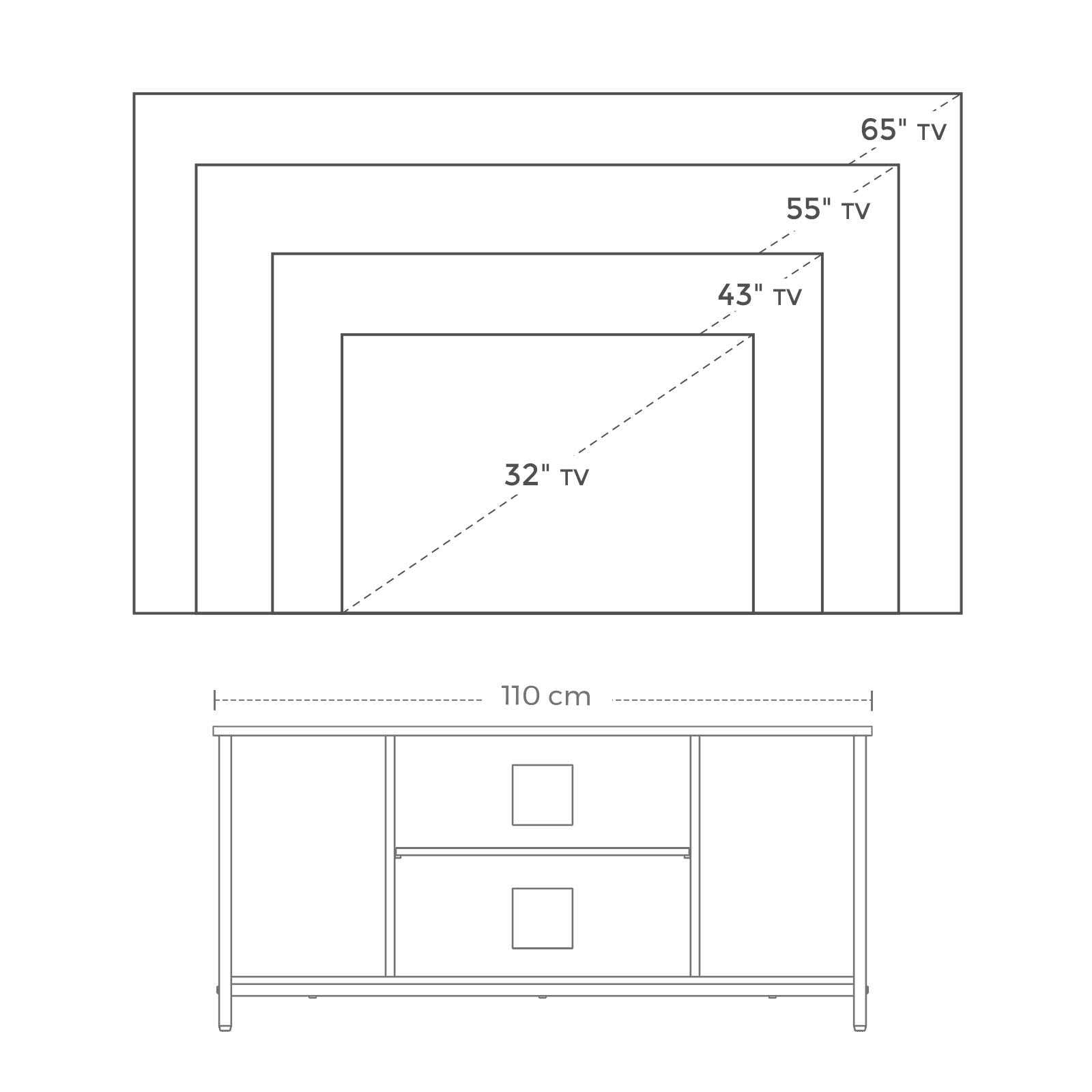 - Are you curious about its stability? Your TV up to 140 cm (55 inches) will be in good hands on the table top that can hold up to 40 kg, thanks to the sturdy particle board and steel frame. Adjustable feet for stability.
