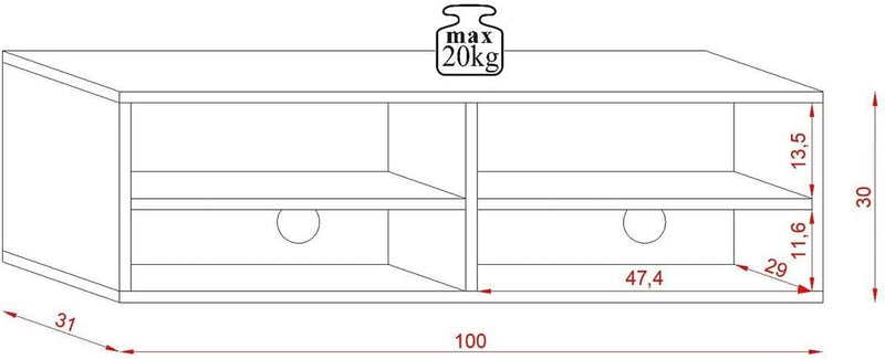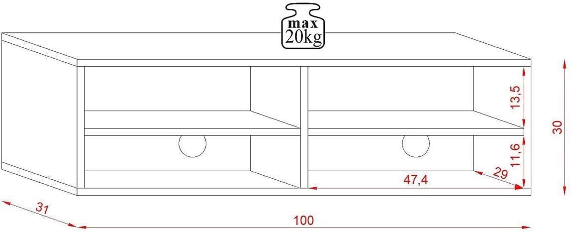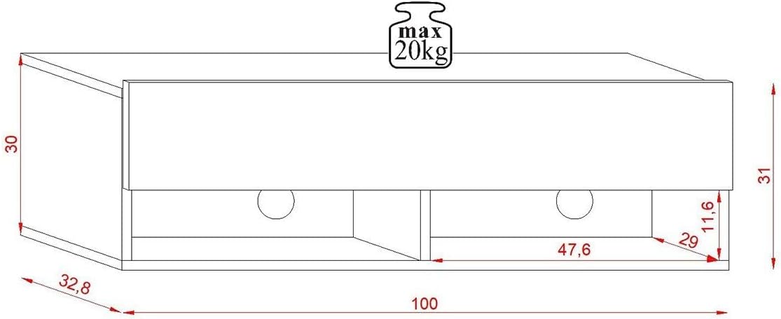 - Le poids maximal supporté par ce meuble suspendu est 20 kg. Veuillez vérifier le poids de votre TV avant de la poser sur ce meuble.
