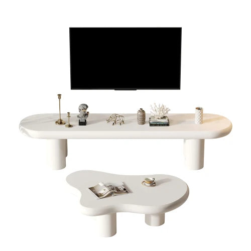 Modern aesthetics brighten your home: pure white tones + smooth lines, the TV table is simple and versatile; The irregular shape of the cloud table breaks through the monotony, gives the living room an artistic atmosphere and makes your home stand out immediately.