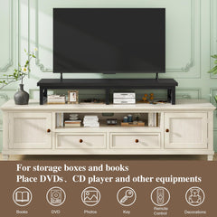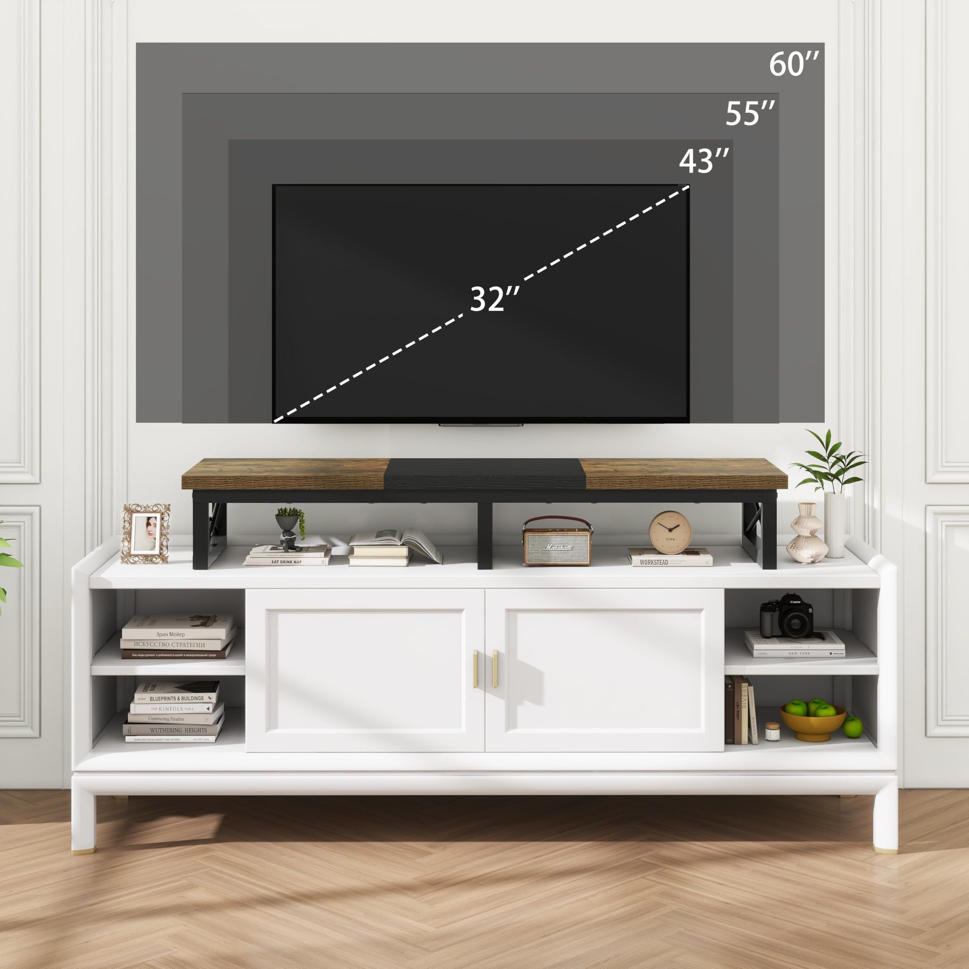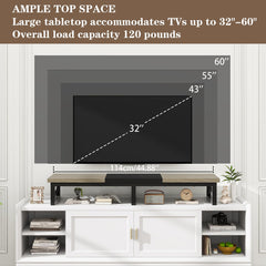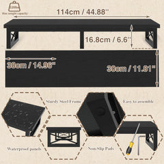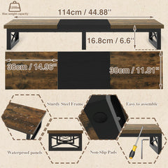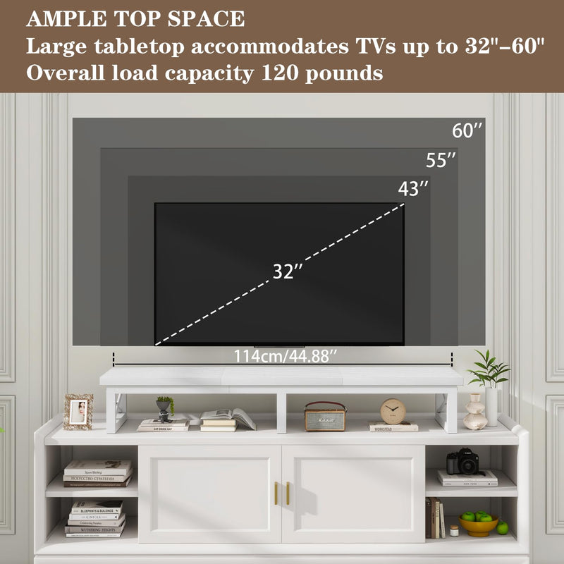 - Large TV cabinet: Dimensions: 114 x 30 x 16.8 cm. Large raised TV stand accommodates your flat or curved TV/monitor (up to 60"), monitor stand for 2 monitors (up to 32"). Ideal for your living room, bedroom, office.