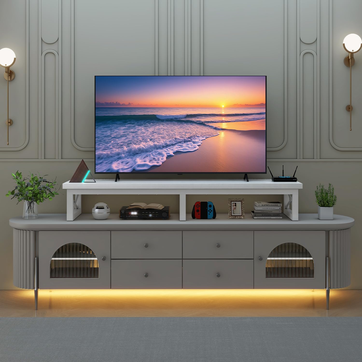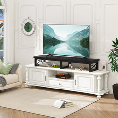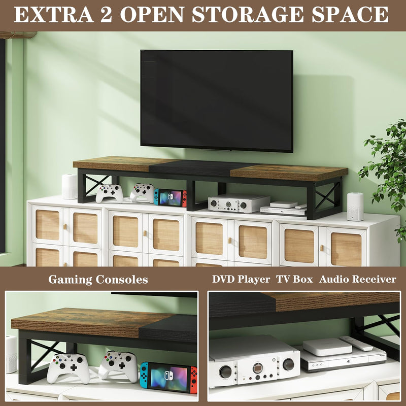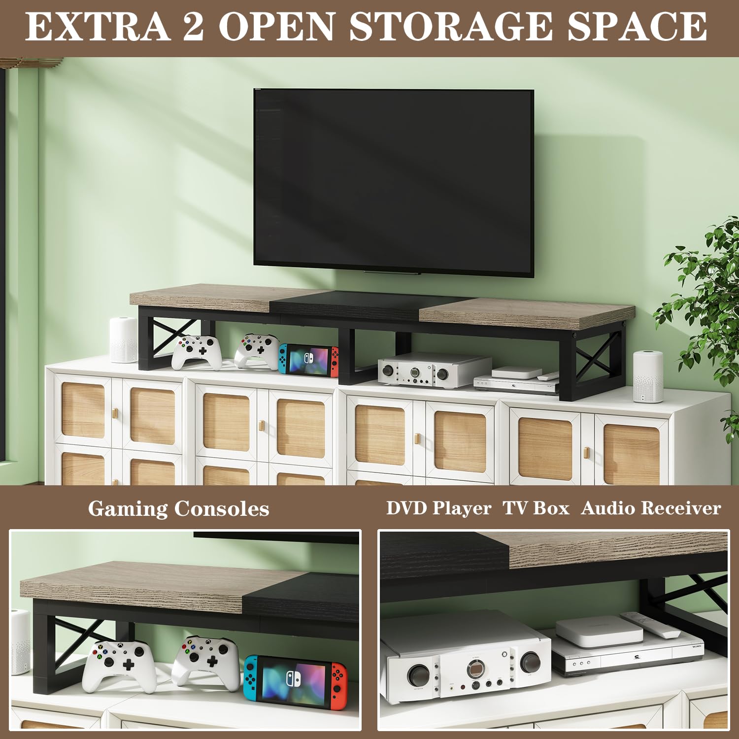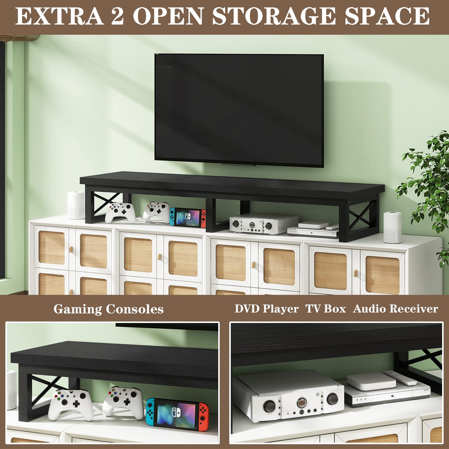 - Enough Storage Space: This tv stand has 2 levels of open shelves, providing enough space to organize and display your soundbar, controllers and cable TV box, satellite receiver, game consoles like PS4, Xbox. Keep your living room tidy and clutter free.